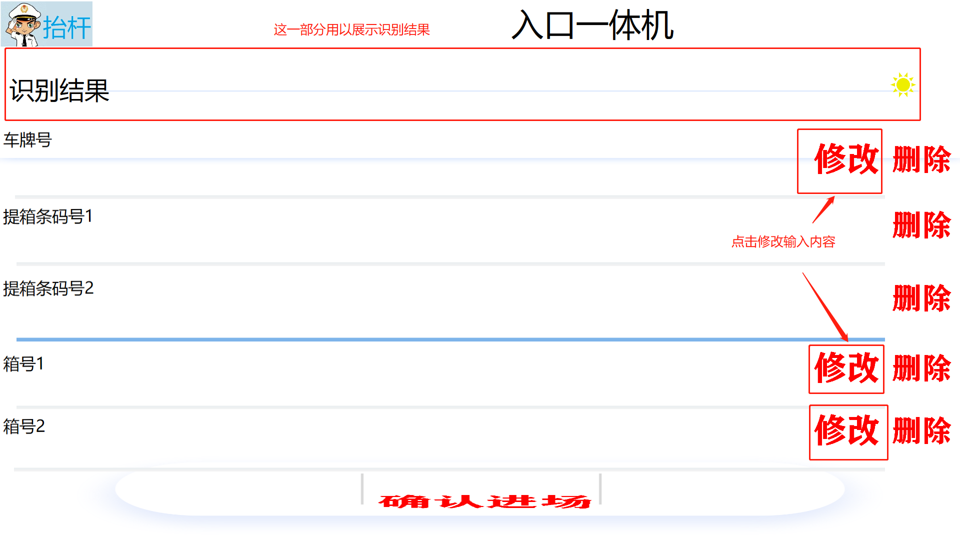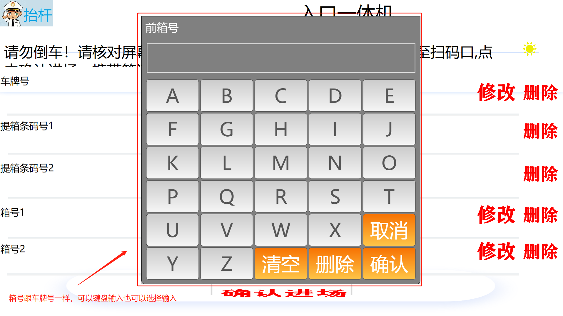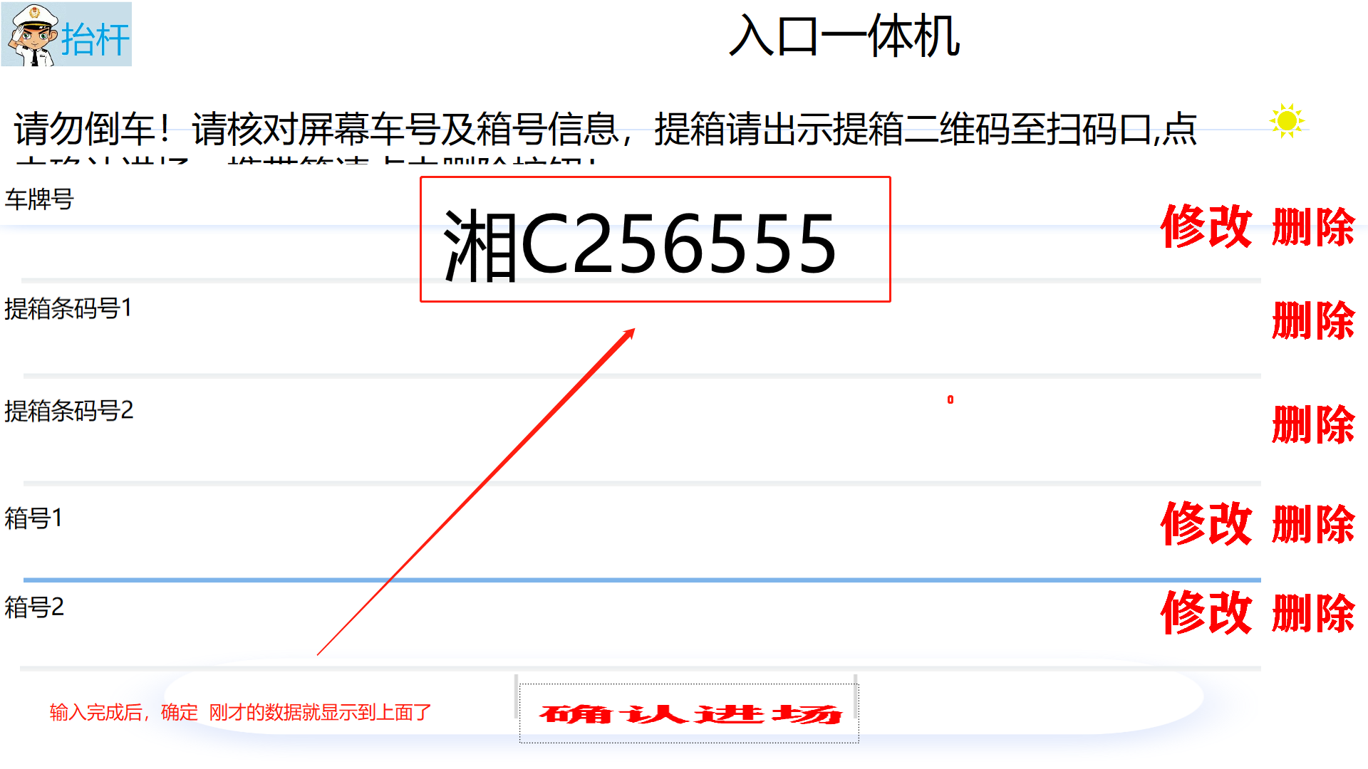 ## 入口一体——还箱 #### 1)、界面介绍   #### 2)、车牌号添加   #### 3)、箱号添加  #### 4)、确认入场    > <span style="font-family:楷体">注:有语音提示 请仔细听 车辆出场去出口一体机车辆出场 </span> ## 入口一体——提箱   > <span style="font-family:楷体"> 输入车牌号 输入条形码 条形码1对应箱号1、条形码2对应箱号2 通过条形码去这个计划,若是出场计划没有指定箱子--那就由系统自动推荐箱子,若有箱子--就直接提走改箱子</span>