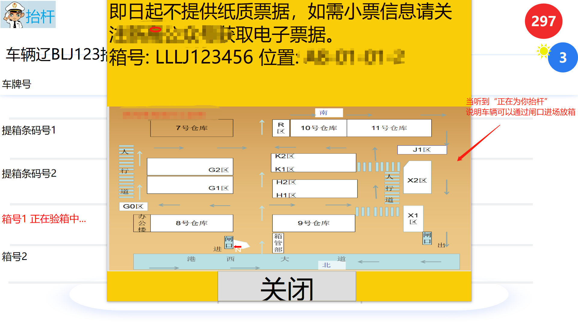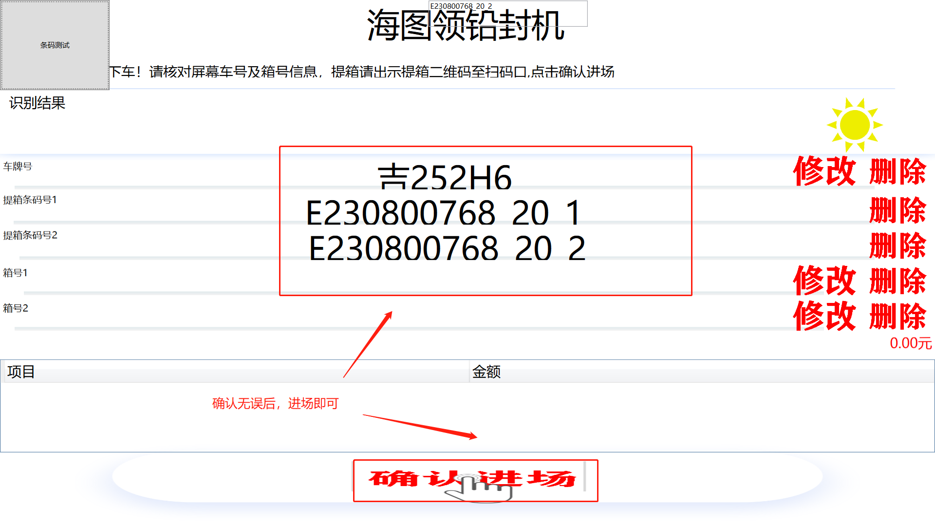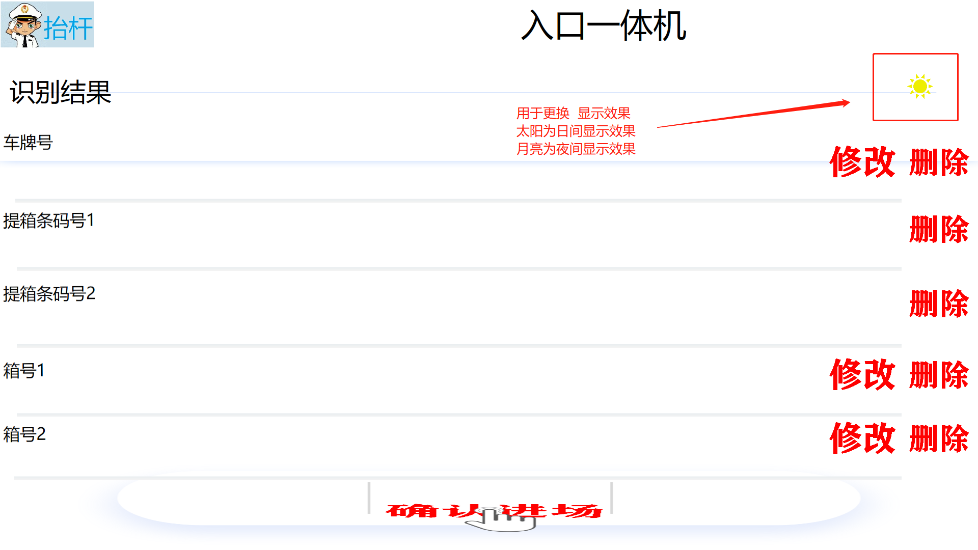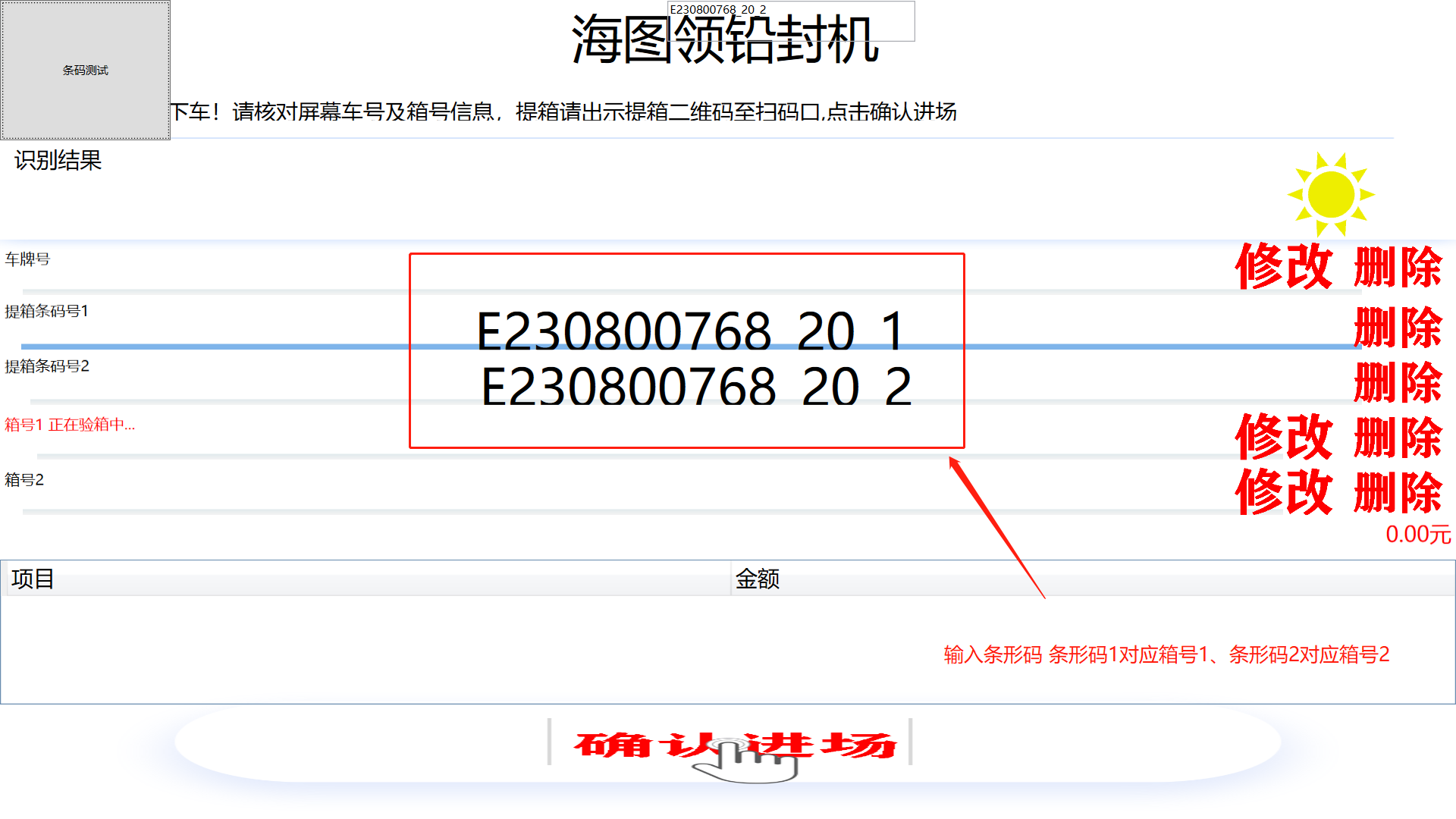 ## 入口一体——还箱 #### 1)、界面介绍   #### 2)、车牌号添加   #### 3)、箱号添加  #### 4)、确认入场    > <span style="font-family:楷体">注:有语音提示 请仔细听 车辆出场去出口一体机车辆出场 </span> ## 入口一体——提箱   > <span style="font-family:楷体"> 输入车牌号 输入条形码 条形码1对应箱号1、条形码2对应箱号2 通过条形码去这个计划,若是出场计划没有指定箱子--那就由系统自动推荐箱子,若有箱子--就直接提走改箱子</span>