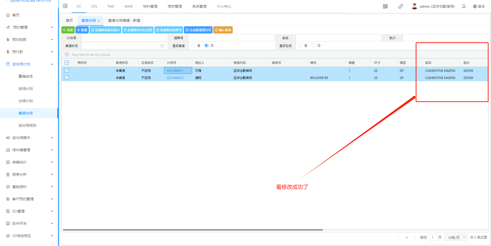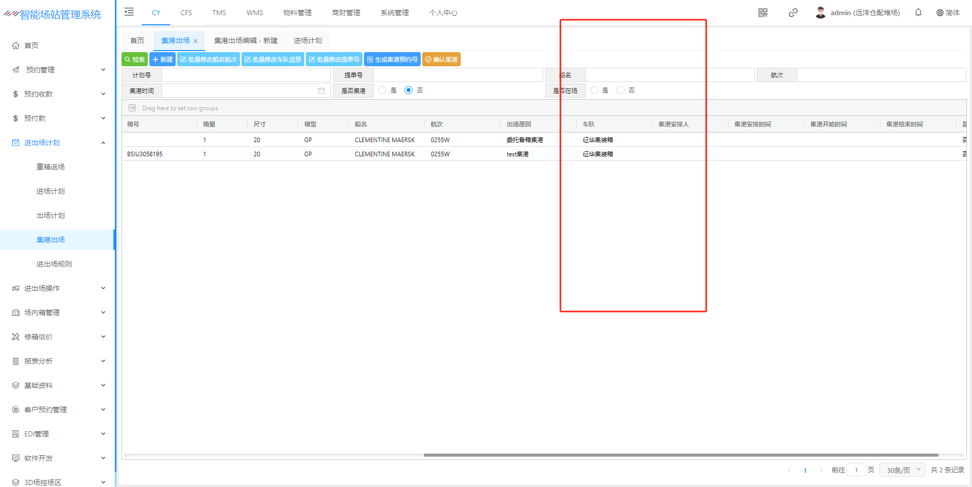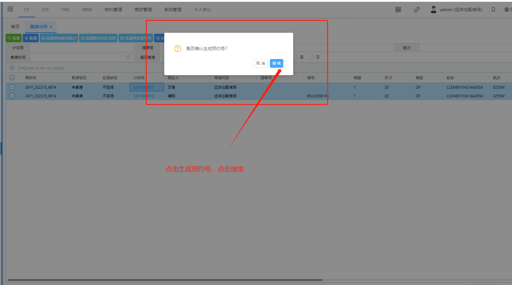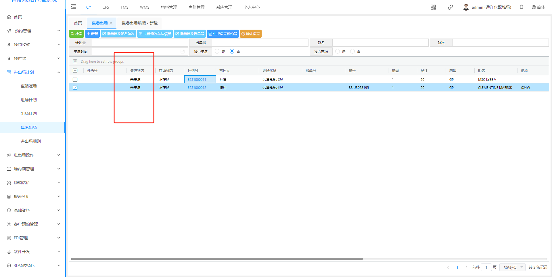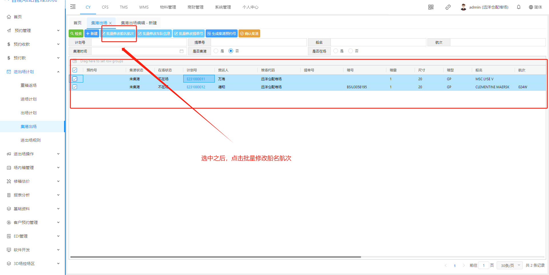 ## 1、新建集港计划页面  > <span style="font-family:楷体">检索:根据条件集港计划 新建:新建集港计划 批量修改船名航次 批量修改车队信息 批量修改提单号 生成集港预约号 确认集港:只有点击确认集港后续才能进场操作提箱 </span> ## 2、新建集港计划信息页面  > <span style="font-family:楷体">注:只有出场计划选择”是否安排集港“ 才会有集港的出场原因</span> ## 3、集港计划状态解释  > <span style="font-family:楷体">新建完成 状态未集港 确认集港 - 登记入场,状态正在集港 出场核销 - 出场操作核销以后,状态已集港</span> ## 4、功能介绍 #### (1)、批量修改船名航次    #### (2)、批量修改车队信息   #### (3)、批量修改提单号  #### (4)、生成集港预约号   ## 二、预约集港流程 出场计划生成之后,在集港预约页面(若是货运角色看不到集港预约界面,联系管理人员进行添加)  在这个页面我们可以根据提单号、计划浩、箱号、船公司进行筛选  查询确认无误之后 点击生成通提码(通提码:选择好计划之后,进行勾选 选择的计划后台就会生成相同的通提码,通提码若是一至,码下的箱子可以进行通提)  点击图中红框圈起的部分可以展示码  查询确认无误之后、生成通提码后、可以点击推送集港预约,推送预约集港之前可以选择要推送的车队/你所选择的那个车队,推送集港之后只有选择的车队看到此条集港信息  推送成功后,集港预约列表底色变为粉红  以下为集港预约界面 业务端推送集港之后,是按照船名航次进去集港分类  选择好箱号后,点击预约集港即可展示调度页面 调度选择车号,可以把此条选择集港信息选择推到司机预约小程序 预约集港页面调度可以进行调度,选择要推送给那台车看到词条预约信息  司机登录小程序