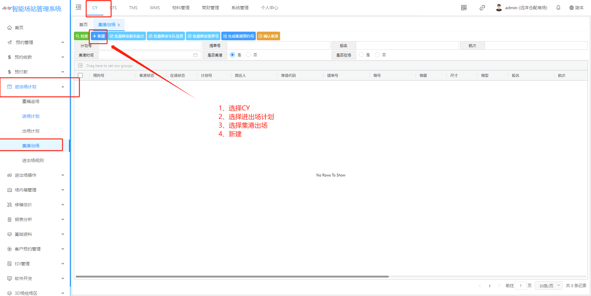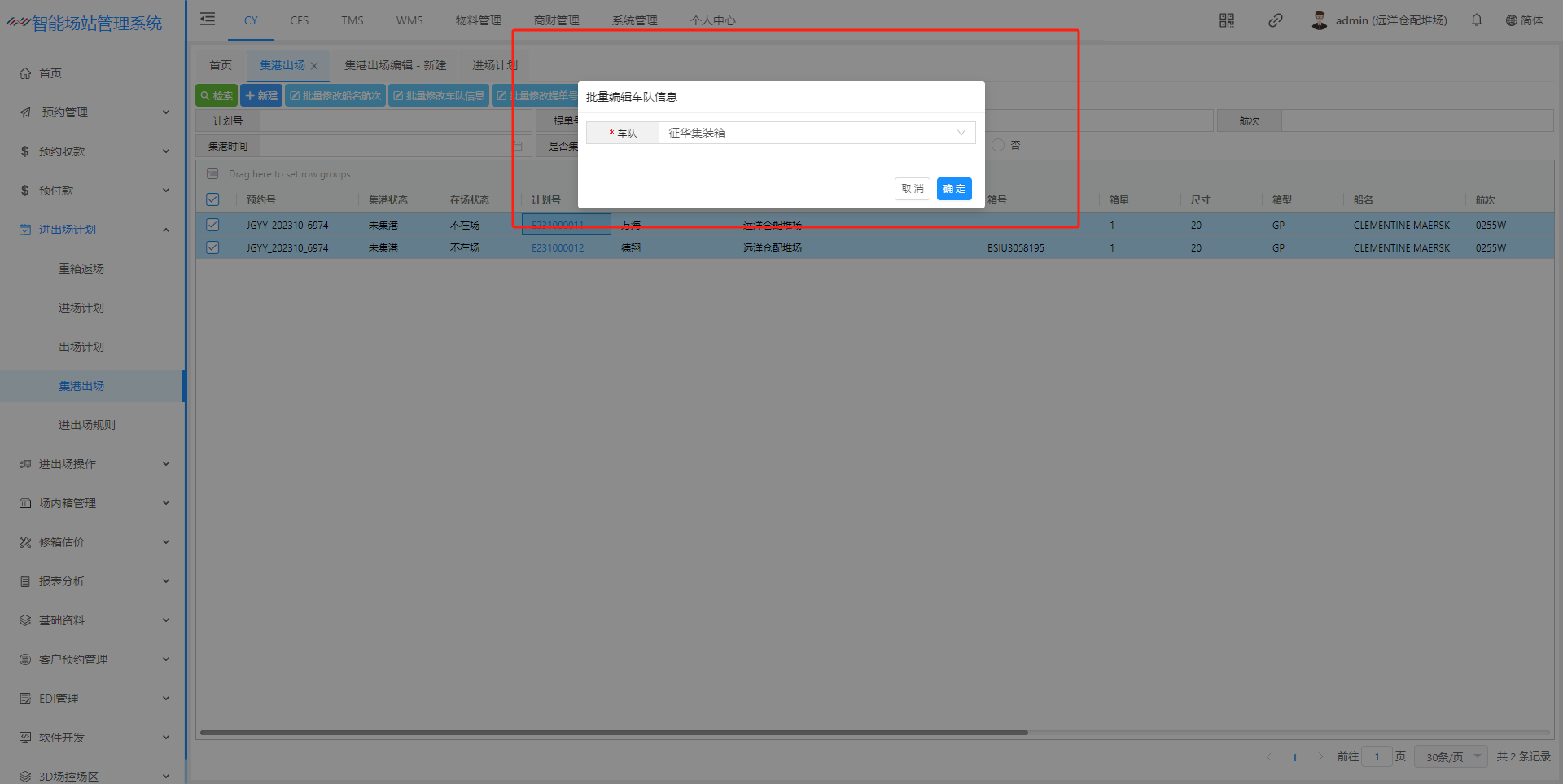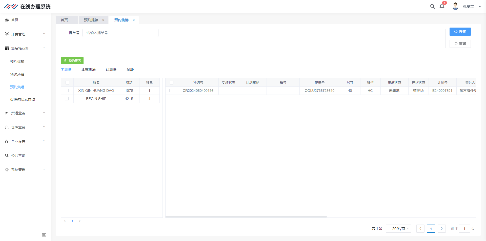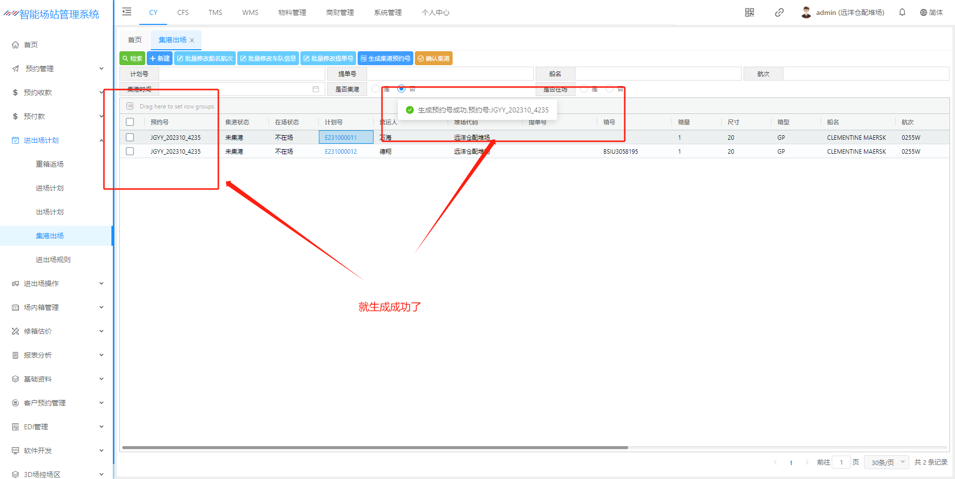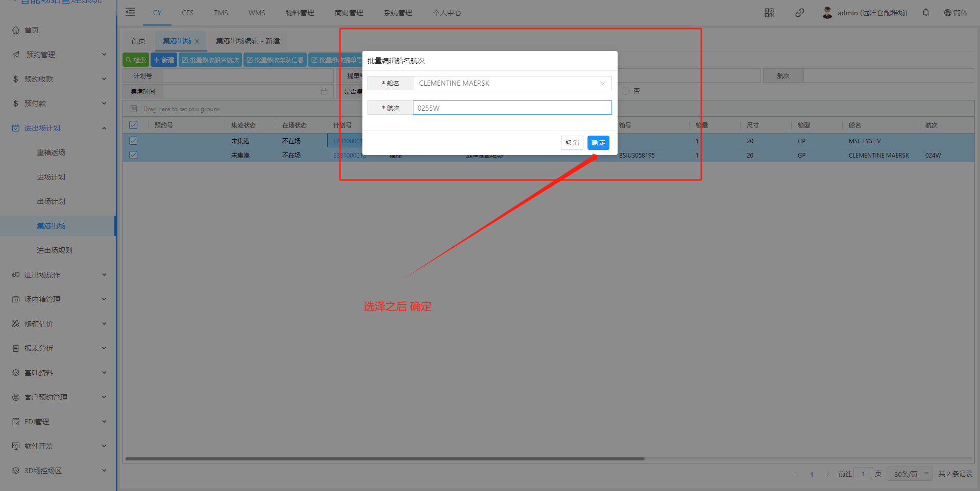 ## 1、新建集港计划页面  > <span style="font-family:楷体">检索:根据条件集港计划 新建:新建集港计划 批量修改船名航次 批量修改车队信息 批量修改提单号 生成集港预约号 确认集港:只有点击确认集港后续才能进场操作提箱 </span> ## 2、新建集港计划信息页面  > <span style="font-family:楷体">注:只有出场计划选择”是否安排集港“ 才会有集港的出场原因</span> ## 3、集港计划状态解释  > <span style="font-family:楷体">新建完成 状态未集港 确认集港 - 登记入场,状态正在集港 出场核销 - 出场操作核销以后,状态已集港</span> ## 4、功能介绍 #### (1)、批量修改船名航次    #### (2)、批量修改车队信息   #### (3)、批量修改提单号  #### (4)、生成集港预约号   ## 二、预约集港流程 出场计划生成之后,在集港预约页面(若是货运角色看不到集港预约界面,联系管理人员进行添加)  在这个页面我们可以根据提单号、计划浩、箱号、船公司进行筛选  查询确认无误之后 点击生成通提码(通提码:选择好计划之后,进行勾选 选择的计划后台就会生成相同的通提码,通提码若是一至,码下的箱子可以进行通提)  点击图中红框圈起的部分可以展示码  查询确认无误之后、生成通提码后、可以点击推送集港预约,推送预约集港之前可以选择要推送的车队/你所选择的那个车队,推送集港之后只有选择的车队看到此条集港信息  推送成功后,集港预约列表底色变为粉红  以下为集港预约界面 业务端推送集港之后,是按照船名航次进去集港分类  选择好箱号后,点击预约集港即可展示调度页面 调度选择车号,可以把此条选择集港信息选择推到司机预约小程序 预约集港页面调度可以进行调度,选择要推送给那台车看到词条预约信息  司机登录小程序