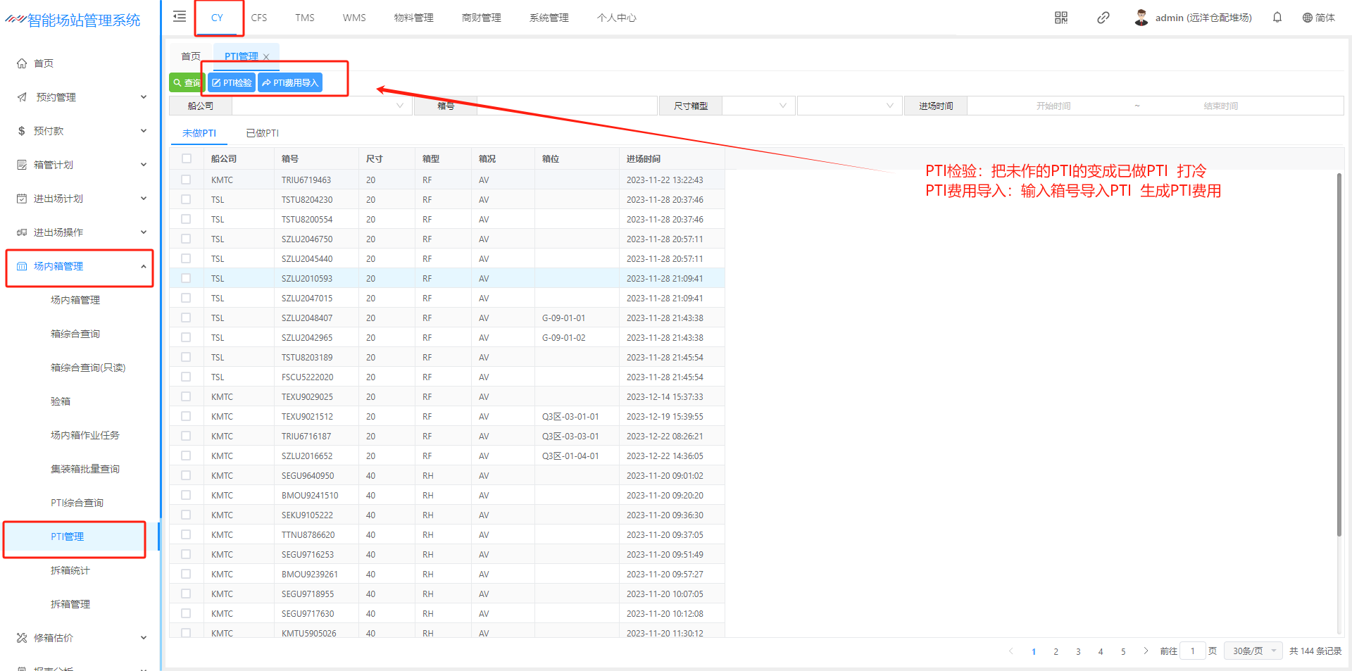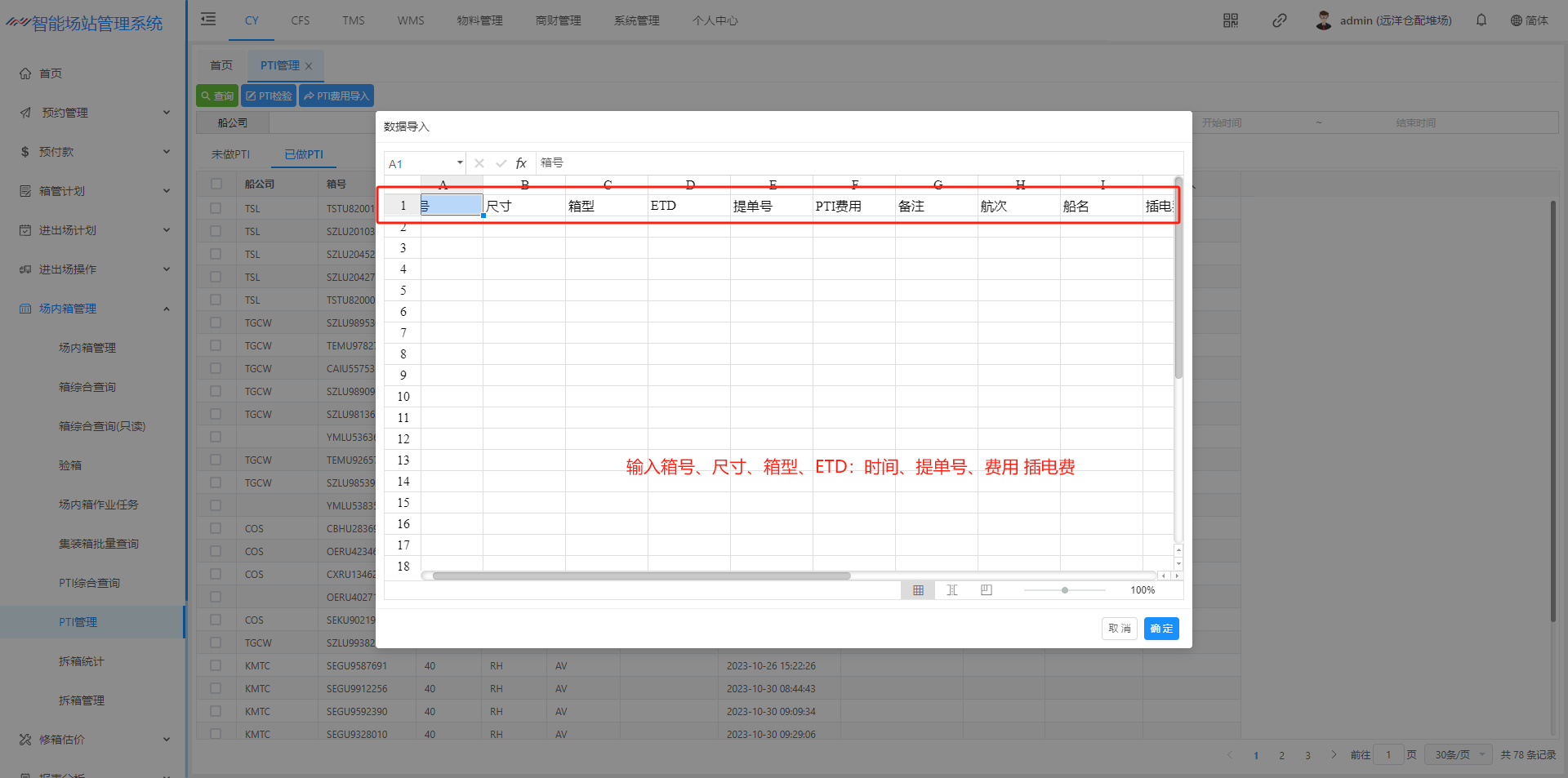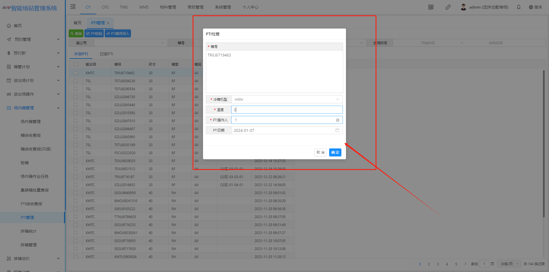 ## 功能介绍: PTI检验:把未作的PTI的变成已做PTI 打冷 PTI费用导入:输入箱号导入PTI 生成PTI费用  ## 操作流程: #### 1、PTI检验: 1)、输入箱号、选择冷箱机型、填写温度、确认无误后点击确认  #### 2、PTI费用导入: 1)、输入箱号、尺寸、箱型、ETD:时间、提单号、费用 插电费;确认无误后点击确认