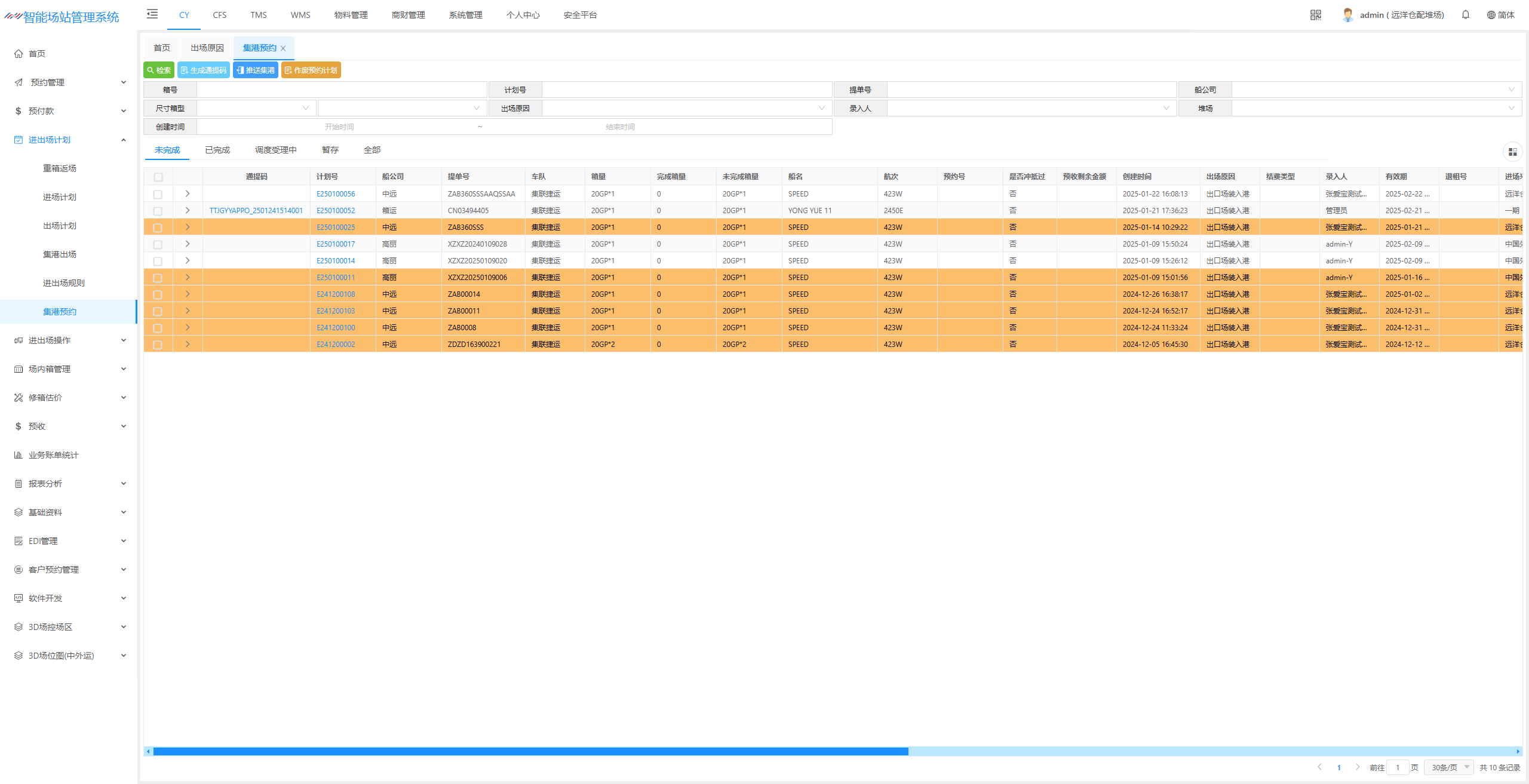 集港预约是 集装箱集港之前,将集港信息推送到预约平台【预约集港】页面中车队可进行调度,调度具体或者车队下全部车受理箱号安排集港 该页面主要用于推送车队集港信息 ,带有黄色底色的为计划过期 数据来源:【出场原因】中维护【是否安排集港】为是原因,当出场计划生成时判断原因是否安排集港为“是”,“是”的数据便能查询到  界面展示  选择要集港的数据点击生成【通提码】 通提码:生成系统条码号,一个通提码下的集装箱可以随便选择  生成通提码之后,点击推送集港选择车队选择那个车队,那个车队便能在预约系统看到推送的集港信息  作废预约集装箱:在没有推送之前可以将箱号作废,作废的箱号无法推送预约车队 锁定:推送之前锁定,锁定之后不推送预约车队 解锁:解锁集装箱2025-01-25 11:23:43 星期六 .