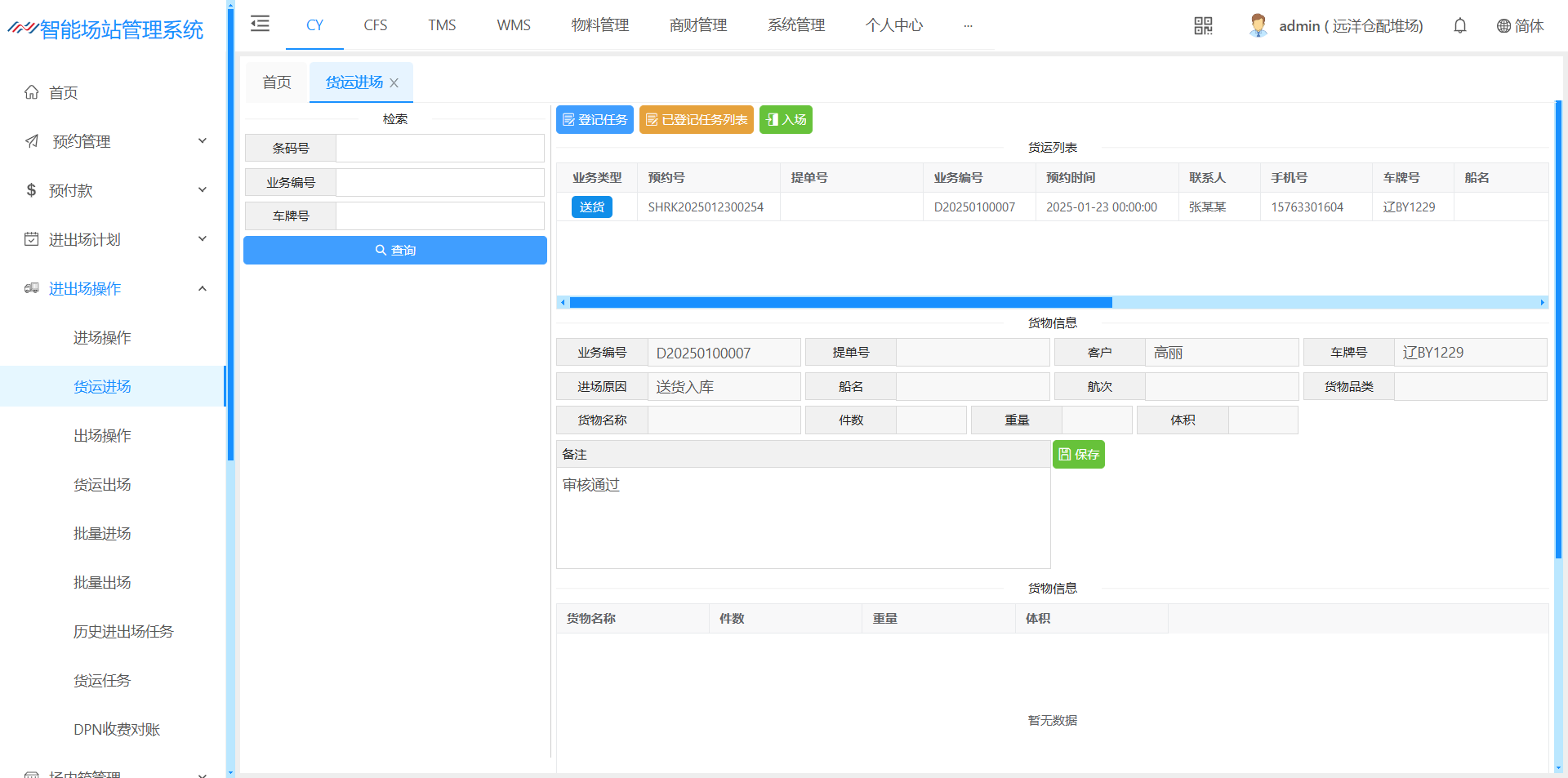 货运进场该页面主要用于司机预约进场送货/提货,预约完成后,可以货运进场操作办单进场登记入场,货运入场之后理货端可以看到司机进场记录 在左边【检索】项目数据 司机预约的二维码信息、委托的业务编号、提送货司机的车号信息 点击检索查询出提送货详细信息,点击登录任务可以进行登记、登记之后点击入场视为提送货司机进场 登记任务:登录提送货司机信息 已登记任务列表:查看已经登记未进场的提送货信息 入场:登录司机信息 入场之后理货端可以查询到司机进场车号,货运进场可有提送货一体机进场登录待提