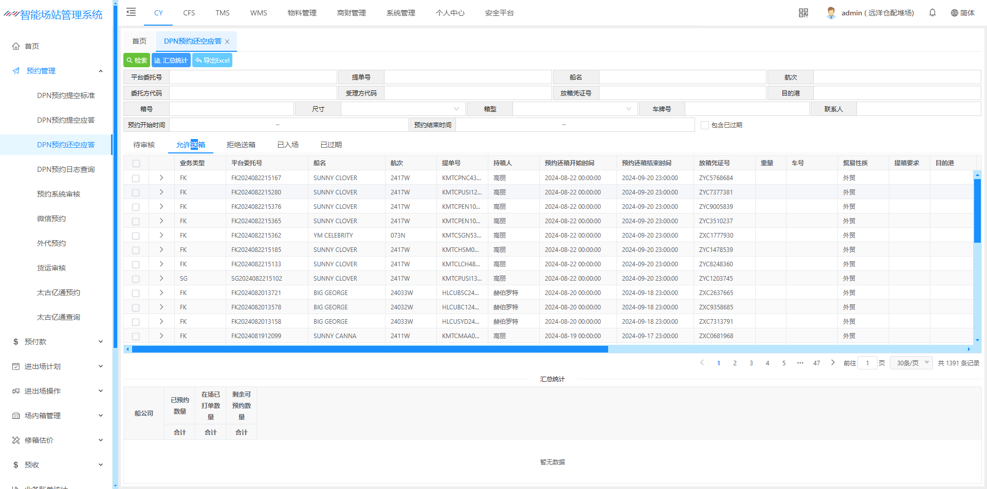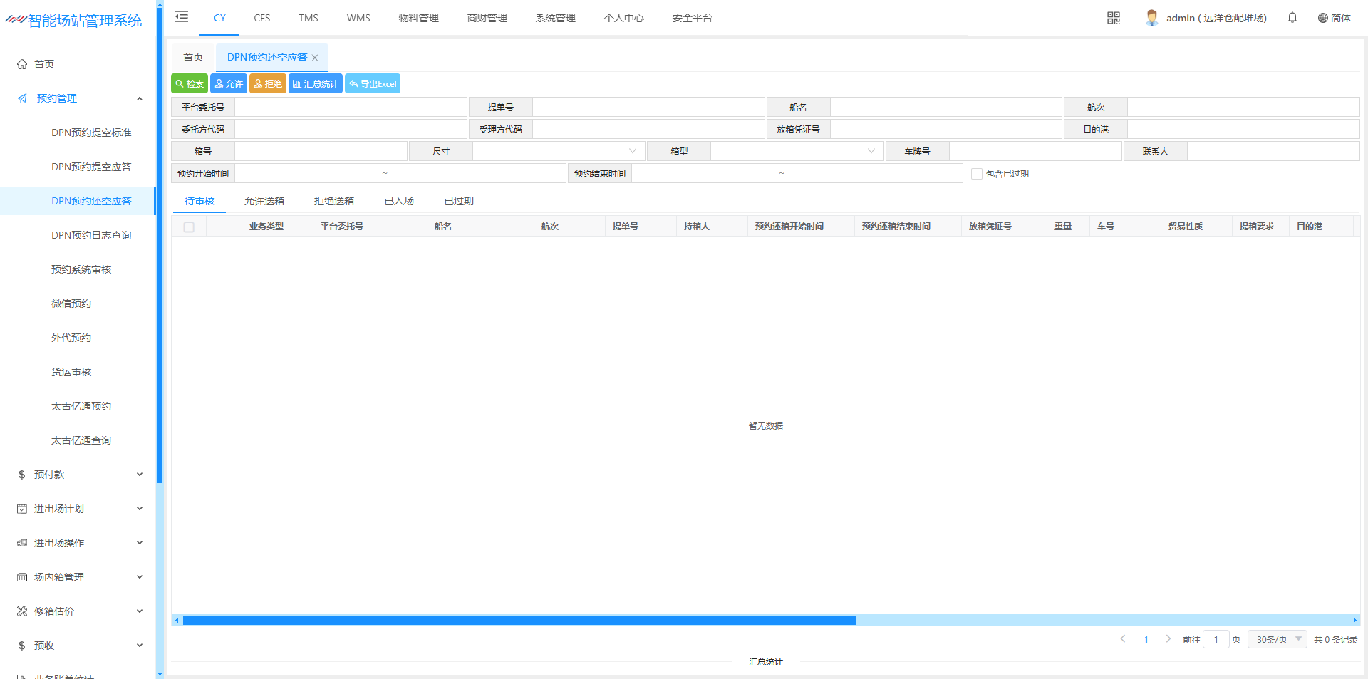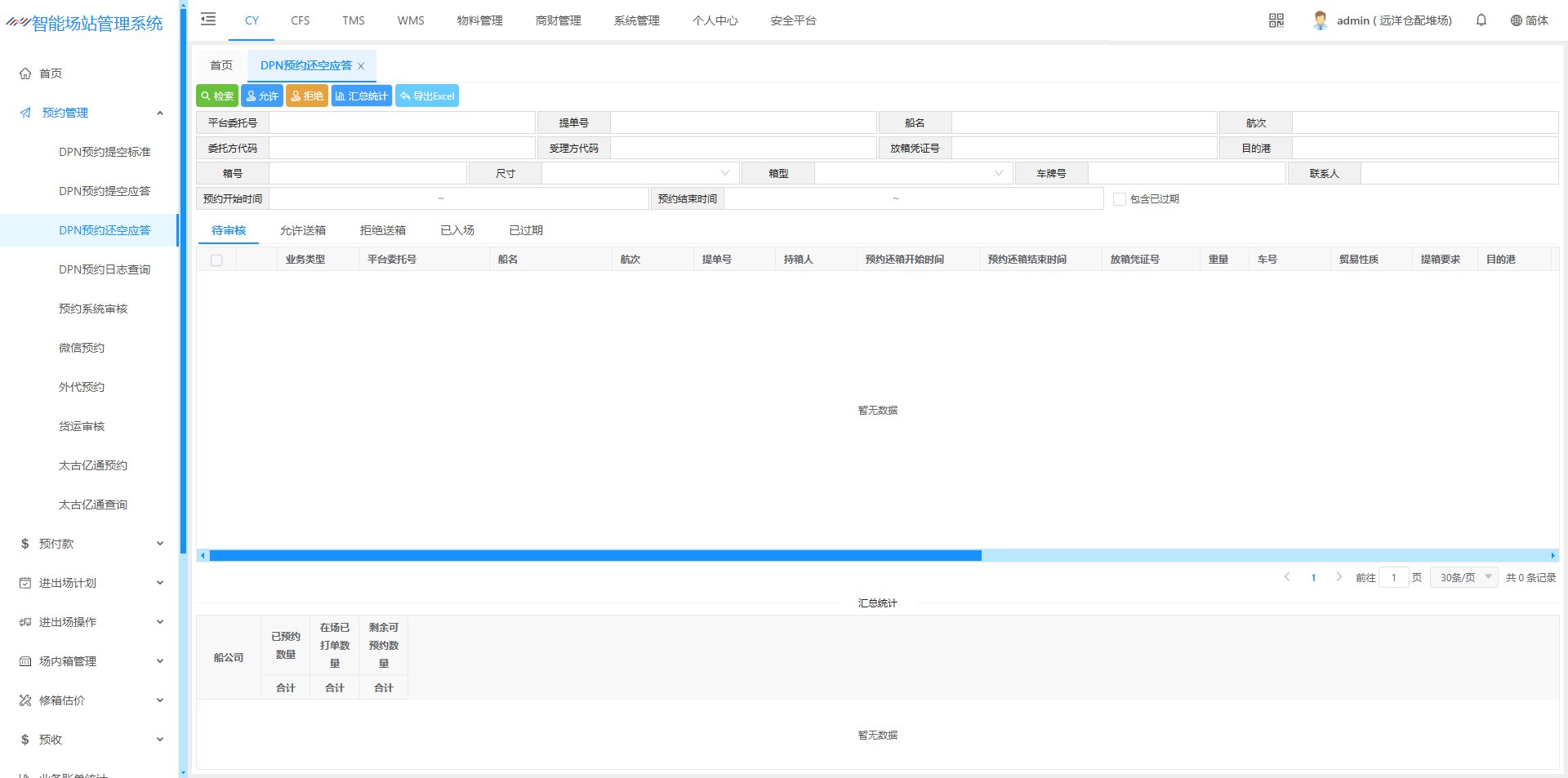 DPN预约还空应答是 集装箱进场之前,车队在DPN网站上进行还箱预约将集装箱的进场计划信息通过电子数据形式发送给堆场。堆场收到信息箱管进行审核社会通过将生成进场计划 数据来源:DPN推送的信息  检索:可以用一下检索信息填入或选择后点击检索,按照输入的信息进行检索 允许:箱管审核通过DPN推送过来的信息状态变为“允许送箱” 注:在点击允许的时候,后面有一个委托方字段 委托方字段要与系统内的【客户管理】中[DPN]代码维护一致才可生成计划,要不没有关联的委托代码无法生成计划 拒绝:箱管审核拒绝DPN推送过来的信息状态变为“拒绝送箱” 汇总统计:点击汇总统计可以在下方查询出那个船公司、已预约数量、在场已打单数量、剩余可预约数量 具体箱型尺寸的数据 导出excel:点击导出excel可以按照当前分页查询格式导出已过期的数据 注:只统计出状态【已过期】的数据  待审核:刚从DPN推送来的数据,箱管未审核的数据 允许送箱:箱管审核通过的数据自动将状态变为已入场 拒绝送箱:箱管审核拒绝的数据自动将状态变为已过期 已入场:箱管审核通过之后已有车进场提箱自动将状态变为已入场 已过期:每天晚上8点查询一次按照“预约提箱结束时间”小于当前时间自动将状态标为已过期