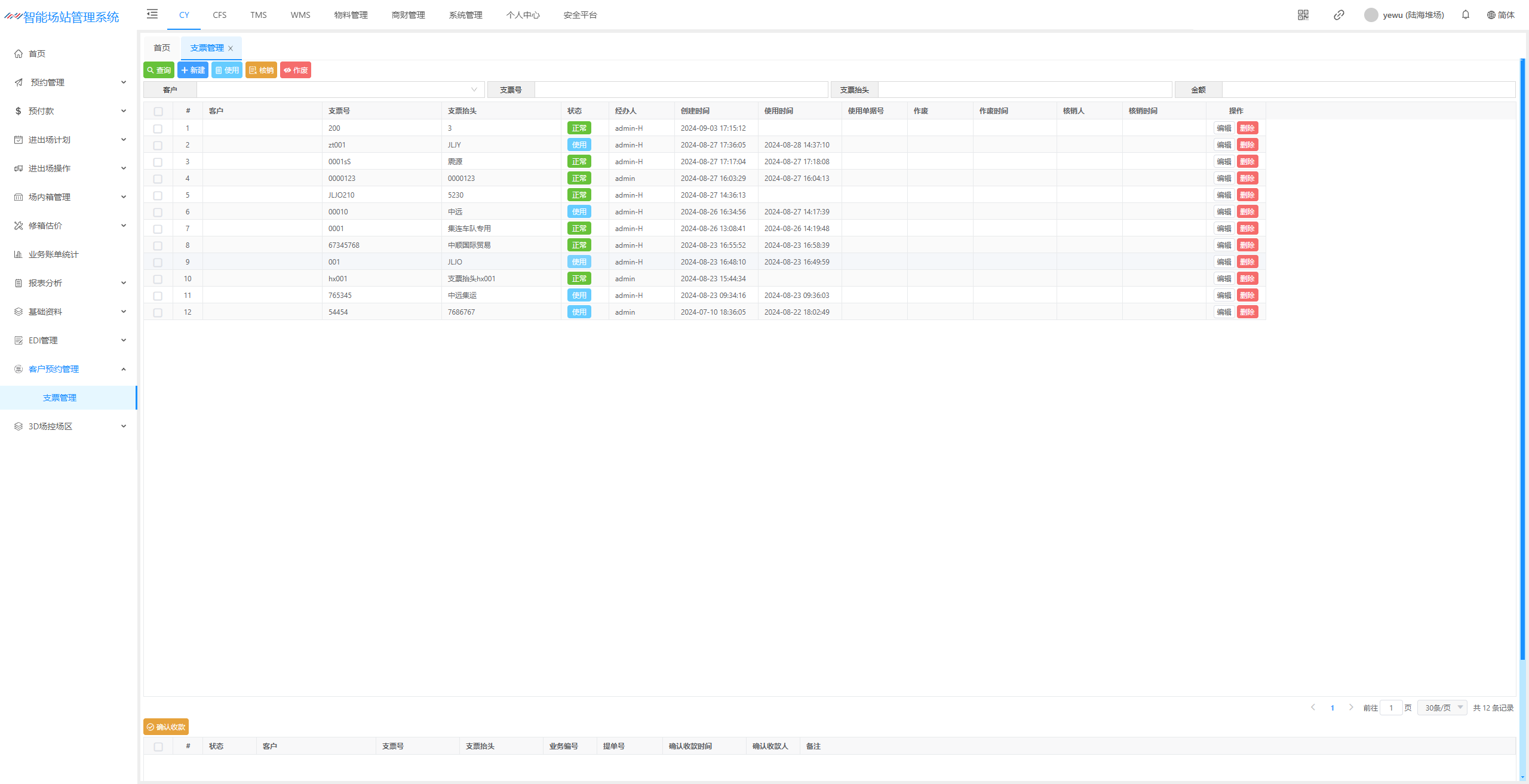 维护支票信息,维护之后客户在预约系统预约返箱时可以下拉选择,用于压修箱的费用 正常:可以正常使用的支票 使用:已在预约系统预约时,使用支票 核销:用原支票押支,结费用原支票结费 作废:客户支票退回