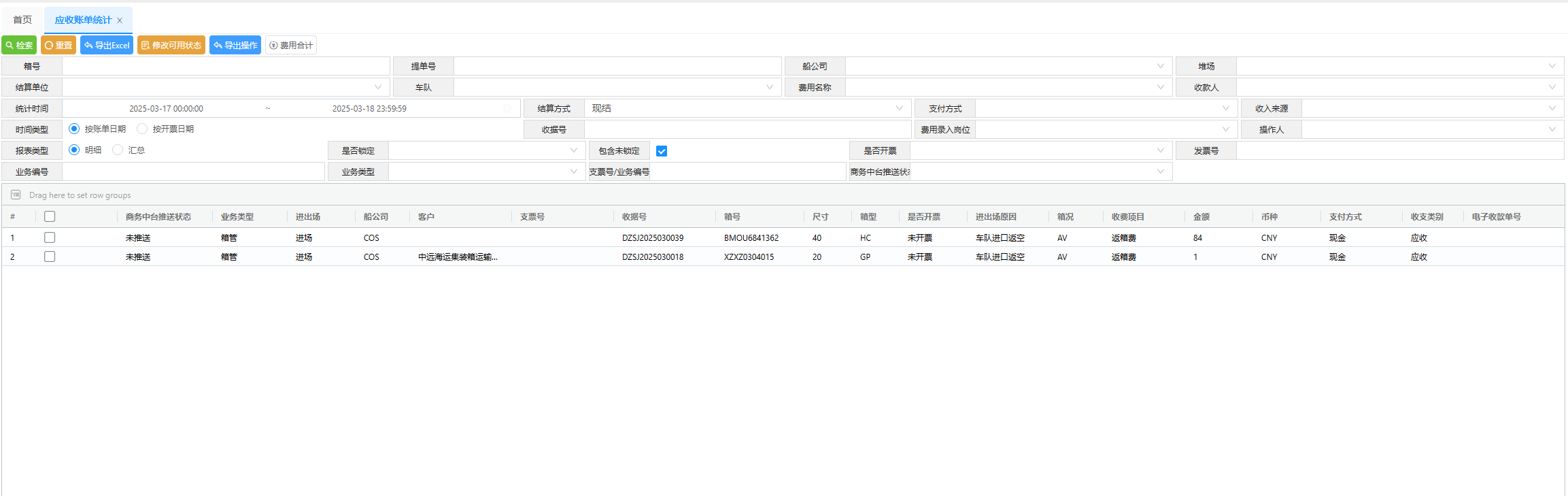 查询所有应收账单信息 检索:查询所有应收账单信息 重置:重新检索信息 导出Excel:导出excel 修改可用状态:修改可用状态,账单修改可用账单状态之后,举例:提单号A下有300块钱100块钱标记为“不可用”, 剩余200块钱用于冲抵 导出操作:按照船公司导出集装箱修箱的费用 费用合计:选择账单信息自动求和 汇总表格:所有应收账单求和信息 账单操作日志:查询中台推送日志
