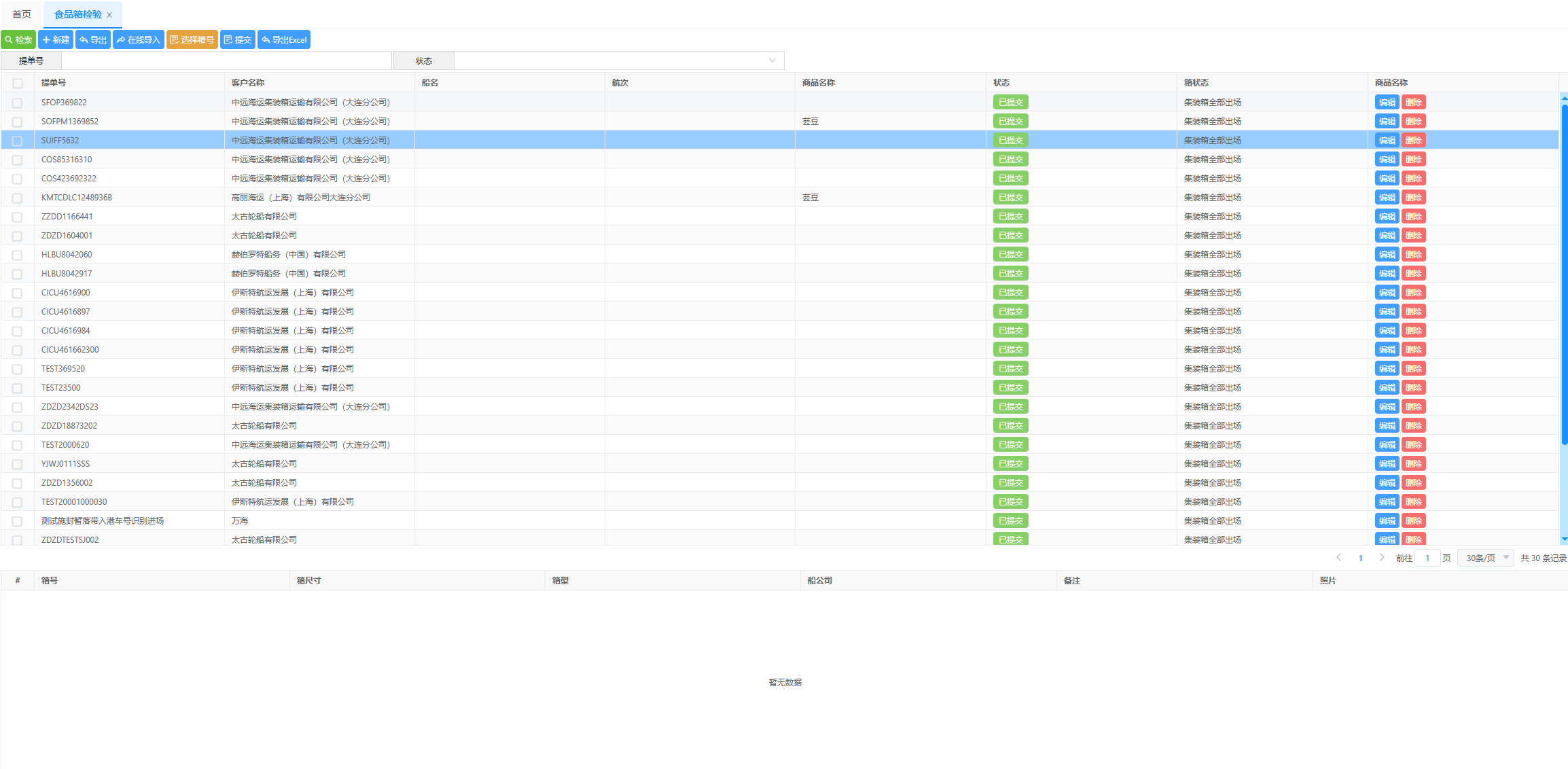按钮介绍: 新建:新建食品箱记录主信息,输入提单号、客户、船名、航次、商品信息 其中提单号、客户为必填项目 导出:新建食品箱记录之后,选择符合做食品的箱号;只有在‘手持验箱APP‘场内食品箱,验过的箱才能查询出 在线导入:在线导入提单号、客户、船名、航次、商品信息、箱号信息 提交之后,自动创建此箱的场内验食品箱记录,场内集装箱自动锁定,箱属性”是否商检箱“ 变为”是“。箱计划内指定之后 自动带出商检费;状态直接成为”已提交 选择箱号:新建食品箱记录之后,选择符合做食品的箱号;只有在‘手持验箱APP‘食品箱,验过的箱才能查询出 提交:提交验箱食品记录,状态由未完成变为 已提交 导出excel:导出提交食品箱检验记录 编辑:修改食品箱记录主信息 删除:删除食品箱记录主信息 点击食品箱记录主信息,会展示出此信息下 提交箱号 食品箱检验两个流程: 老流程1、新建→手持验箱APP场内验食品→选择箱号→提交 新流程2、直接在线导入