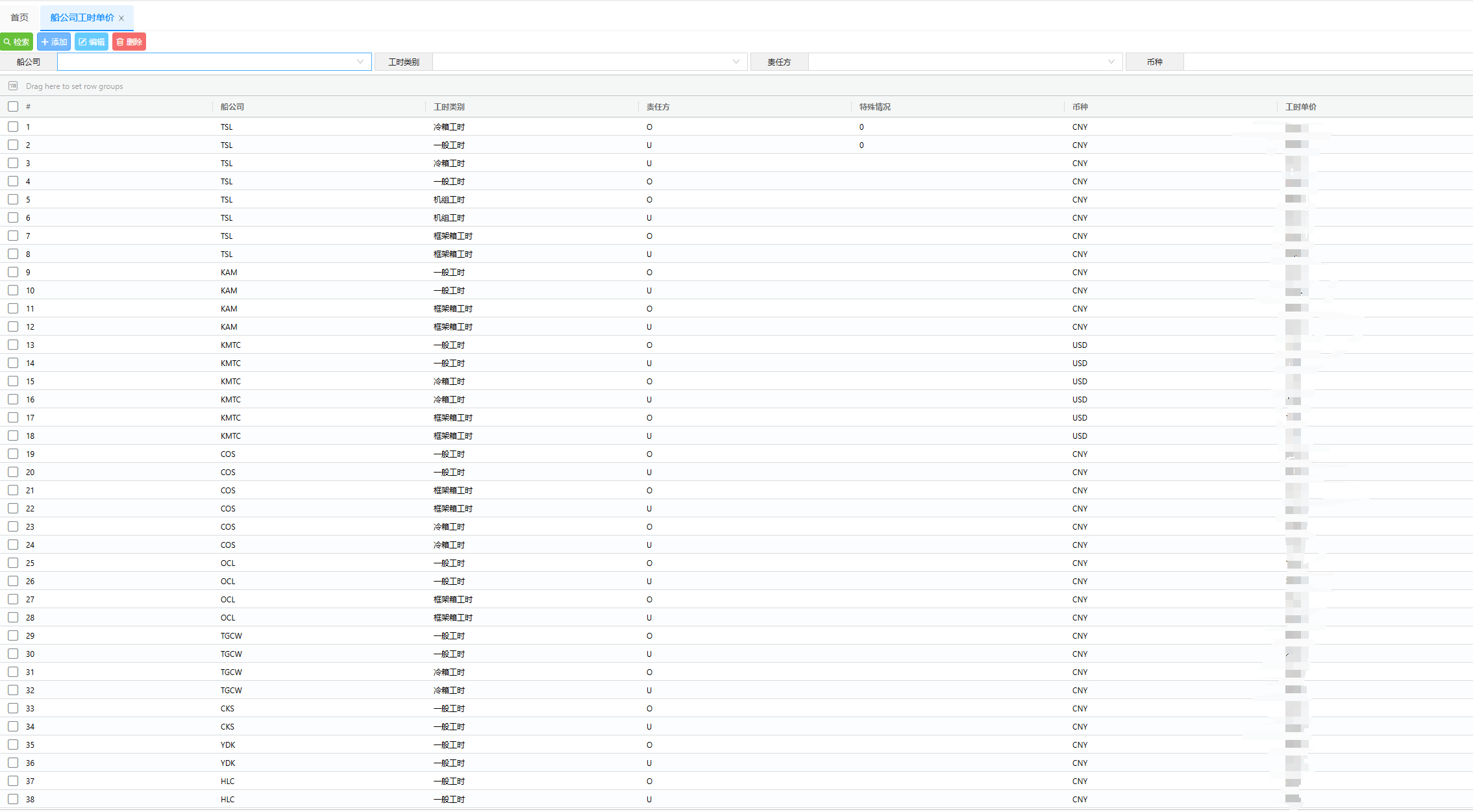 维护船公司工时单价 不同的工时类别 在修箱估价时,按照箱型+责任方判断工时取值计算