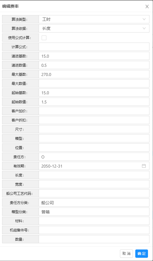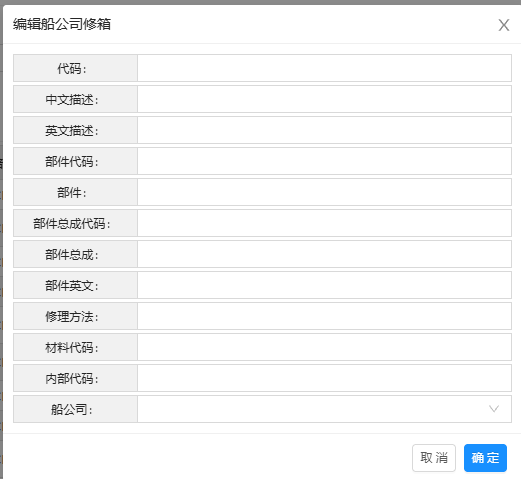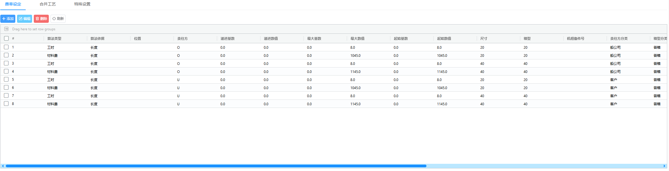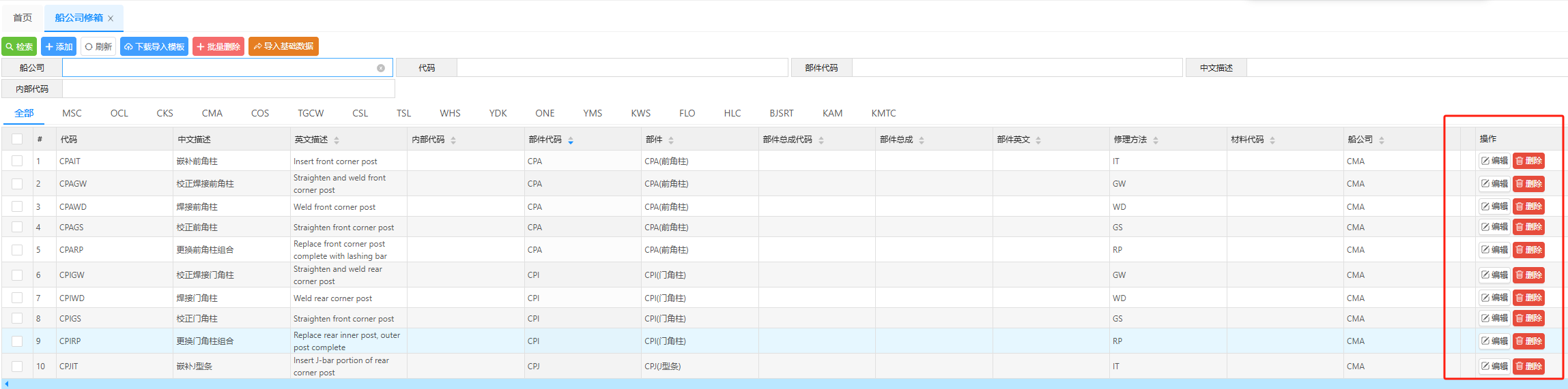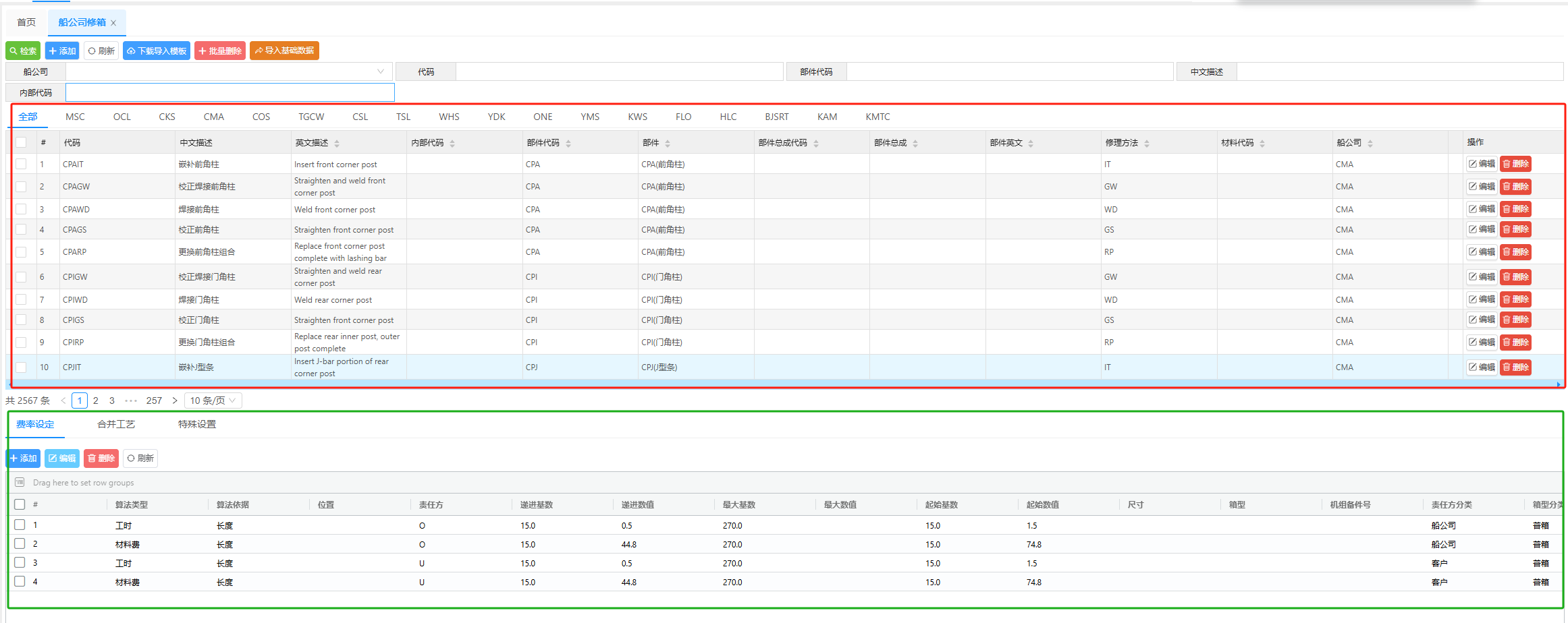 维护船公司修箱费率 此页面分两个部分,红色的为修箱费率主信息 绿色部分为修箱费率明细 ## 修箱费率主信息  按钮解释 添加:添加船公司费率 添加 代码:部件代码+修理方法 中文描述:中文描述修理方式 英文描述:英文描述修理方式 部件代码:选择部件代码 数据来源 修箱基础资料-部件代码 部件:部件代码+(中文描述) 部件总成代码: 部件总成 部件英文 修理方法:选择部件代码 数据来源 修箱基础资料-修理方法 材料代码: 内部代码:填入内部代码,通过内部代码管理船公司代码,若没有匹配的船公司代码,估价明细金额按照内部代码生成 船公司:选择船公司信息 选择确认之后创建,船公司下修箱费率主信息  刷新:刷新查询信息 下载:下载导入模板 批量删除:选择多条修箱费率主信息,进行删除 会一并删除修箱费率明细 导入基础数据:按照excel内容导入修箱费率  编辑:修改修箱费率主信息 删除:删除修箱费率主信息,但不会删除对应修箱费率明细  ## 修箱费率明细 费率设定:维护费率 合并工艺: 特殊设置:  按钮解释 添加:添加船公司费率明细 编辑:修改船公司费率明细 删除:删除船公司费率明细 刷新:刷新船公司费率明细  添加费率 算法类型:选择要计算的费用,工时/材料费 算法依据:选择(工时/材料费)的计算方式(计算方式:长度、宽度、面积、数量、周长、固定值) 计算方式维护不同计算方式不同 计算方式: **长度、宽度、面积、周长计算** 工时、材料费=(((长度-起始基数)/递进基数)*递进数值+起始数值)*数量 工价=工时*船公司工时单价 **数量计算** 工时、材料费=(((数量-起始基数)/递进基数)*递进数值+起始数值) **固定值计算** 工时、材料费=起始基数*数量 特殊情况 1、如果长、宽、面积、周长-起始基数=0 工时、材料费=起始基数*数量 2、如果数量-起始基数=0 工时、材料费=起始基数