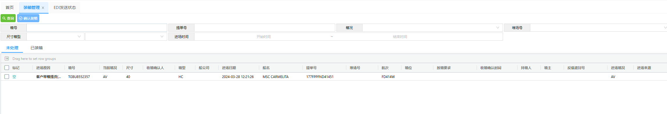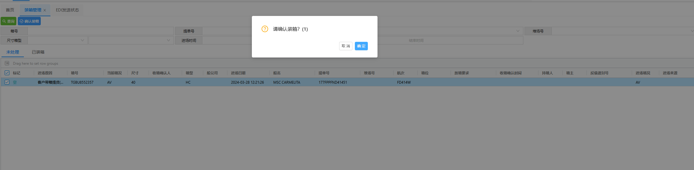 装箱管理 客户带箱提货(落地),理货装箱完毕之后 业务员进入此页面选中集装箱箱子自动变为重箱,自动创建出出场计划 数据来源:这两个进场原因的客户带箱提货(落地) 2客户带箱提货(落地) 进场的集装箱; 客户带箱提货(落地) 确认之后生成 提客户重箱出场 2客户带箱提货(落地) 确认之后生成 2提客户重箱出场  操作流程: 选择要装箱的箱子,打上上面的“√” 点击确认进行收箱 确认即可