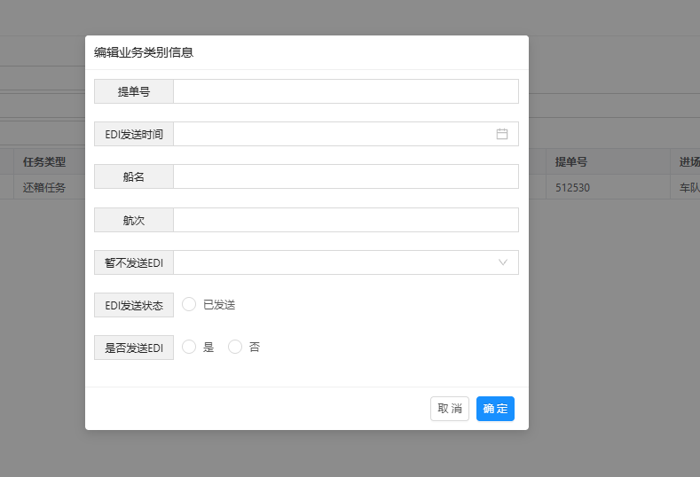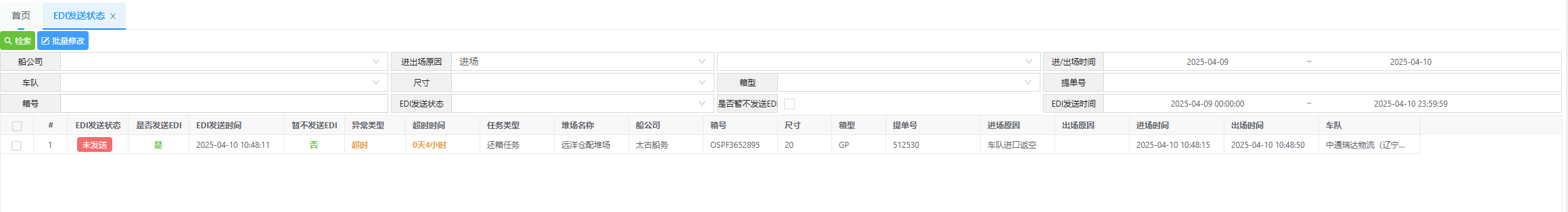 EDI发送状态 用于查询所有发送EDI的箱任务与发送EDI暂时标记‘暂不发送EDI’的数据,进行批量修改 提单号、EDI发送时间、船名、航次 、暂不发送EDI、EDI发送状态(只能改为已发送)、是否发送EDI(改为否之后,【EDI发送状态】查询不出数据,因为 EDI发送状态 用于查询所有发送EDI的箱任务与发送EDI暂时标记‘暂不发送EDI’的数据)  操作流程: 选中一条数据点击‘批量修改’,输入修改之后的信息 点击确认操作完毕 注:若没有填写修改信息,点击确认没有填写信息字段 不进行修改