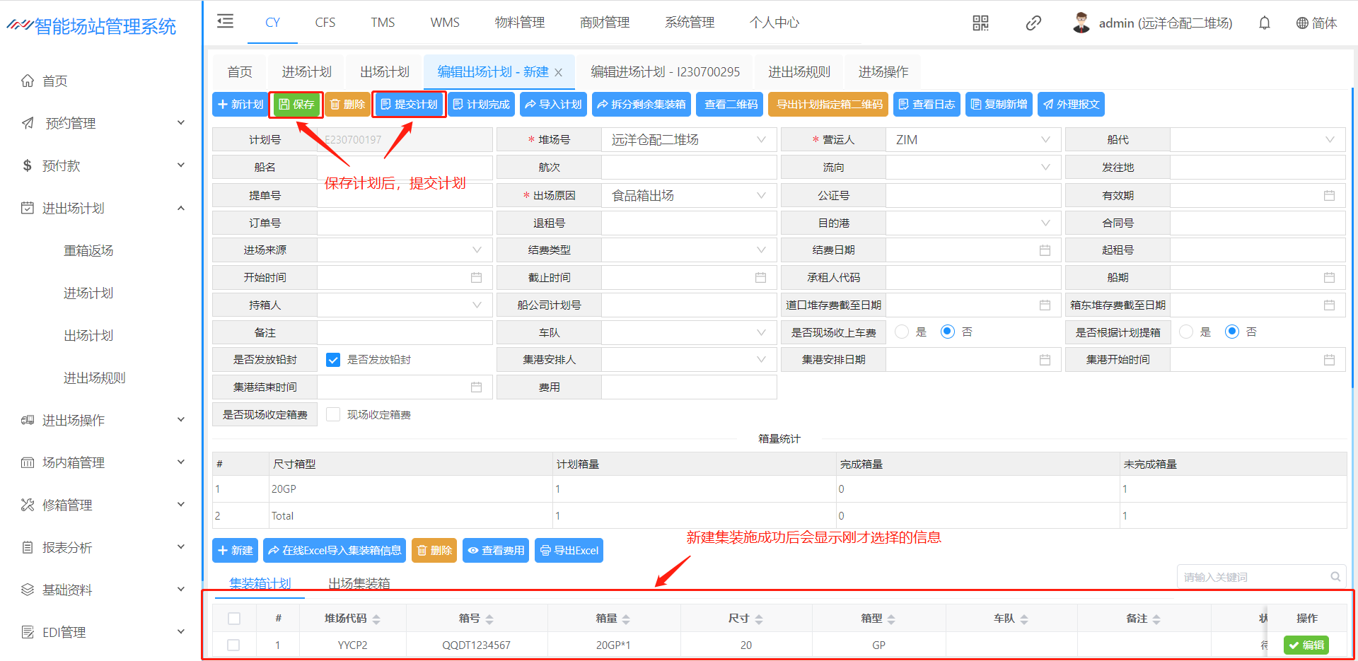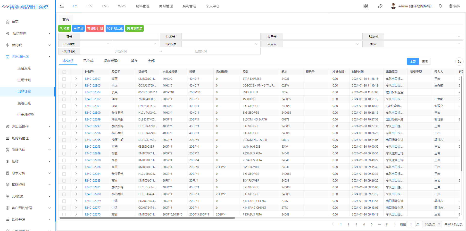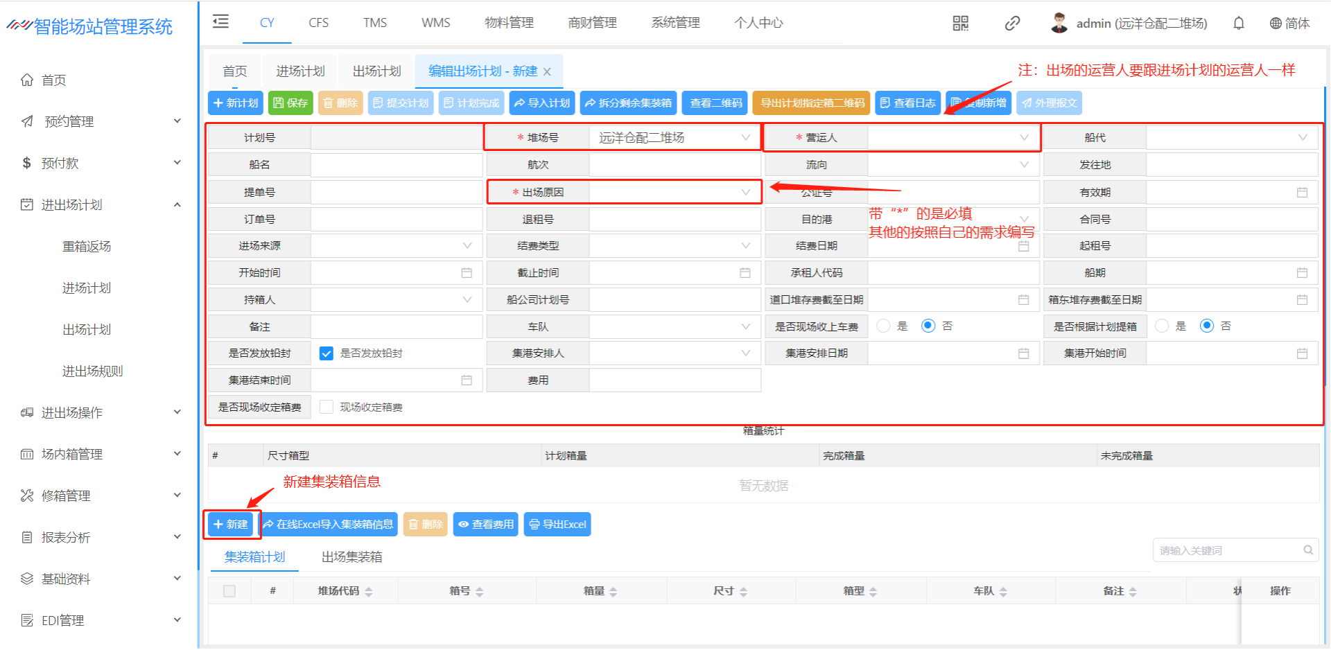 出场计划是 集装箱出场之前,船公司将集装箱的出场计划信息通过电子文件(EXCEL)形式发送给堆场。堆场收到出场计划信息后,将信息录入或导入出场计划模块。 该页面主要用于创建箱出场计划,创建完计划后,道口可以进场操作办单进场登记。 一个提单号为一个出场计划,每个进场计划都有计划号,计划号为系统自动生成并不可重复。 页面默认展示未完成,并可以通过上方各种检索条件,查询对应的出场计划。  点击新建进入该页面可以箱子的出场计划  出场原因:可以选择业务的出场原因,各个业务的出场原因不同,所生成的费用不同,以及是否发送EDI(来源:基础资料-出场原因)(费用来源:费率标准-进出场费率设置) 堆场号:可以选择远洋仓配一堆场、远洋仓配二堆场(来源:基础资料-堆场设置) 营运人:可以选择对应的营运人,营运人不同搭配对应的进场原因也不同(来源:基础资料-营运人代码) 提单号:输入提单号,若是重复系统将会进行提示 船名:下拉选择(来源:船名管理) 船次:可进行下拉选择也可填写船次 来源、流向:下拉选择(来源:基础资料-提还箱点) 有效期:默认建立计划后一个月,若是有效期期限超过一个月,则道口在进场操作时检索不到计划 暂不发放EDI:挑选上之后,在箱综合查询检索之后的箱号,把暂不发送EDI给挑开 结费类型:下拉选择选择的结费类型不同。生成的费率不同 1、现结:若是现结计划将产生进出场费率设置所维护的费率进行生成,若是提前缴费则去进场预收结费(像加班费、二次搬移费之类的费用则会在进场操作产生)在道口核销出场之后,将会产生月结的船公司费率 2、月结:若是选择月结将不会在计划内产生费用,统一在道口核销出场之后,将会产生月结的船公司费率(若是加班费之类的费用也会产生) 3、内部结转:若是内部结转,统一在道口核销出场之后,将会产生月结费率(若是加班费之类的费用也不会产生) 车队:下拉选择(来源:客户资料) 箱型箱量:点击【新建】按钮可以增加该票的箱型箱量(来源:基础资料-箱尺寸)  放箱要求/验箱标准/备注:填写后将在验箱人员的验箱备注、车载APP的作业备注、进场操作的落箱要求将会显示箱管所备注的内容 箱号:下拉选择,选择之后只能保存同一个营运人的箱子,若是不一致系统将会提示内容不符;若是不选择箱号,集装箱则会变成“无箱号”,将会进场操作时,道口进行填写 查看费用:点击【查看费用】将会看到计划内生成的费用  引入费用:根据进出场费用标准(费用来源:费率标准-进出场费率设置)重新引出费用 批量删除计划费用:选择好费用之后进行批量删除 - 这里演示的时新建出场计划流程 ## 1、新建出场计划流程  ## 2、新建出场计划信息页面  ## 3、新建出场计划箱子  ## 4、提交计划  > <span style="font-family:楷体">保存成功后点击提交计划即可完成出场计划添加。</span> ## 5、查看新建完成的出场计划 > <span style="font-family:楷体">查看出场计划跟查看进场计划类似,暂不演示!</span>