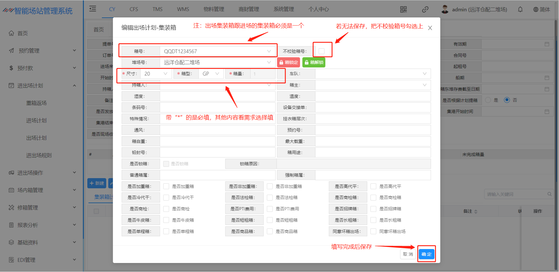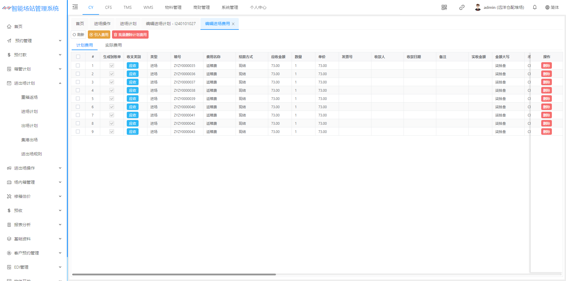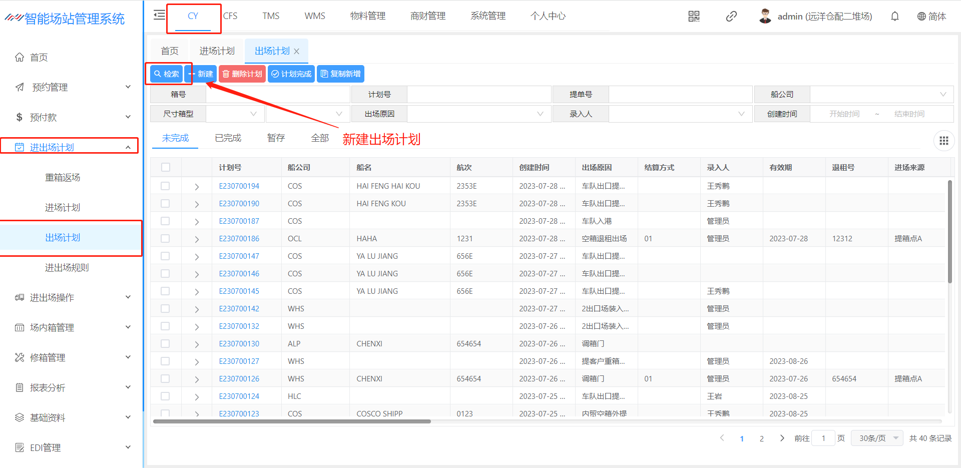出场计划是 集装箱出场之前,船公司将集装箱的出场计划信息通过电子文件(EXCEL)形式发送给堆场。堆场收到出场计划信息后,将信息录入或导入出场计划模块。 该页面主要用于创建箱出场计划,创建完计划后,道口可以进场操作办单进场登记。 一个提单号为一个出场计划,每个进场计划都有计划号,计划号为系统自动生成并不可重复。 页面默认展示未完成,并可以通过上方各种检索条件,查询对应的出场计划。  点击新建进入该页面可以箱子的出场计划  出场原因:可以选择业务的出场原因,各个业务的出场原因不同,所生成的费用不同,以及是否发送EDI(来源:基础资料-出场原因)(费用来源:费率标准-进出场费率设置) 堆场号:可以选择远洋仓配一堆场、远洋仓配二堆场(来源:基础资料-堆场设置) 营运人:可以选择对应的营运人,营运人不同搭配对应的进场原因也不同(来源:基础资料-营运人代码) 提单号:输入提单号,若是重复系统将会进行提示 船名:下拉选择(来源:船名管理) 船次:可进行下拉选择也可填写船次 来源、流向:下拉选择(来源:基础资料-提还箱点) 有效期:默认建立计划后一个月,若是有效期期限超过一个月,则道口在进场操作时检索不到计划 暂不发放EDI:挑选上之后,在箱综合查询检索之后的箱号,把暂不发送EDI给挑开 结费类型:下拉选择选择的结费类型不同。生成的费率不同 1、现结:若是现结计划将产生进出场费率设置所维护的费率进行生成,若是提前缴费则去进场预收结费(像加班费、二次搬移费之类的费用则会在进场操作产生)在道口核销出场之后,将会产生月结的船公司费率 2、月结:若是选择月结将不会在计划内产生费用,统一在道口核销出场之后,将会产生月结的船公司费率(若是加班费之类的费用也会产生) 3、内部结转:若是内部结转,统一在道口核销出场之后,将会产生月结费率(若是加班费之类的费用也不会产生) 车队:下拉选择(来源:客户资料) 箱型箱量:点击【新建】按钮可以增加该票的箱型箱量(来源:基础资料-箱尺寸)  放箱要求/验箱标准/备注:填写后将在验箱人员的验箱备注、车载APP的作业备注、进场操作的落箱要求将会显示箱管所备注的内容 箱号:下拉选择,选择之后只能保存同一个营运人的箱子,若是不一致系统将会提示内容不符;若是不选择箱号,集装箱则会变成“无箱号”,将会进场操作时,道口进行填写 查看费用:点击【查看费用】将会看到计划内生成的费用  引入费用:根据进出场费用标准(费用来源:费率标准-进出场费率设置)重新引出费用 批量删除计划费用:选择好费用之后进行批量删除 - 这里演示的时新建出场计划流程 ## 1、新建出场计划流程  ## 2、新建出场计划信息页面  ## 3、新建出场计划箱子  ## 4、提交计划  > <span style="font-family:楷体">保存成功后点击提交计划即可完成出场计划添加。</span> ## 5、查看新建完成的出场计划 > <span style="font-family:楷体">查看出场计划跟查看进场计划类似,暂不演示!</span>
