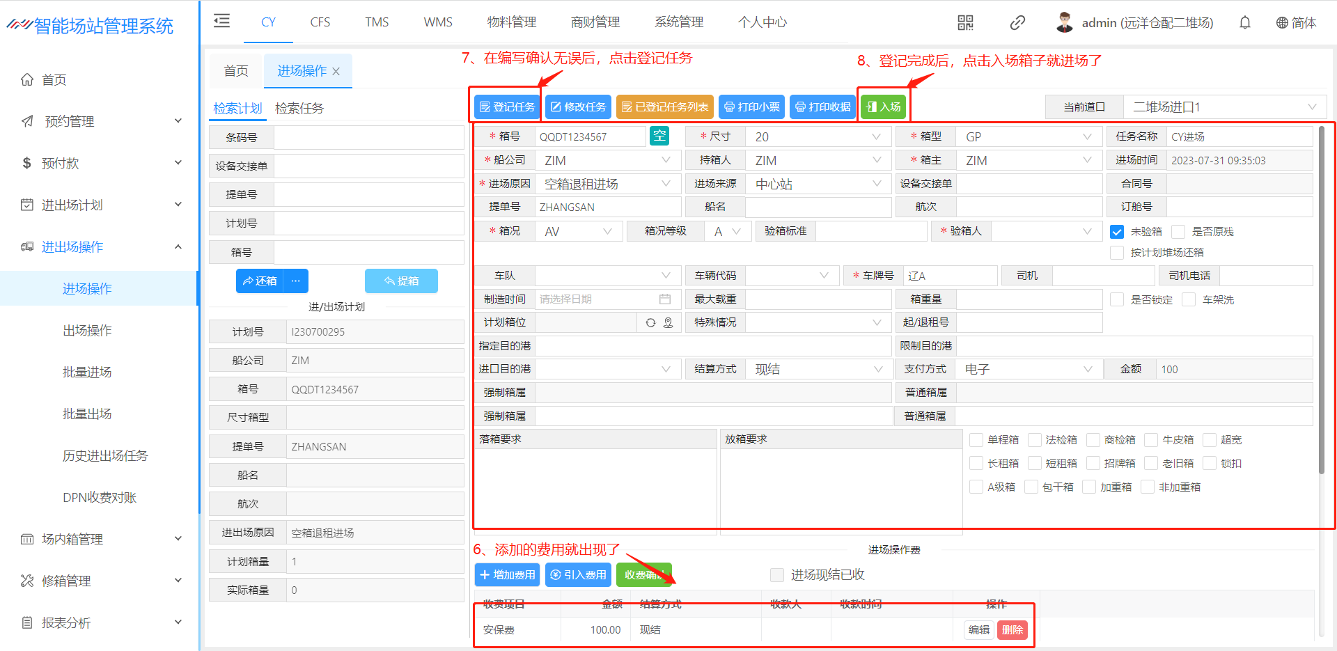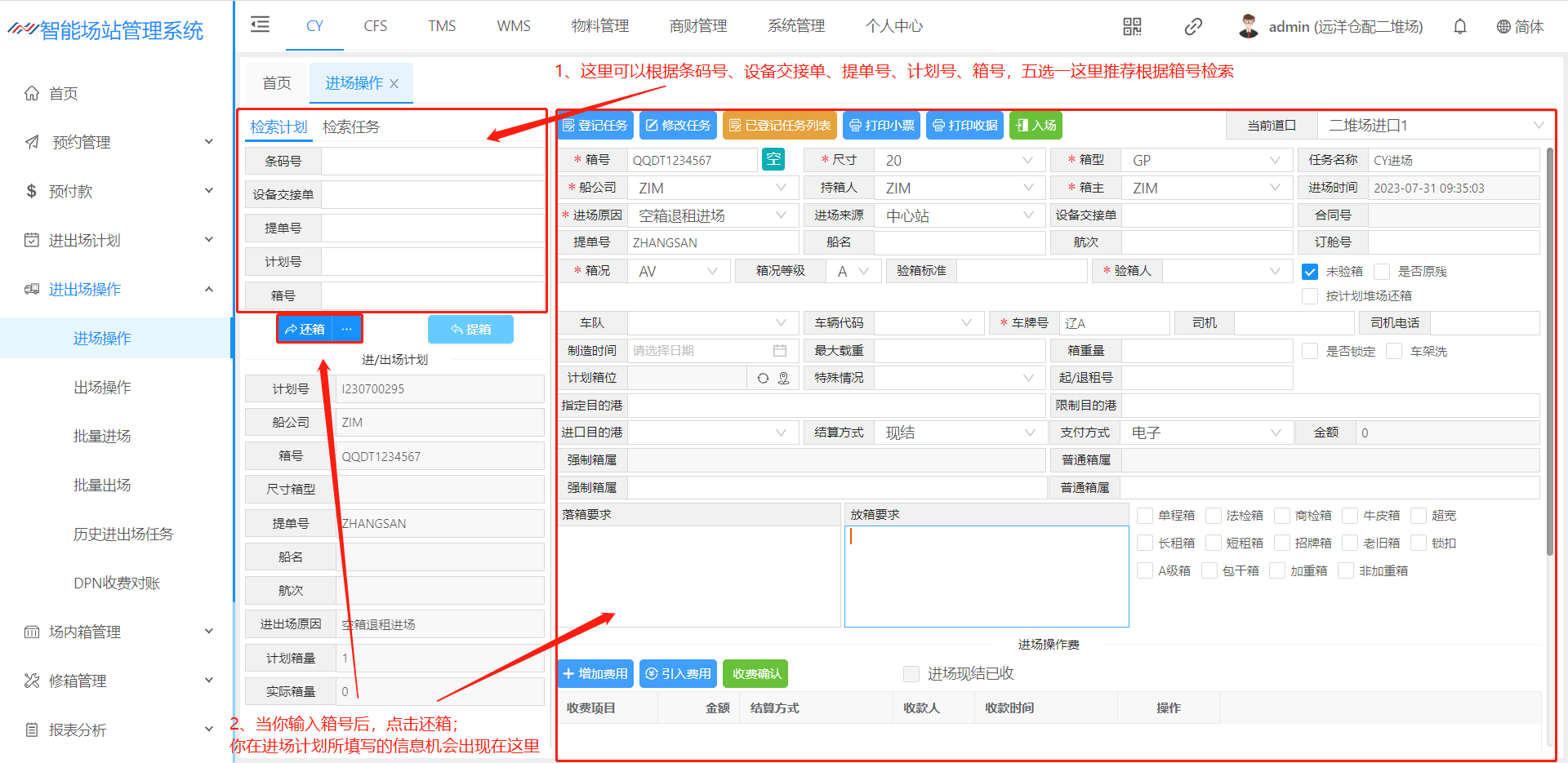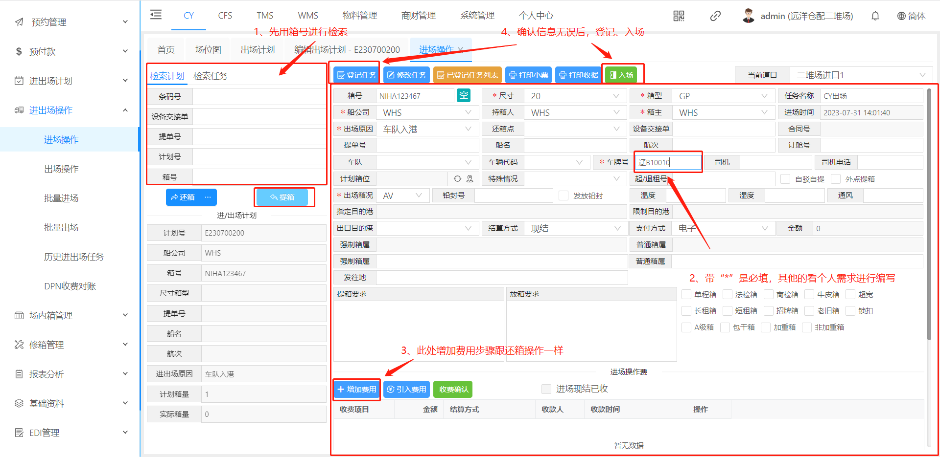 ## 新建进场操作(还箱) > <span style="font-family:楷体">还箱步骤1:根据检索条件把数据引入</span>  > <span style="font-family:楷体">还箱步骤2:查看信息,根据需求填写</span>  > <span style="font-family:楷体">还箱步骤3:这里计划箱位演示的是箱位的选择</span>  > <span style="font-family:楷体">还箱步骤4:这边演示的为新增费用</span>  > <span style="font-family:楷体">还箱步骤5:查看无误后,确认登记入场</span>  ## 新建进场操作(提箱) > <span style="font-family:楷体">提箱步骤:查看无误后,确认登记入场</span></span> > <span style="font-family:楷体">注:添加金额用法跟提箱添加金额一样,这暂不演示</span>