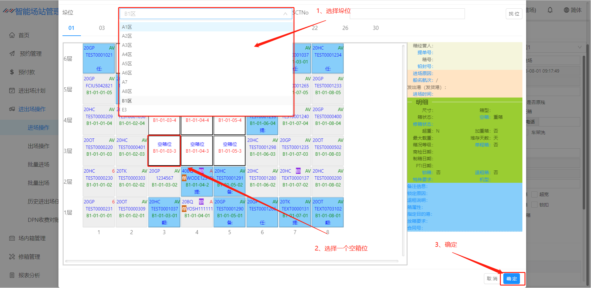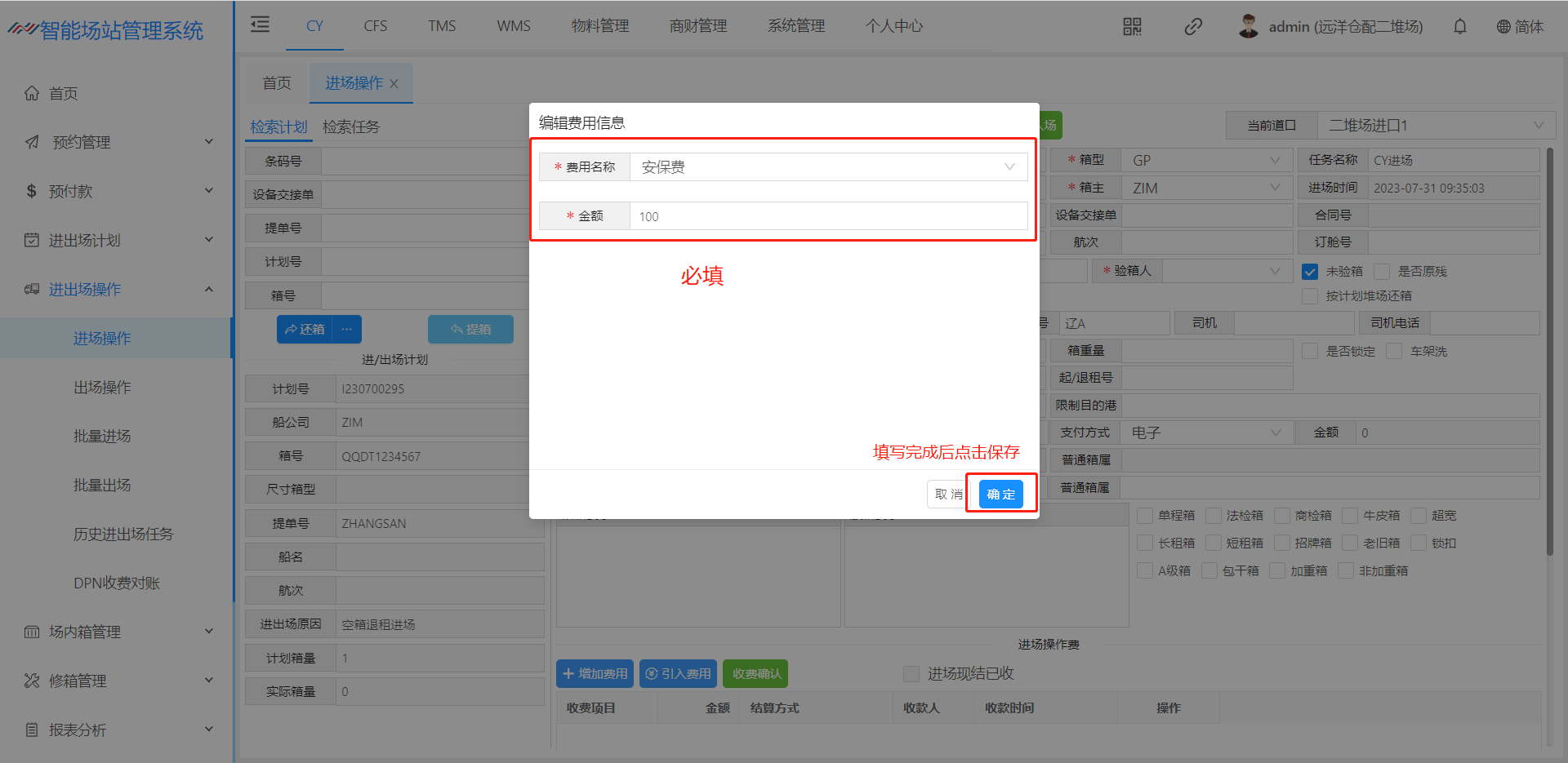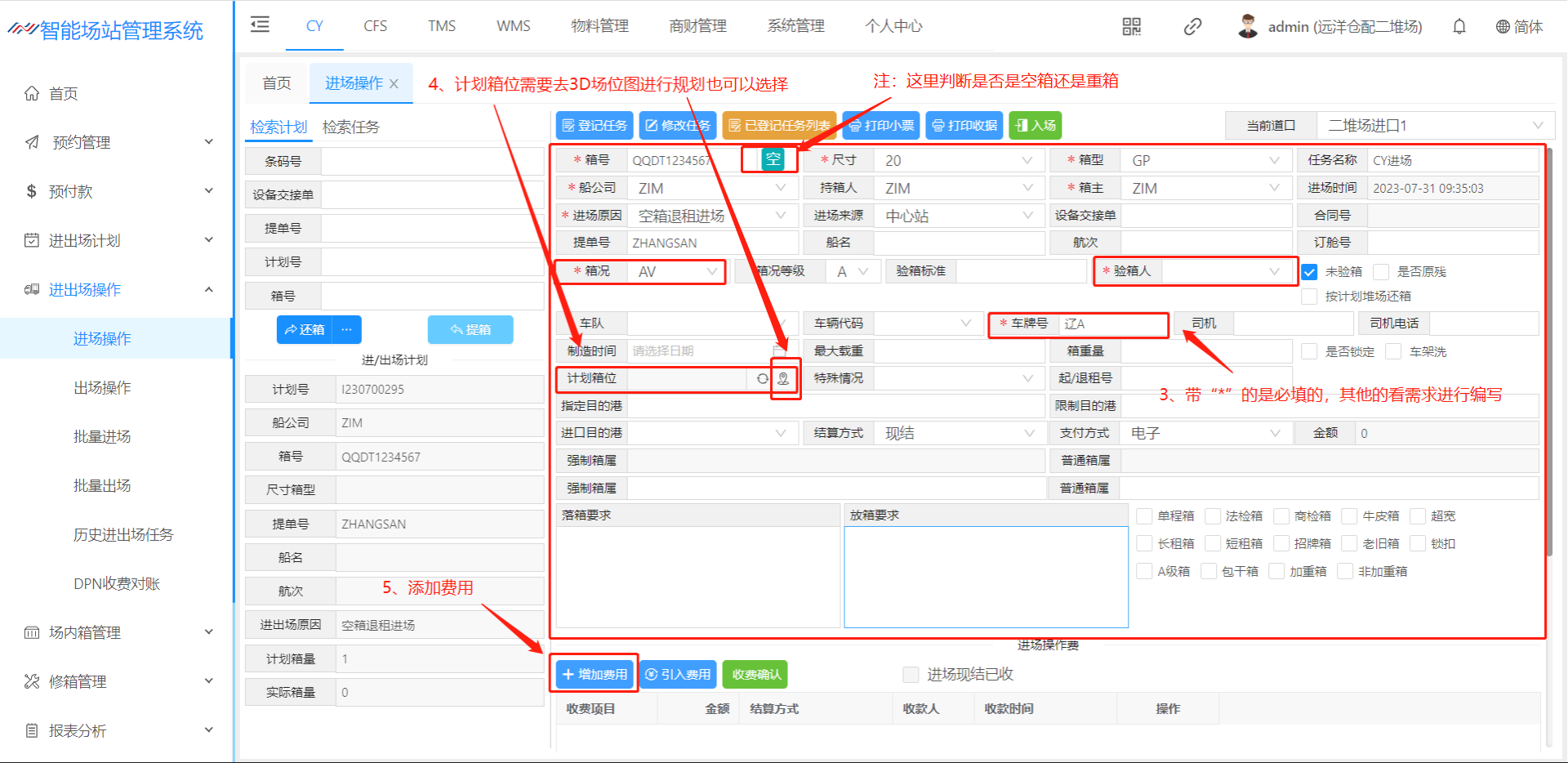 ## 新建进场操作(还箱) > <span style="font-family:楷体">还箱步骤1:根据检索条件把数据引入</span>  > <span style="font-family:楷体">还箱步骤2:查看信息,根据需求填写</span>  > <span style="font-family:楷体">还箱步骤3:这里计划箱位演示的是箱位的选择</span>  > <span style="font-family:楷体">还箱步骤4:这边演示的为新增费用</span>  > <span style="font-family:楷体">还箱步骤5:查看无误后,确认登记入场</span>  ## 新建进场操作(提箱) > <span style="font-family:楷体">提箱步骤:查看无误后,确认登记入场</span></span> > <span style="font-family:楷体">注:添加金额用法跟提箱添加金额一样,这暂不演示</span>
