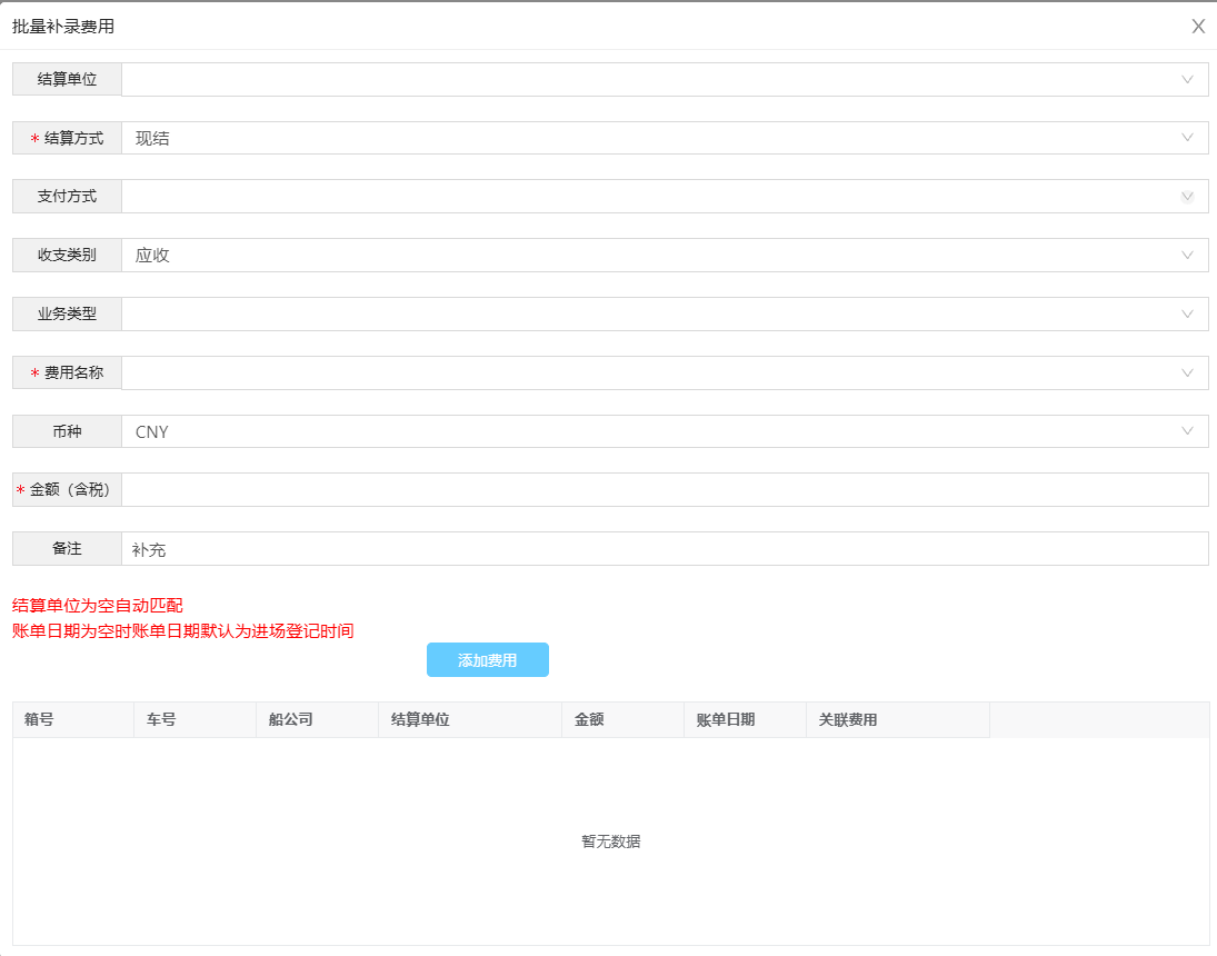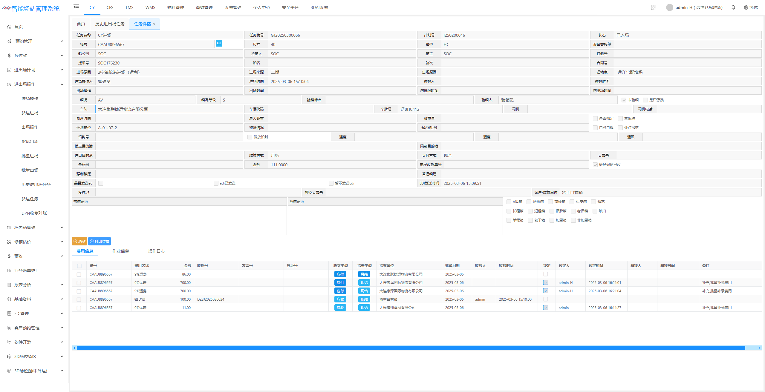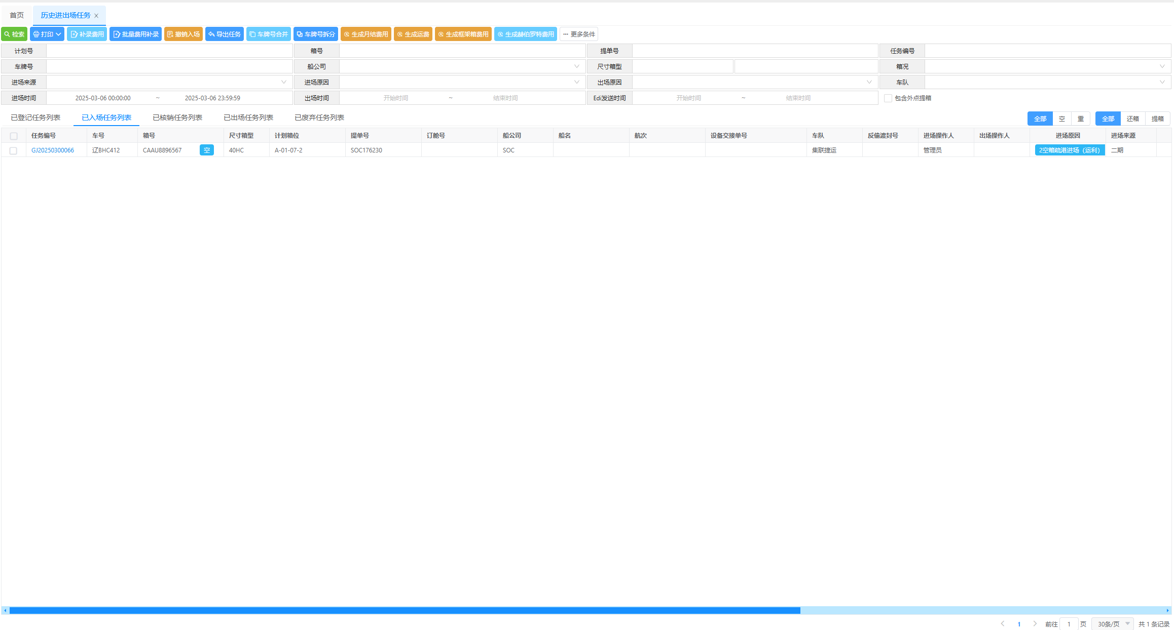 > <span style="font-family:楷体">历史进出任务是记录进出场任务的集合</span> 打印:小票、票结收据、补录小票、修箱小票、设备结交单、加固小票 补录费用:补录单条费用。  批量费用补录:批量补录集装箱费用信息  删除任务、撤销入场、撤销任务核销、撤销出场:撤销任务信息退会上个状态 状态:登录、入场、提箱、核销、出场     导出任务:导出任务信息  车牌号合并:将两条任务后台车号合并成一条信息,视为这个车双背两个小柜,用于补运费费用 车牌号拆分:将一个车双背小个小柜 拆分两条信息。视为这个车单背小柜,用于补运费费用 生成月结费用:按照任务信息,去寻找费率信息生成月结费用 生成运费:按照任务信息,去寻找费率信息生成应付运费 生成框架箱费用:按照任务信息,去寻找费率信息生成应付运费 针对框架箱生成运费,例如:四个框架 生成的费用为 0,0,0,95.38 生成赫伯罗特费用:赫伯罗特DCM设备固定安装费(操作费)是42CNY/个,外付是天久22.5CNY/个 更多条件:更多查询条件  1、检索:根据以下的检索条件进行进出场任务检索。 2、打印: 选择一条进出场数据可进行打印小票、打印收据、打印设备交接单。 3、修改车牌号: 选择一条进出场数据即可修改车牌号。 4、删除任务: 删除一条进出场数据。 5、导出任务: 把进出场数据导出成Excel表格。 注:选择一条数据双击“任务编号”,可以打开任务详情。</span>