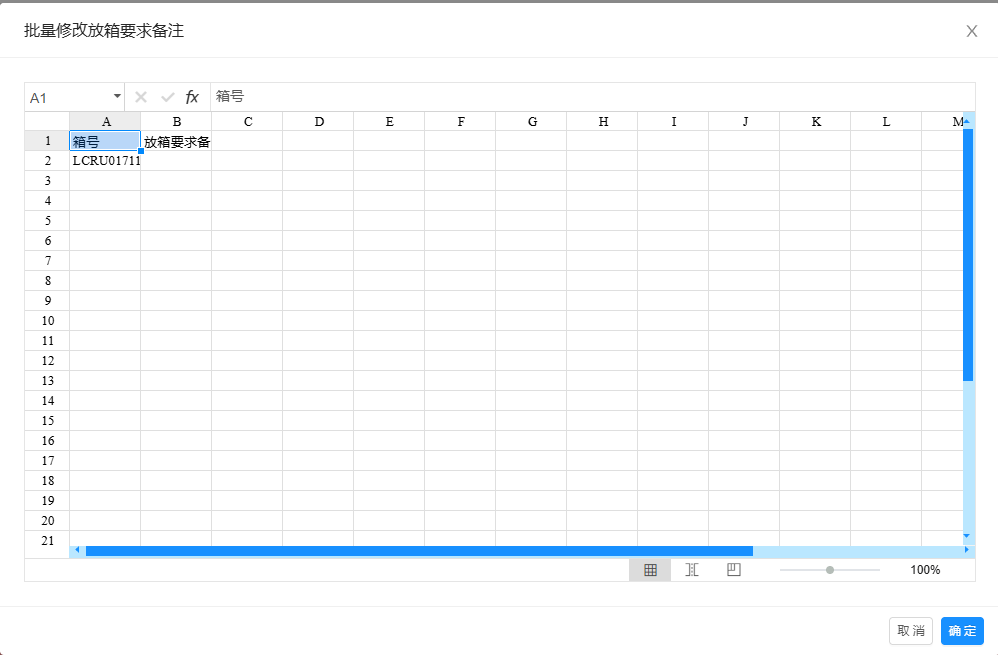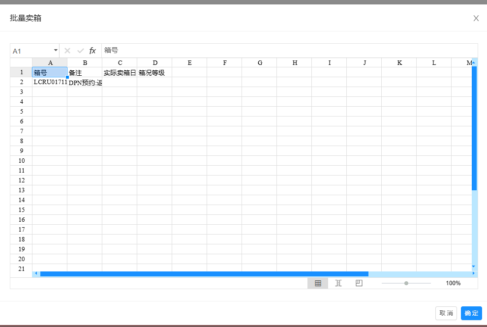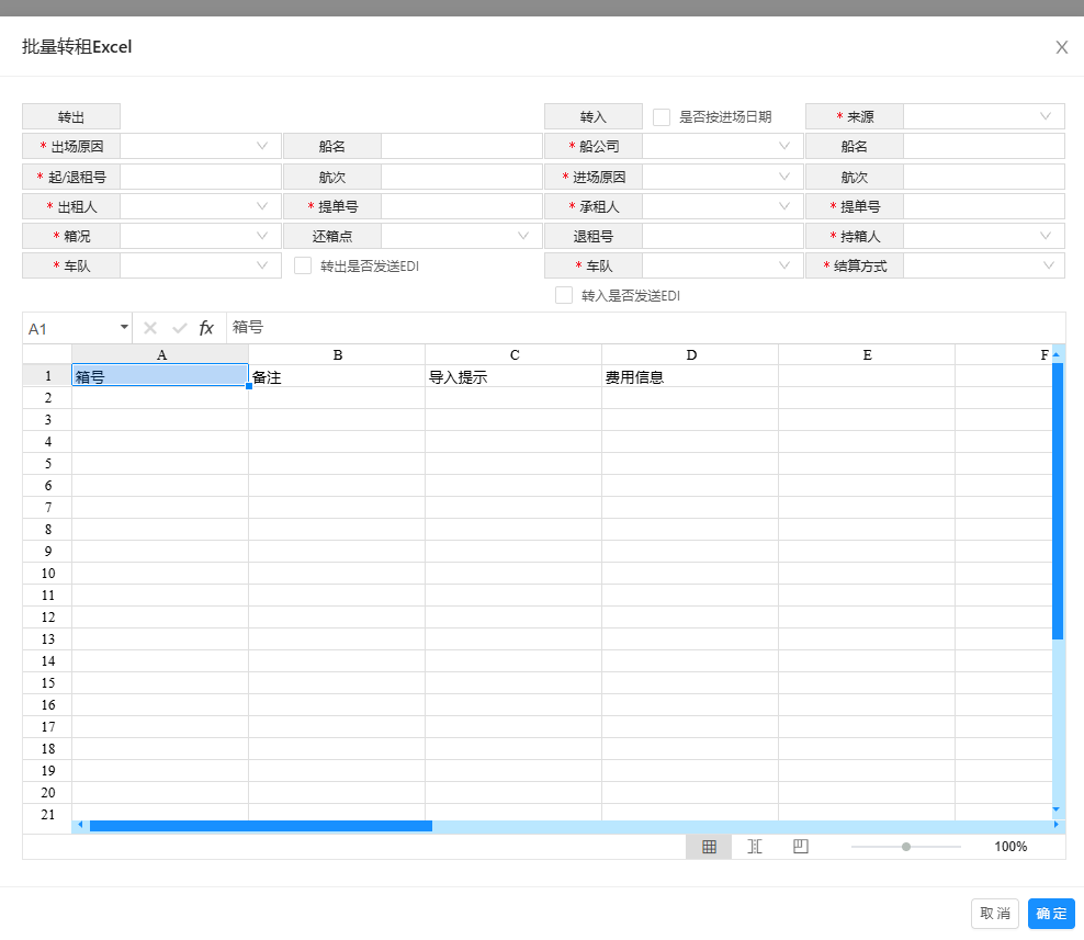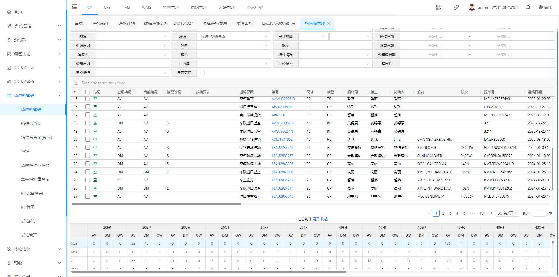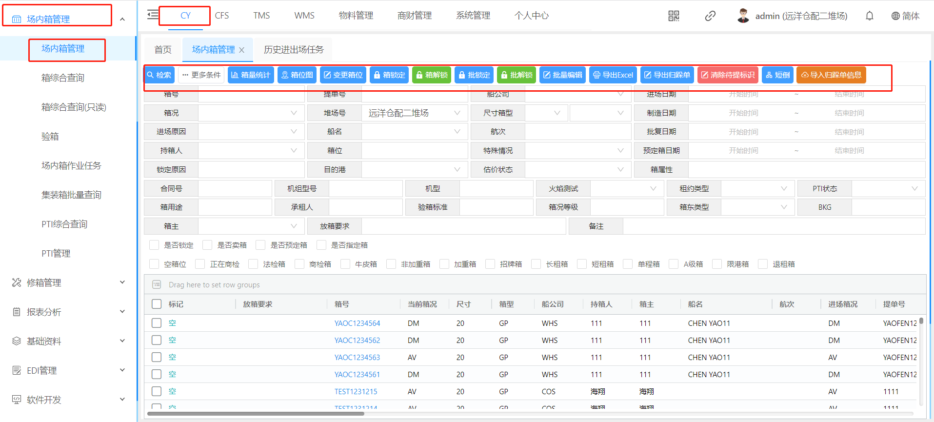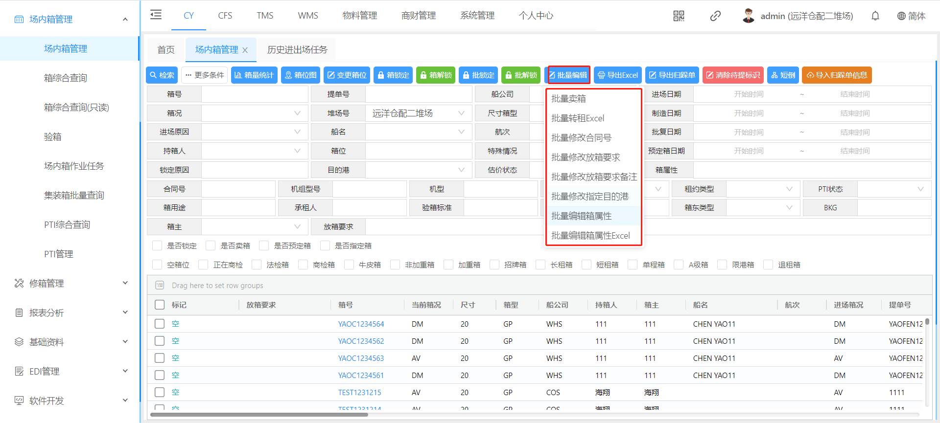 对堆场里的箱子信息管理,可以对箱子进行修改、查询、删除 注:选择一条数据双击“箱号”,可以打开任务详情  1. 检索:可以根据以下条件检索你需要找的箱信息。 2. 箱量统计:查询各个船公司在此堆场箱的数量。 3. 箱位图:查询某个具体箱在堆场的位置。 4. 变更箱位:更改某个具体箱在堆场的位置。 5. 箱锁定:把箱锁定。 6. 箱解锁:把箱解锁。 7. 批锁定:批量把箱锁定。 8. 批解锁:批量把箱解锁。 9. 批量编辑:批量对箱进行修改例如:批量卖箱、批量转租Excel、批量修改合同号、批量修改放箱要求、批量修改放箱要求备注、批量修改指定目的港、批量编辑箱属性、批量编辑箱属性Excel。 10. 导出Excel:把数据导出成为Excel格式。 11. 导出归跺单。 12. 短到。 13. 导入归跺单信息 以下是批量编辑功能  汇总统计显示 每次更改检索之后,下方的汇总统计也会发生变化  批量转租Excel说明适用于(场内转租,COS---OCL): 转出是否发送EDI:勾选之后产生的任务是否发送EDI打√,不勾选按照出场原因判判断任务EDI是否打√ 转入是否发送EDI:勾选之后产生的任务是否发送EDI打√,不勾选按照出场原因判判断任务EDI是否打√ 点击确认会有一步 是否确认生成费用,假设生成费用 就按照进出场原因+结算方式+车队按照费率本生成费用  批量卖箱: 给集装箱标记“卖”箱标记 特殊情况:船公司佛洛伦flo会标记‘卖箱’之后,堆存费不再产生;账期内场内卖箱, 生成-40元/20尺 -60元/40尺机械费 /堆存费当天不再产生 生成150包干费;场内跨帐卖箱,不 再生成-40元/20尺 -60元/40尺机械费 / 堆存费当天不再产生 船公司会支付机械费、堆存费 再 生成150包干费  批量修改合同号: 在集装箱运输过程中,承运人与货主、货代或其他相关方签订的运输合同中的一个唯一标识号码。它用于标识具体的运输合同,以便在整个运输过程中进行管理、追踪和记录。 修改合同号,只有计划内合同号与箱上合同号一致 才可提箱  批量修改放箱要求  批量修改放箱要求备注  批量修改指定目的港 修改箱目的港  批量编辑箱属性 箱属性:数据来源进出场规则