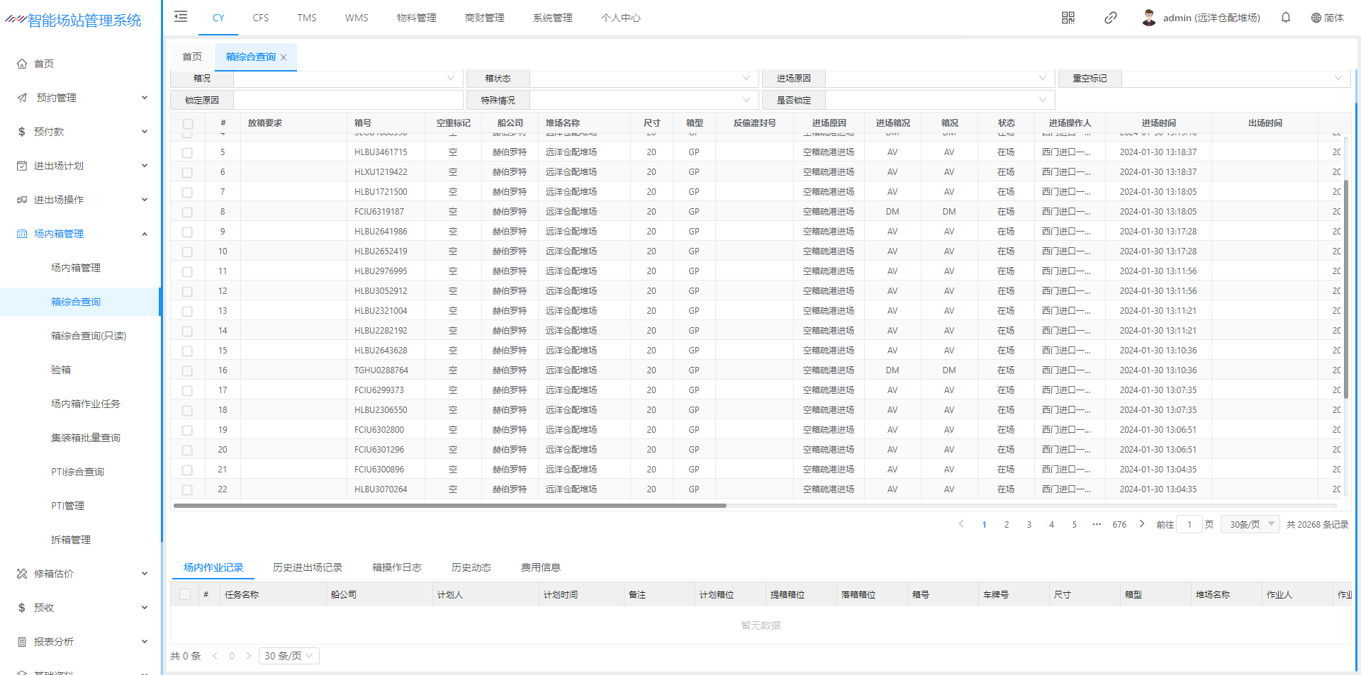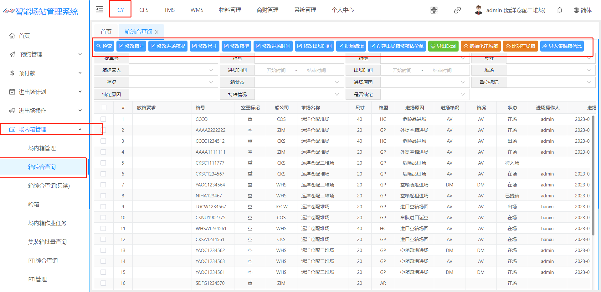 查看所有箱信息,修改箱信息。 注:选择一条数据双击“箱号”,可以打开任务详情</span>  1. 检索:可以根据以下条件检索你需要找的箱信息。 2. 修改箱号:选择一条箱数据修改箱号。 3. 修改进场箱况:选择一条箱数据修改进场箱况。 4. 修改尺寸:修改箱子的尺寸大小。 5. 修改箱型。 6. 修改进场时间:修改箱的进场时间。 7. 修改出场时间:修改箱的出场时间。 8. 批量编辑:批量修改合同号、批量修改特殊情况、批量修改车辆信息、批量修改重量信息、批量修改制造时间、批量修改冷箱机型、批量修改放箱要求。 9. 创建出场箱修箱股价单。 10. 导出Excel:把数据导出成为Excel格式。</span>  场内箱作业记录: