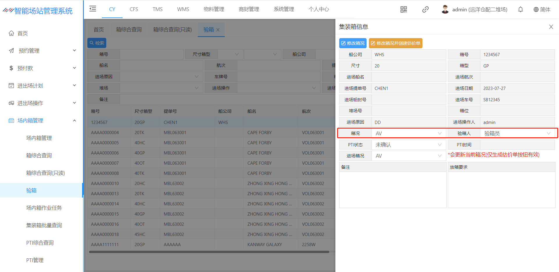 修改箱子箱况 注:选择一条数据双击“箱号”,可以打开任务详情  箱子进场前要验箱,验箱之后根据箱子的状态来改变该箱的箱况。 双击需要修改箱况的箱信息,然后根据验箱的情况来对红框框起来的信息进行修改 修改箱况:仅修改集装箱场内箱箱况信息 不会产生其他信息 修改箱况创建估价单:当集装箱箱况选择DM,点击【修改箱况创建估价单】会额外产生修改估价单