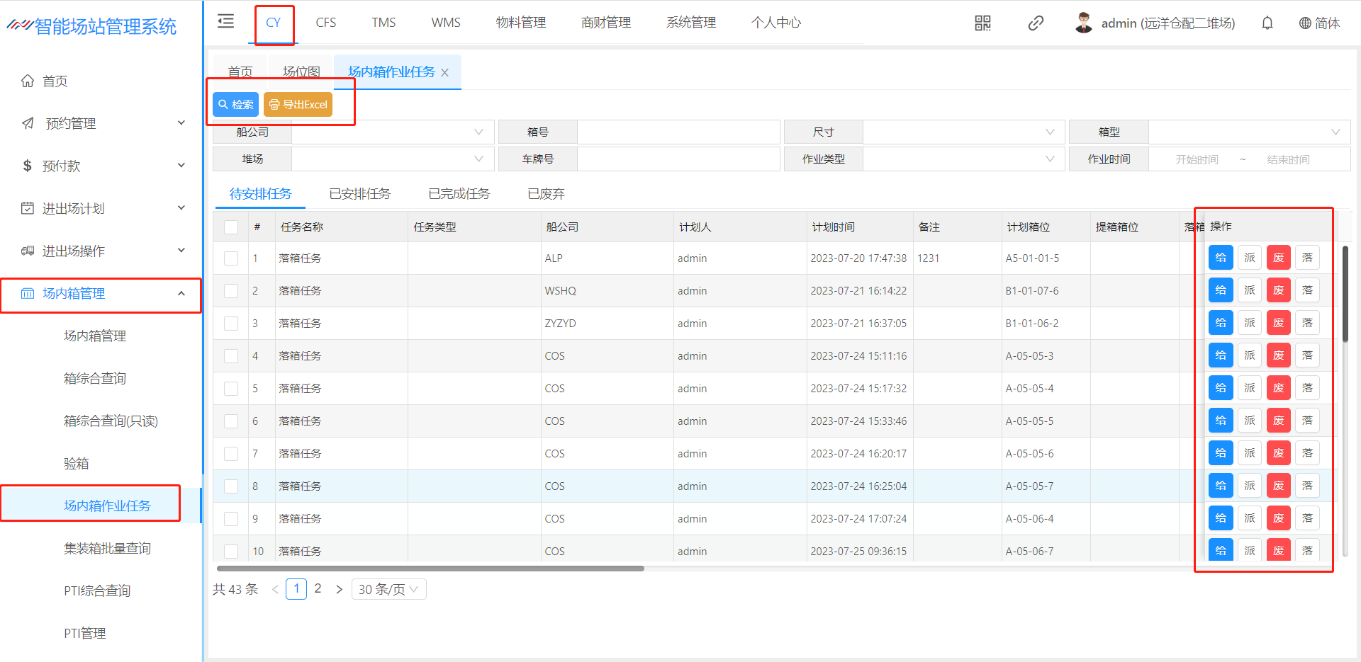寻:寻箱,寻找集装箱位置 给:重新指派集装箱 派:指派一个车 落:落箱,将箱子落在指定位置 提:提箱,将箱子从位置提走 检索:查询任务 导出Excel:导出为Excel表格