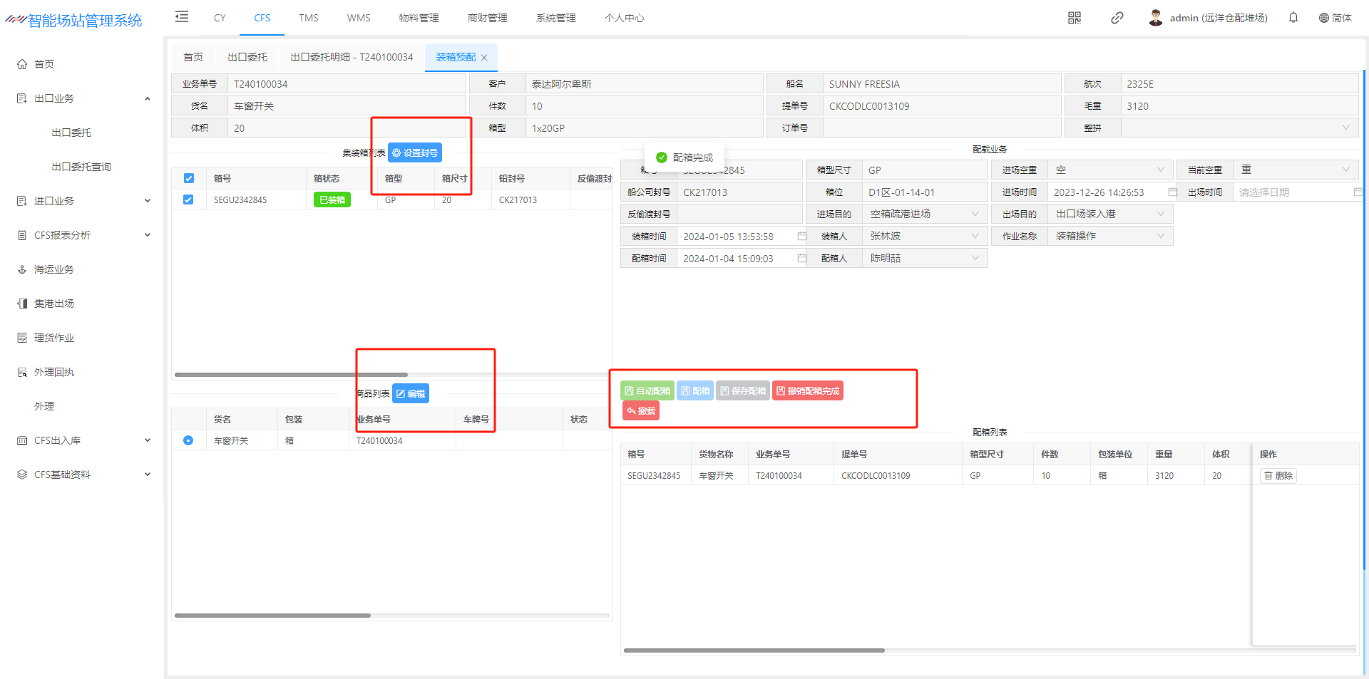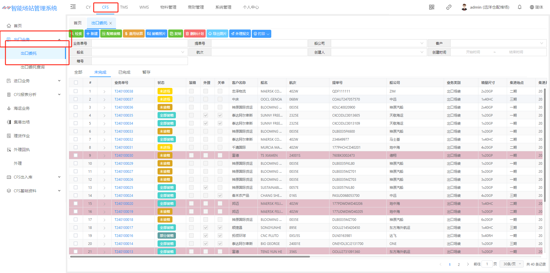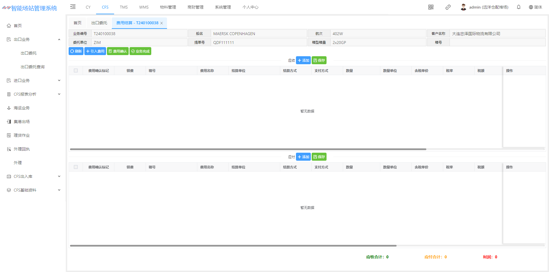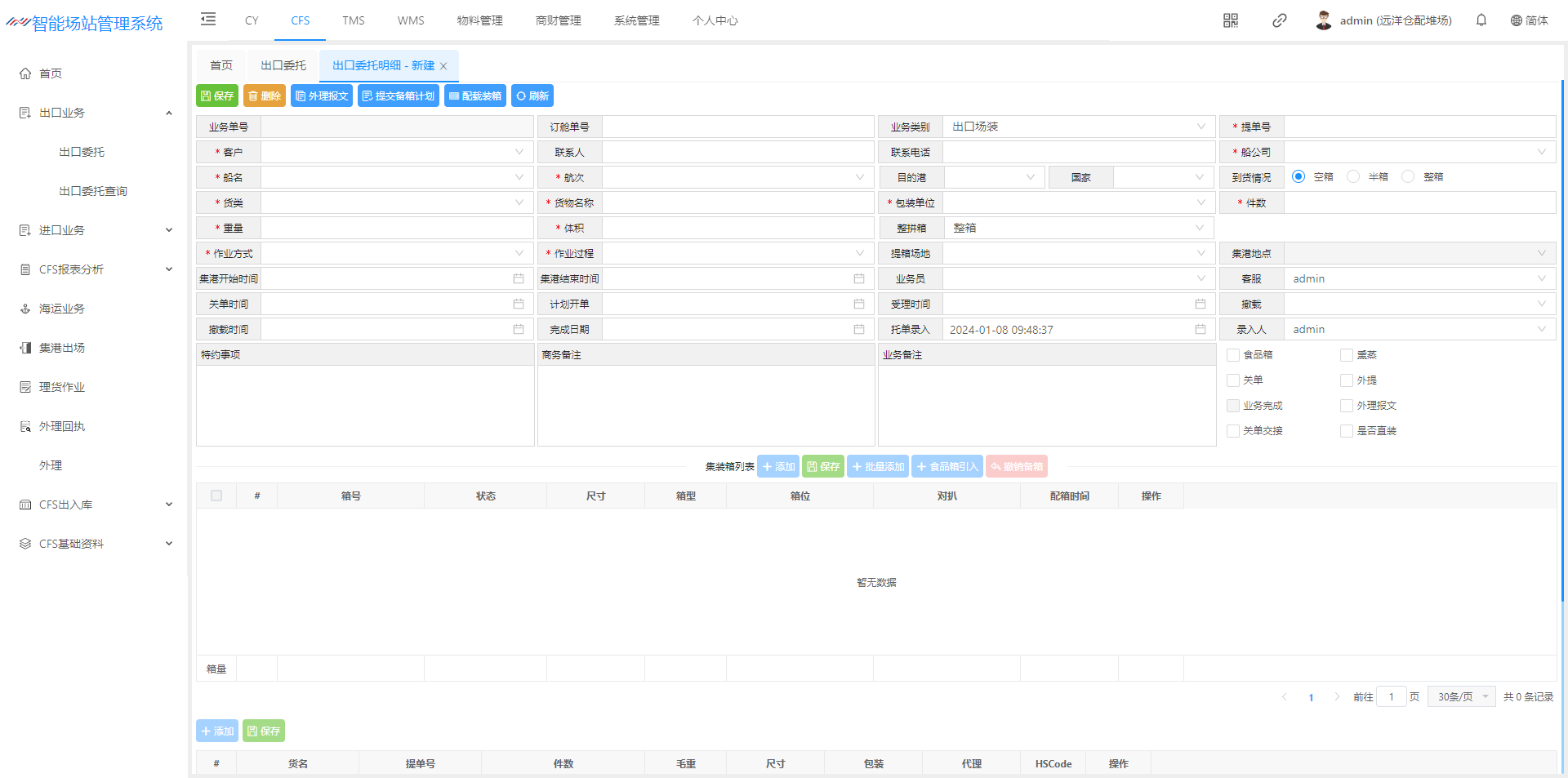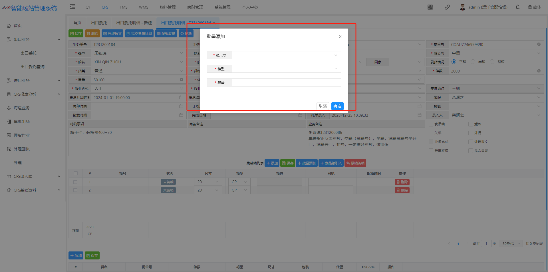 ## 1. 列表功能介绍: 分类:列表分为四类:全部,未完成,已完成、暂存(默认选择的为未完成) 检索:可以按业务单号、提单号、客户、箱公司、船名、航次、进场时间检索。 配载装箱:进入配置装箱详情页面 费用结算:输入应收应付的费用 装箱照片:查看装箱理货时所拍摄的照片 导出照片:导出下载理货装箱时所拍摄的照片 外理报文:发送外理报文 打印:理货装箱单、理货装箱小票 箱封号:导出入港清单Excel、导出箱号和封号Excel、入港清单TXT、导出费用明细  ## 2. 出口委托详新建情页面。  1) 详情页 红色星号代表必填项 保存:保存出口委托,保存后该出口委托状态为暂存。 删除:删除出口委托。 外理报文:发送外理 配置载装箱:进入配置装箱详情页面进行箱子的配载操作 刷新:刷新页面 2) 集装箱列表 添加:添加一个不带集装箱箱号的箱子 保存:保存不带集装箱箱号的箱子信息 批量添加:输入箱型尺寸箱量即可添加  食品箱引入:若是提前做好食品箱检验,并且已经提交了,可以跟食品箱检验的提单号,在出口委托录入,会带出对应的箱号 3)配载装箱 设置封号:录入铅封号 商品列表编辑:进入会编辑商品的体积、重量、件数 自动配箱:自动分配箱子的重量、体积、件数 确认配箱:会发出装箱任务 也会发送EDI空箱出场的;若所备的箱子进场EDI没有发送则确认配箱也不会发送EDI 确认用箱(暂不发送EDI):点击之后会发出装箱任务 也会发送EDI空箱出场的但是任务会标记“暂不发送EDI”;若所备的箱子进场EDI没有发送则确认配箱也不会发送EDI 撤载:箱子撤载,并且发出一个EDI空箱进场的EDI;若所备的箱子进场EDI没有发送,则撤载也不会发送EDI  ## 3. 出口委托费用结算 (1) 点击上方应付添加,添加后保存。 (2) 点击下方应收添加,添加后保存。 (3) 点击费用确认,生成到账单内,没有账单时间 (4) 点击确认收款。 (5) 业务完成,业务完结做的费用附上账单时间 :账单时间给上完结时间 (6) 补费完成,业务完结之后费用做完,少费用进行补费 费用添加流程:添加→确认→费用确认 补费流程:添加→补费费用→补费确认