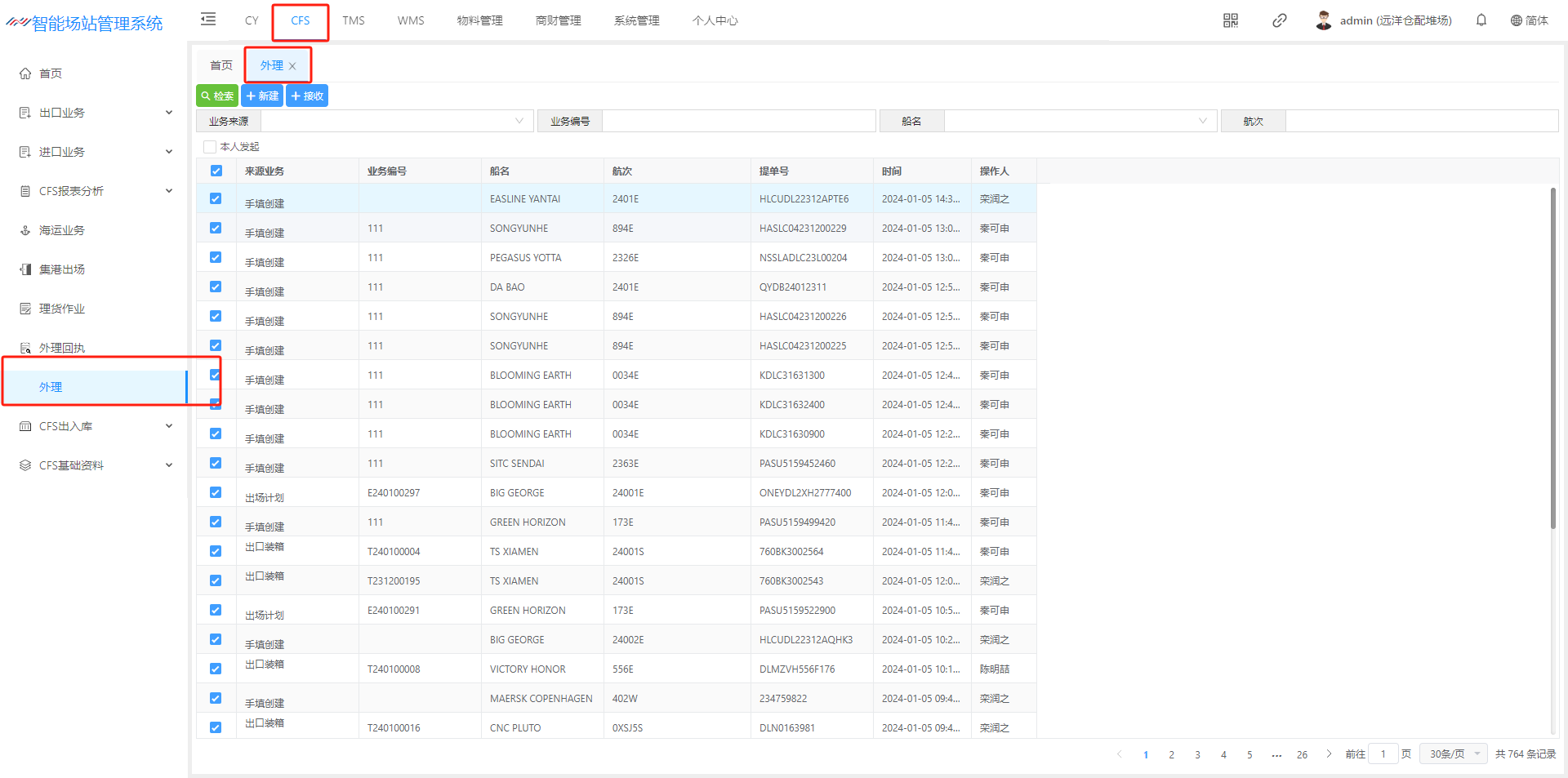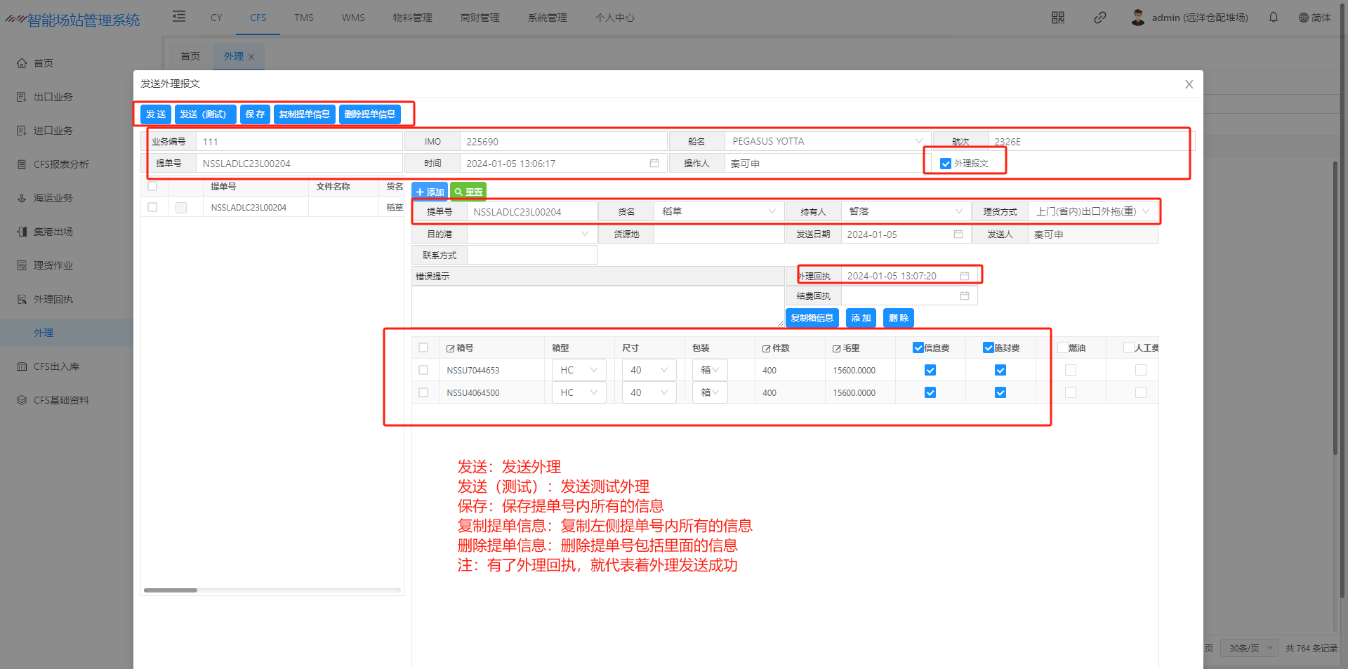 ## 列表功能介绍: 检索:可以按业务单号、提单号、客户、箱公司、船名、航次、进场时间检索。 新建:添加手动外理。进入编辑外理发送详情页面。 接受:接收外理报文回执  ## 新建外理详细界面 发送:发送外理 发送(测试):发送测试外理 保存:保存提单号内所有的信息 复制提单信息:复制左侧提单号内所有的信息 删除提单信息:删除提单号包括里面的信息 注:有了外理回执,就代表着外理发送成功