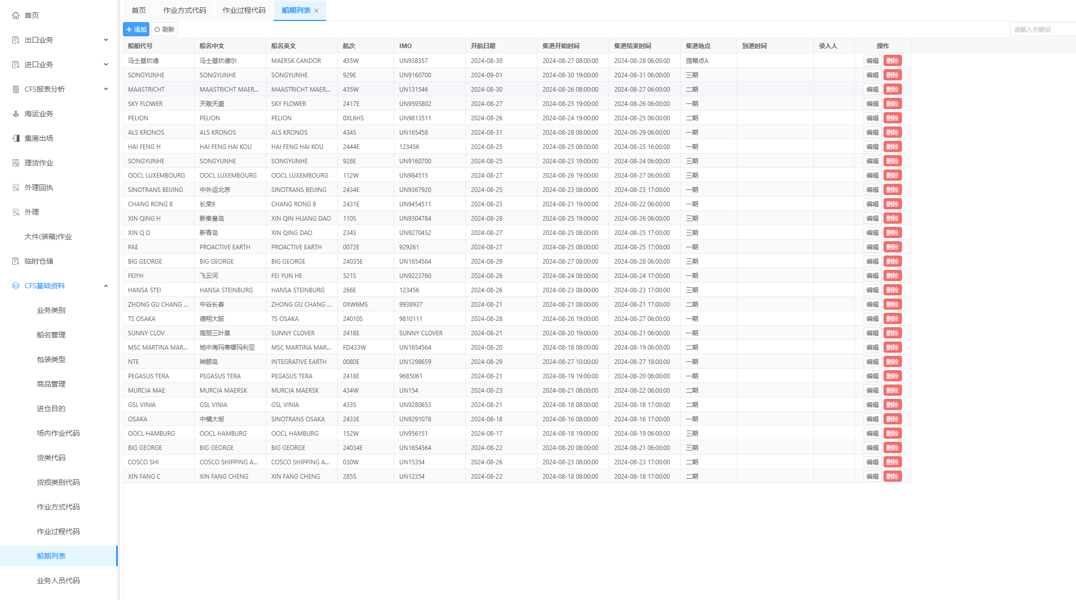 维护船期列表:船舶代号、船名中文、船名英文、航次、IMO、开航日期、集港开始时间、集港结束时间、集港地点、到港时间、录入人 维护船期之后,用于进出口委托选择