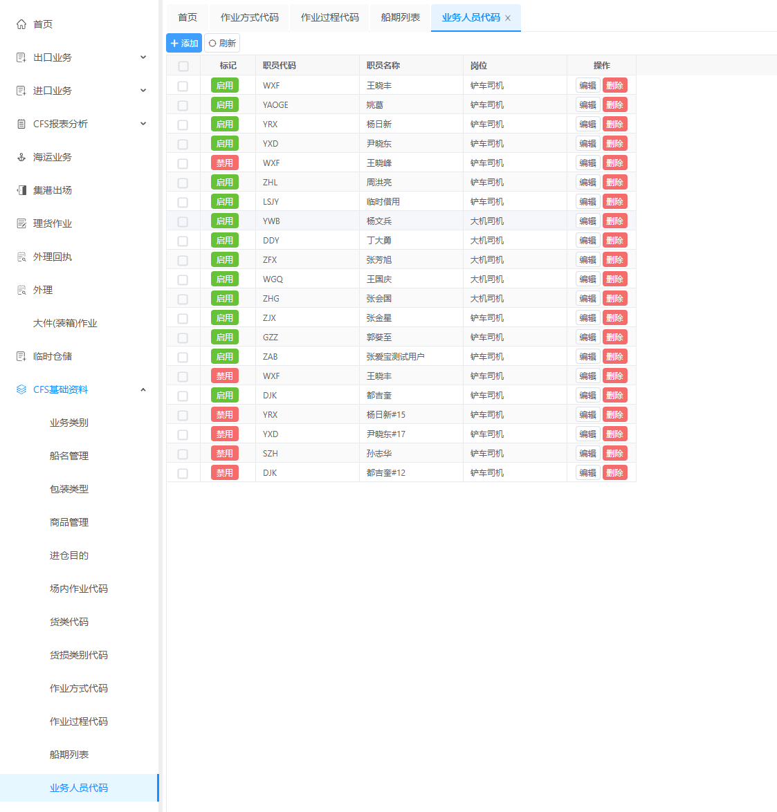 维护业务人员代码,维护之后用于补充理货作业,与大机械作业 下拉选择