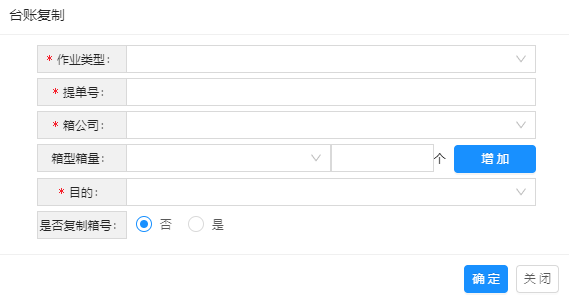 新台账中必填字段用当前页填写的值,其他值用勾选的台账的值。如果选择了“复制箱号”,同时会创建出所勾选台账中所有箱号的调度任务,且调度状态为“未调度”,可以直接对任务进行调度。