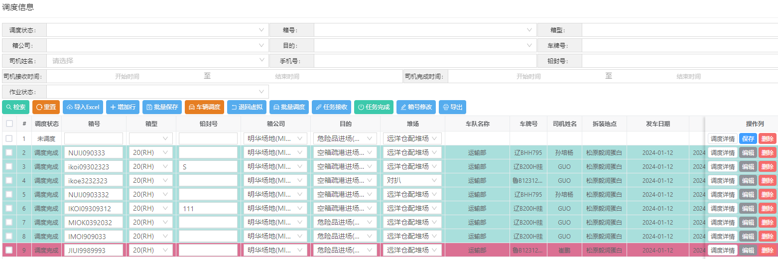 勾选对应的箱子,点击删除按钮,删除的调度无法恢复,一般在调度司机出错时,才删除。删除时,会自动删除司机对应的任务。并删除该箱子所有应收应付的费用与工资。