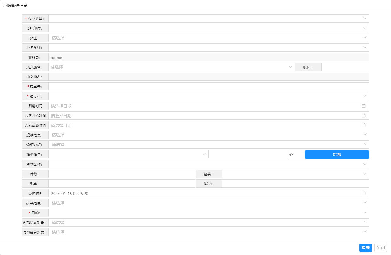 当提单信息,车辆信息,箱号信息,作业内容,都很完整且清晰时,可以在此模块下进行创建;如果作业任务不清楚,缺少提单信息,箱号信息等时,需要到“司机回填”(虚拟台账)页面进行创建,并进行任务调度的工作。等所有信息明确后,手工转到台账管理模块即可。)