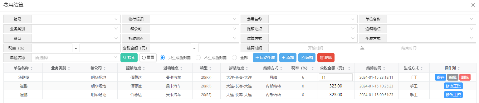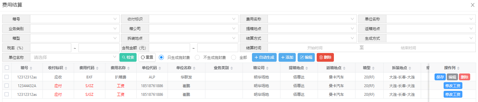 点击业务台账中的该按钮,进入费用结算页面,在该页面可以选择各结算单位,对结算单位,根据费率本进行费用生成,也可以手动添加费用,手动修改司机工资。
