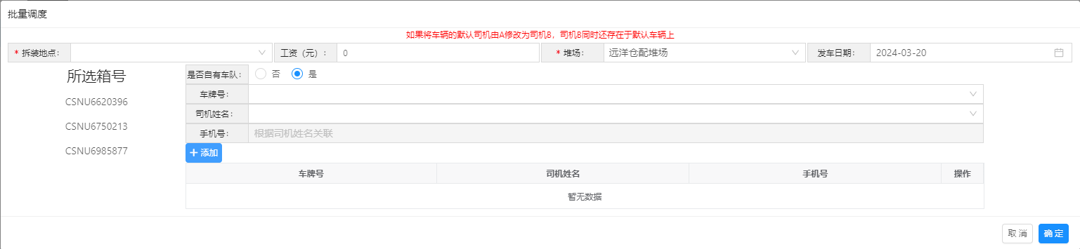 是否自有车队选择“是”,只能选择自有车牌号与司机信息(参考TMS基础资料)。选择车牌号后,系统自动带出车型,以及该车的默认司机与电话,默认司机如果不合适,可以手动选择其他司机。