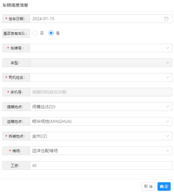 是否自有车队选择“是”,只能选择自有车牌号与司机信息(参考TMS基础资料)。选择车牌号后,系统自动带出车型,以及该车的默认司机与电话,默认司机如果不合适,可以手动选择其他司机。