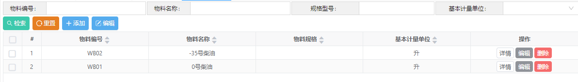 点击物料管理进入该页面可以添加、编辑、删除物料