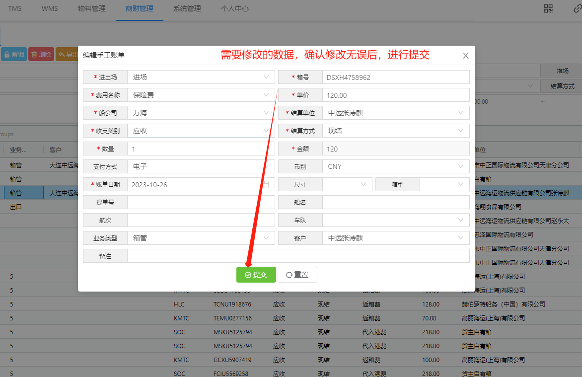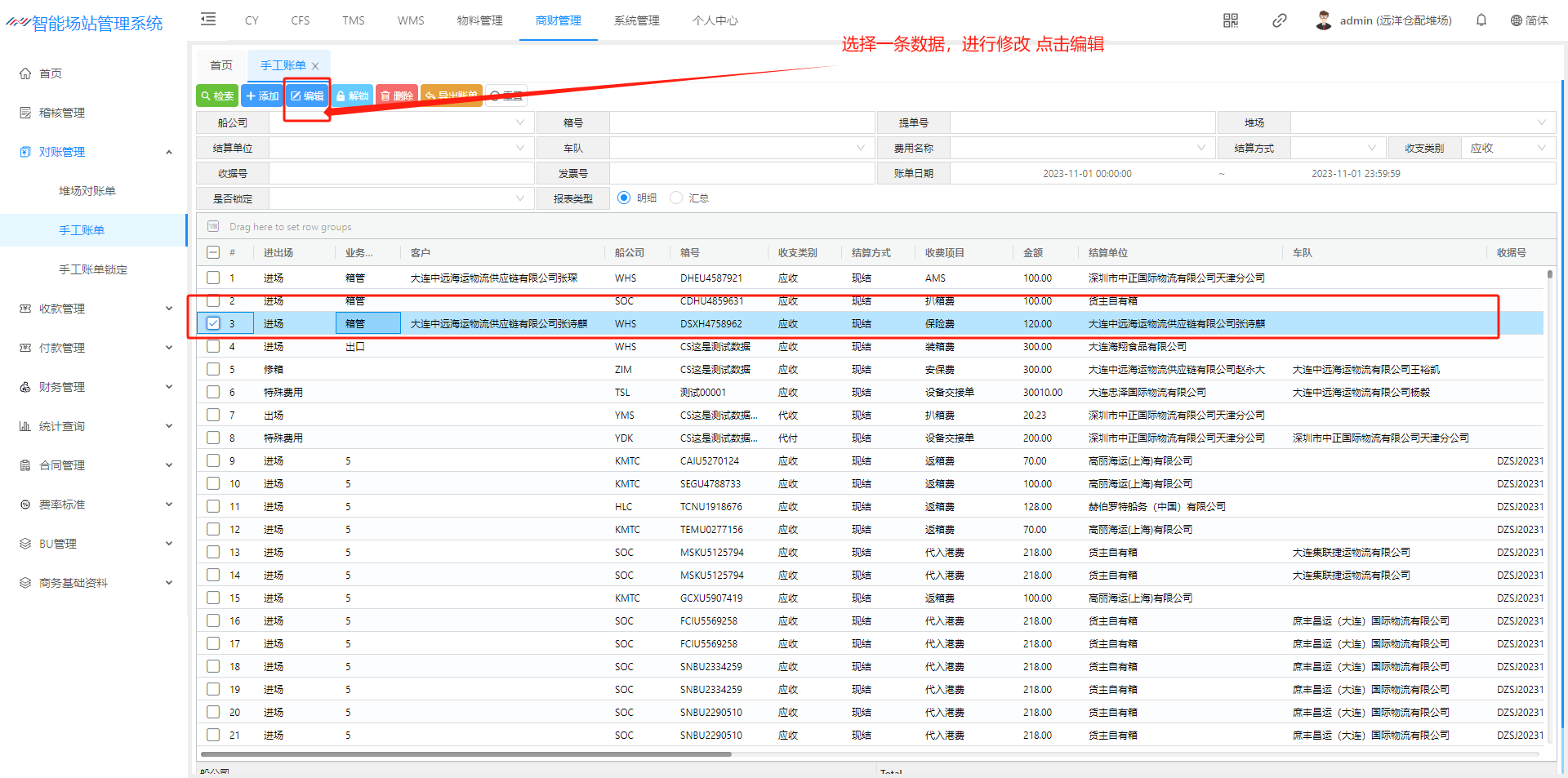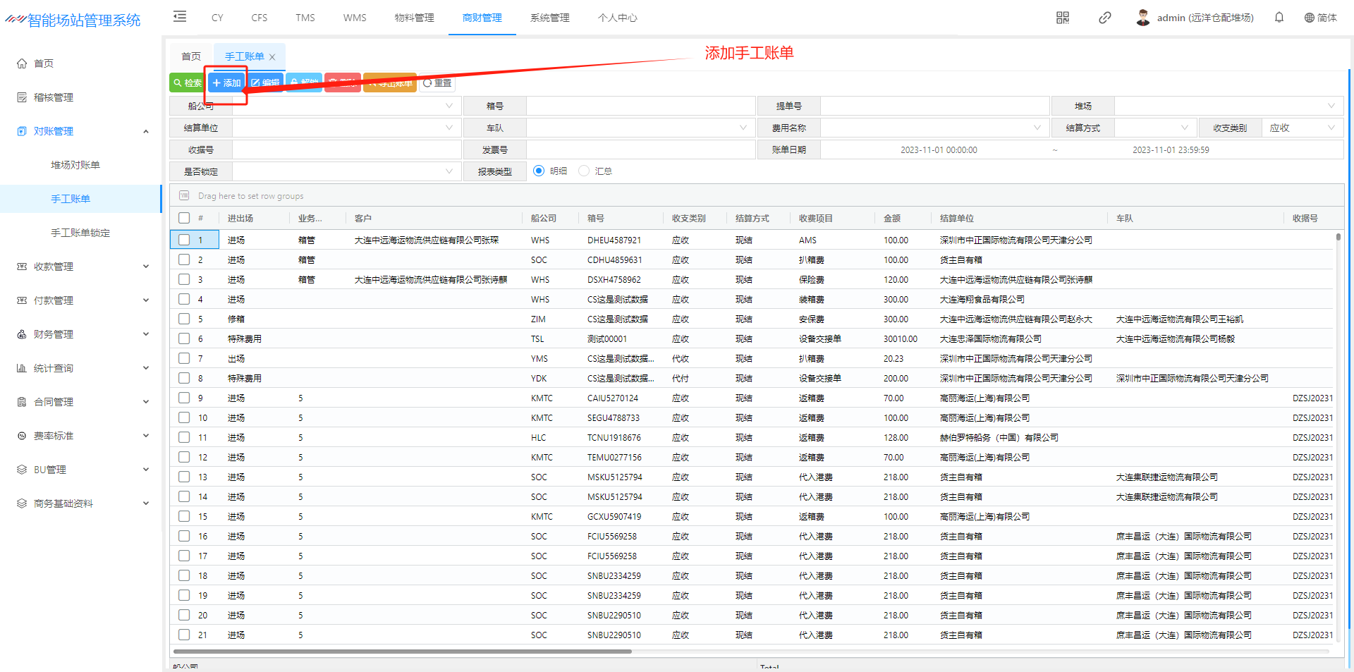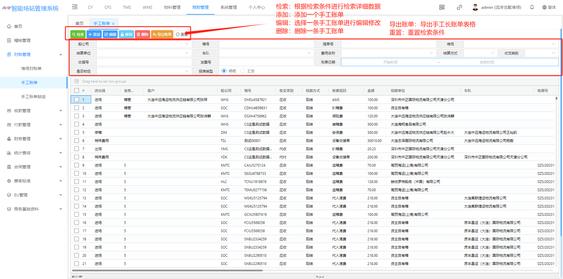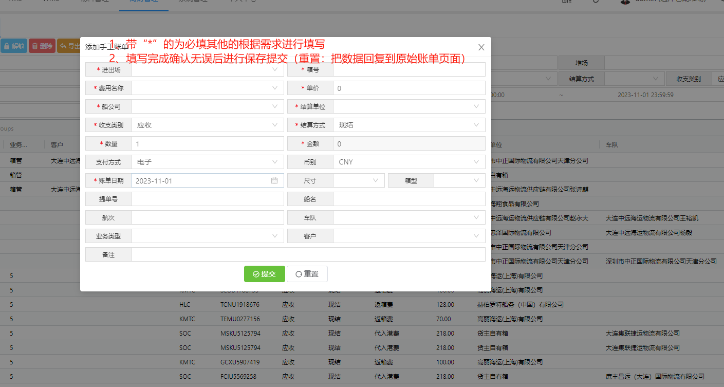 ## 列表介绍 检索:根据检索条件进行检索详细数据 添加:添加一个手工账单 编辑:选择一条手工账单进行编辑修改 删除:删除一条手工账单 导出账单: 导出手工长账单表格重置:重置检索条件  ## 新增手工账单  1、带“*” 为必填其他的根据需求进行填写 2、填写完成确认无误后进行保存提交(重置:数据回复到原始账单页面)  ## 修改手工账单
