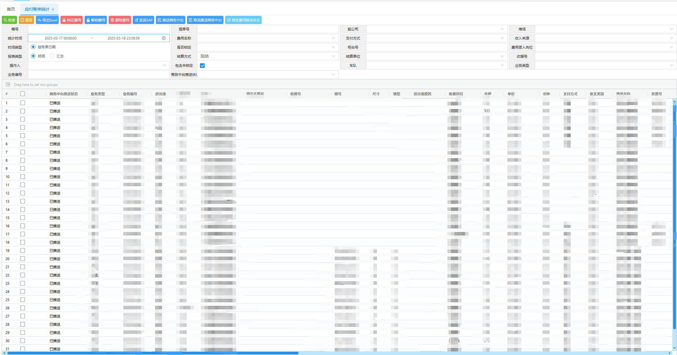 查询所有应付账单统计 检索:检索按照以查询条件 重置:重置查询信息 导出Excel:按照查询信息导出excel 锁定费用:锁定账单,锁定的账单信息不能删除 解锁费用:解锁费用信息 删除费用:删除账单 发送SAP:选择账单信息向SAP发生 推送商务中台:选择账单费用向商务中台推送信息 取消推送商务中台:选择账单从商务中台撤回费用 修改费用推送状态:修改账单推送状态 推送状态:已推送、未推送、已取消、推送失败、已推送负数费用(不用)、待重新推送、不推送商务中台 已推送:已经推送商务中台的账单信息 未推送:准备推送商务中台信息 已取消:已经从中台撤回的费用信息 推送失败:推送失败的商务中台信息 待重新推送:推送失败重新变为待重新推送的信息 不推送商务中台:修改费用不推送商务中台