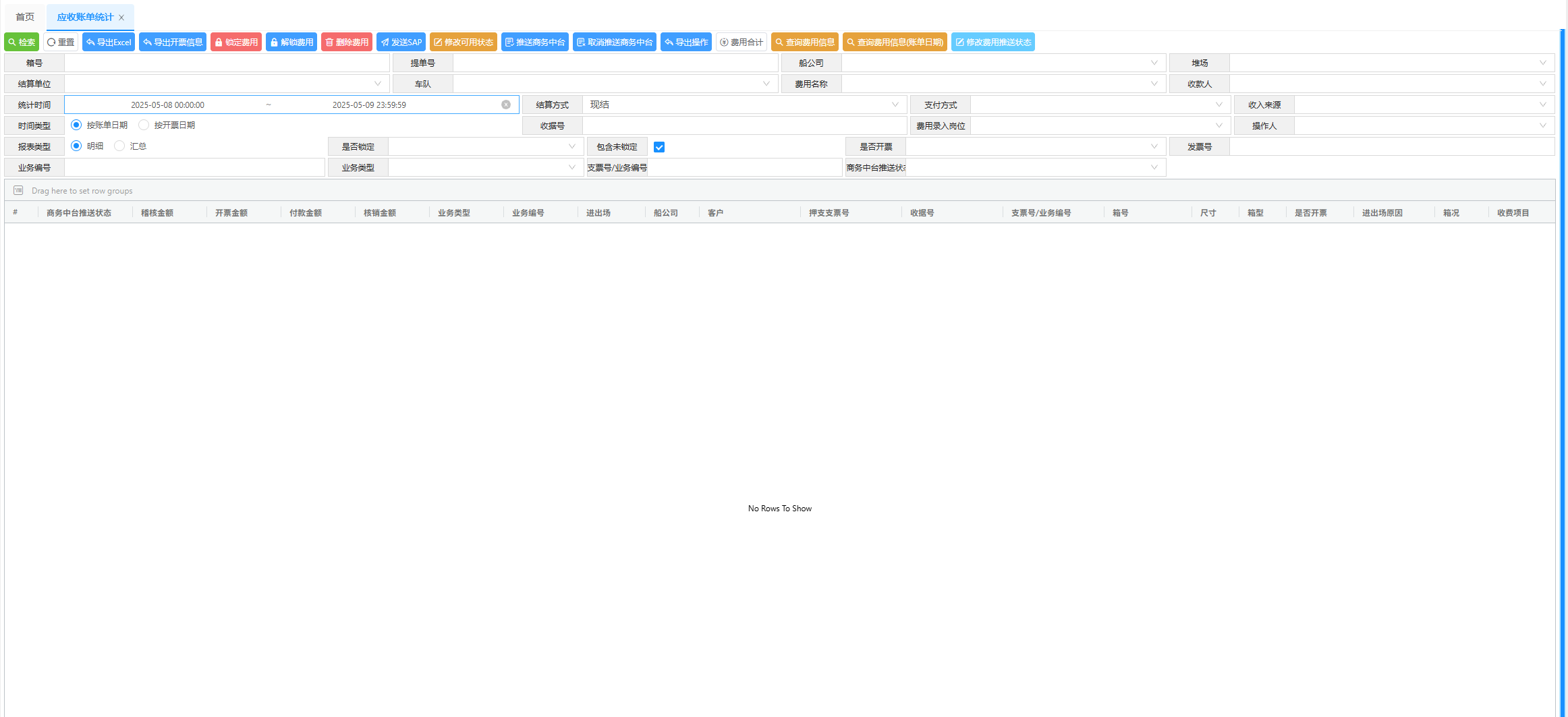 查询所有应收账单信息 检索:查询所有应收账单信息 重置:重新检索信息 导出Excel:导出excel 修改可用状态:修改可用状态,账单修改可用账单状态之后,举例:提单号A下有300块钱100块钱标记为“不可用”, 剩余200块钱用于冲抵 导出操作:按照船公司导出集装箱修箱的费用 费用合计:选择账单信息自动求和 汇总表格:所有应收账单求和信息 账单操作日志:查询中台推送日志