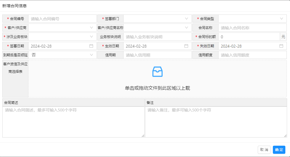 1、新增:点击新增按钮,弹出新增页面,填写合同信息。其中“失效日期”属性,系统会在该失效日期前一个月用橙黄色显示,失效日期前一周用红色显示,有顺延的失效到期前用绿色提示。并会根据该日期进行失效期1个月与1周的邮件发送。