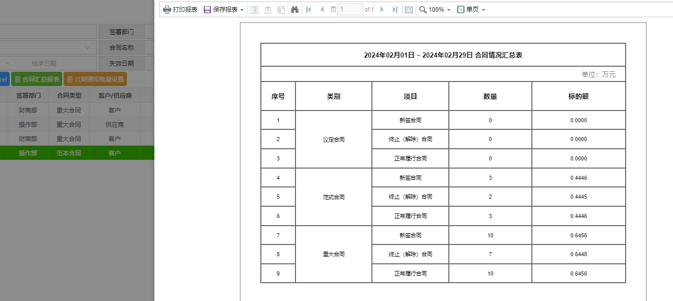 3、合同汇总报表:点击该按钮,会根据当前检索条件导出以下统计报表。