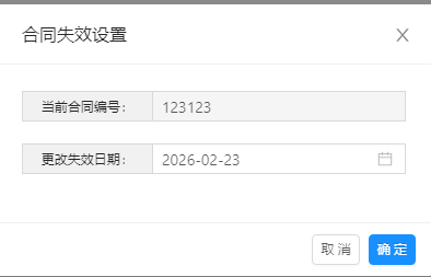 2、失效:点击操作列该按钮,可以修改失效日期,修改该日期后,系统会根据新的日期进行计算,将合同状态更新为“正常”或“终止”。