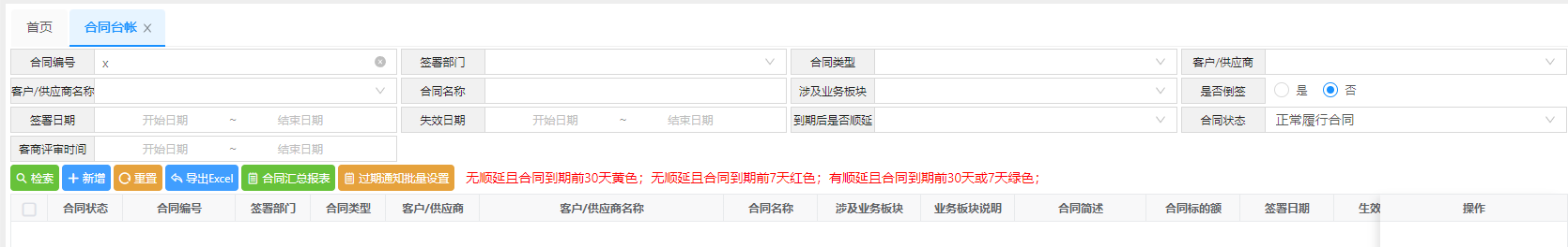 该页面主要用于管理客户合同,并可以对合同到期进行提醒。页面默认显示未失效合同,如果需要查看失效合同,根据检索条件中的“合同状态”选择,并进行检索即可。可以点击【导出Excel】,根据页面检索条件,将列表中的数据导出到Excel文件中。
