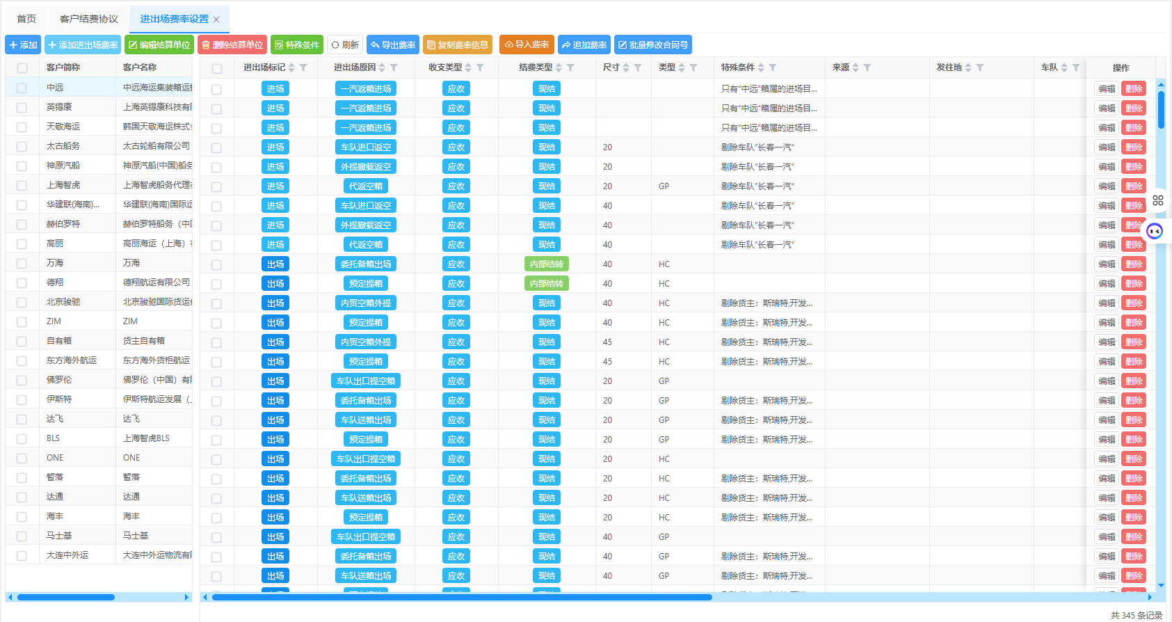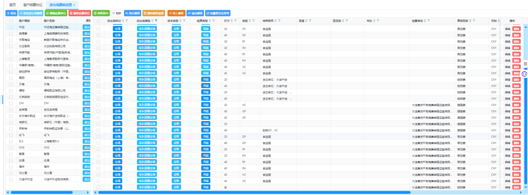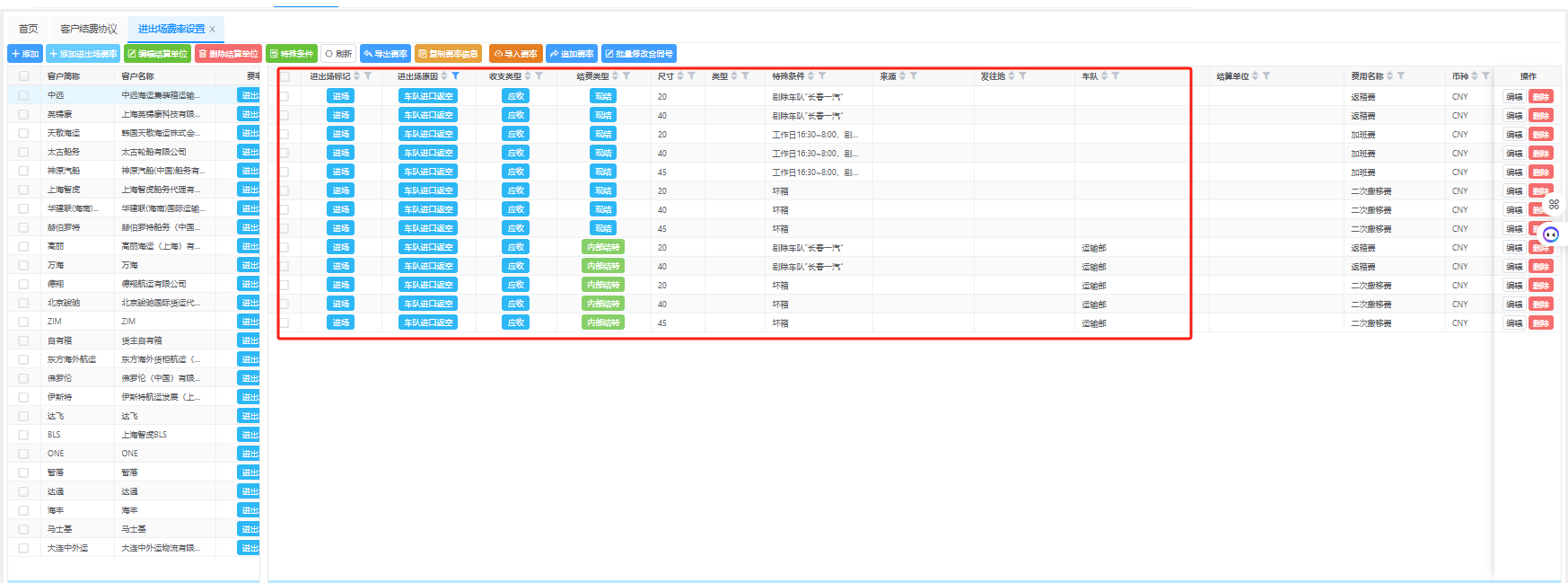 ## 按钮介绍 添加: 添加一个船公司 添加进出场费率: 选择一个船公司点击添加进出场费率,进行填写 编辑结算单位: 选择一个船公司,点击编辑结算单位,进行修改船公司 删除结算单位: 选择一个客户,点击删除船公司,里面是没有维护费率才能删除 特殊条件,查看特殊条件 (里面有增加特殊条件) 刷新: 刷新页面 导出费率:导出费率生产表格,可以进行选择 复制费率信息: 选中费率点击复制费率信息,选择船公司将选择费率复制到选择船公司下 导入费率: 用表格批量导入费率 追加费率:按照模板导入插入费率 批量修改合同号:选择费率批量修改合同号  操作说明 添加船公司→添加进场费率 逻辑说明 例: 1、车队进口返空 当有一个返箱计划进场登记时,会先判断任务内的原因是否有与费率本能匹配上,在根据结费费率去匹配(匹配到现结按照现结的费率生成(像是疏港除外)),判断箱子的箱型尺寸(20尺生成20尺的费率) 判断特殊条件(验箱验出的箱况是否是好坏箱 坏箱匹配到特殊费率生成二次搬移费 好箱不生成)判断车队(若是车队有符合的按照车队符合的生成),以上判断只要匹配上便能生成  2、车队送箱出场(激发环渤海) 当有一个提箱计划进场登记时,会先判断任务内的原因+结算单位(是否是激发环渤海,不是激发环渤海按照标准费率生成,是激发环渤海按照激发环渤海生成 150一车+月结提箱费+按照船公司不一致生成应付船公司的费用)+当前车是否是单备还是双背(单备生成一车的费用,双背 一个车的费用➗2)是否有与费率本能匹配上,在根据结费费率去匹配(匹配到月结按照月结的费率生成),判断箱子的箱型尺寸(20尺生成20尺的费率) 判断特殊条件(是否是食品箱,是食品箱要额外带出商检费用)判断车队(若是车队有符合的按照车队符合的生成)判断结算单位(是否是激发环渤海) 以上判断只要匹配上便能生成