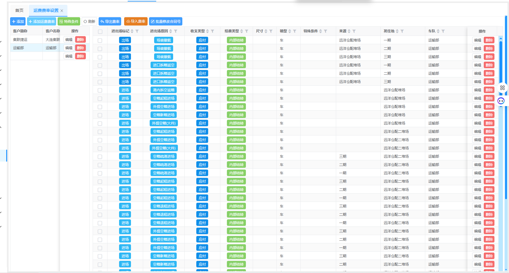 ## 按钮介绍 添加: 添加一个车队 添加进费费率: 选择一个车队点击添加进出场费率,进行填写 特殊条件,查看特殊条件 (里面有增加特殊条件) 刷新: 刷新页面 导出费率:导出费率生产表格,可以进行选择 导入费率: 用表格批量导入费率 批量修改合同号:选择费率批量修改合同号  操作说明 添加车队→添加运费费率 逻辑说明 例: 车队运费率不同于进出口费率,进出口费率是有箱型判断 运费之有单备、双备、车、40维度 单备:车背着一个集装箱 双备:车背着两个集装箱 车:无论车备多少集装箱 都按照一车来计算 40:只要是40尺寸(剔除框架箱)按照40计算运费 1、出口场装入港 当有一个入港任务进场登记时,会先判断任务内的原因是否有运费费率可以与费率本能匹配上,在根据车队匹配(每个协议车队运费费率不一致),判断次车是是否是单双备 判断进场来源于发往第地(发往第与来源地不一致 费率生成的不一致),以上判断只要匹配上便能生成 2、空箱疏港进场 当有一个入场任务进场登记时,会先判断任务内的原因是否有运费费率可以与费率本能匹配上,在根据车队匹配(每个协议车队运费费率不一致),判断次车是是否是单双备 判断进场来源于发往第地(发往第与来源地不一致 费率生成的不一致),以上判断只要匹配上便能生成
