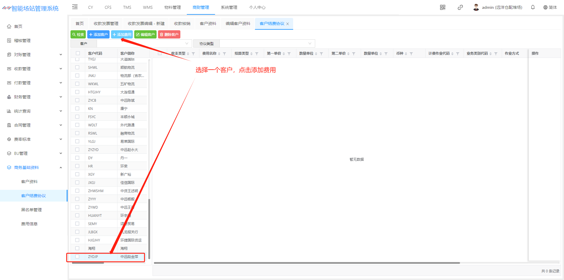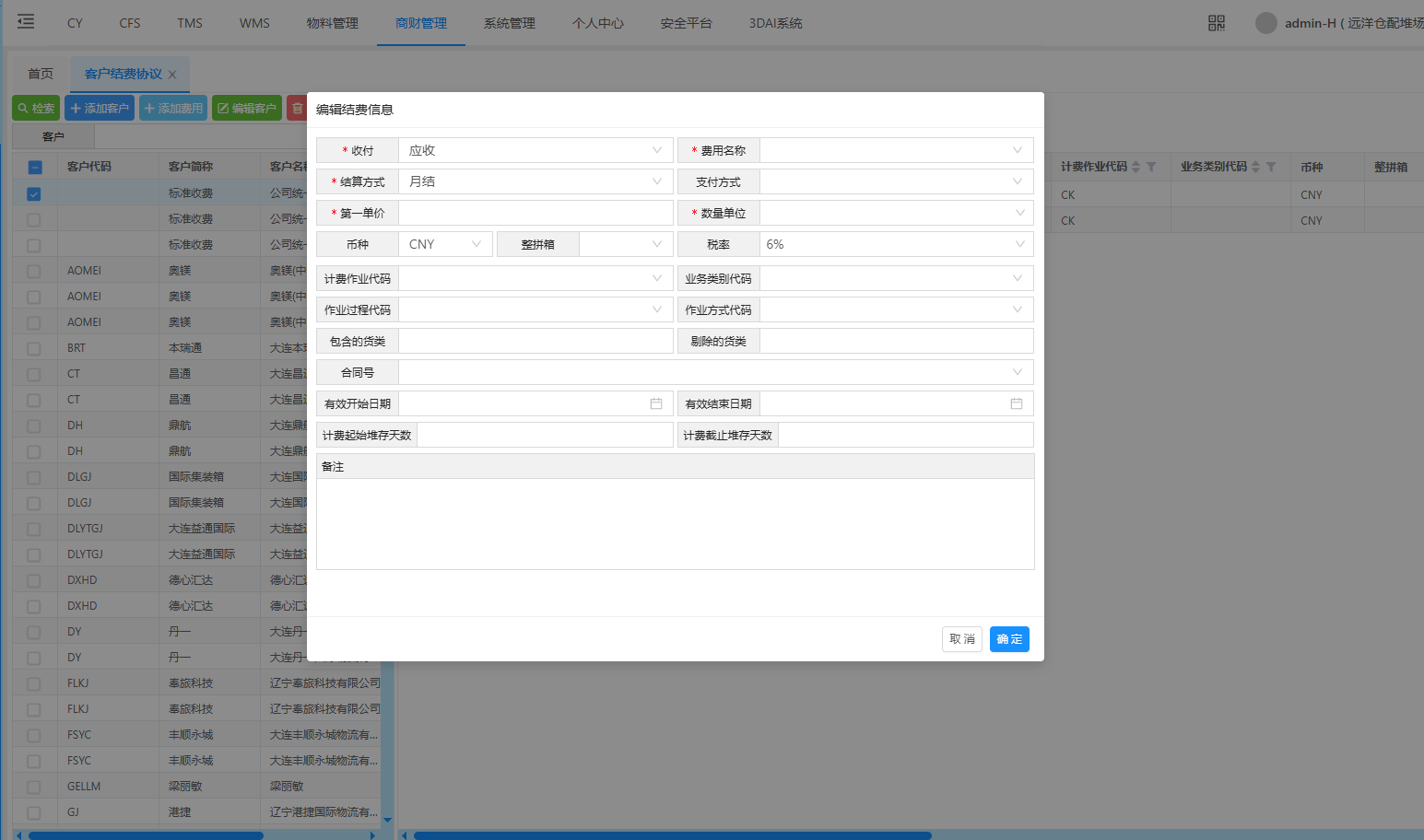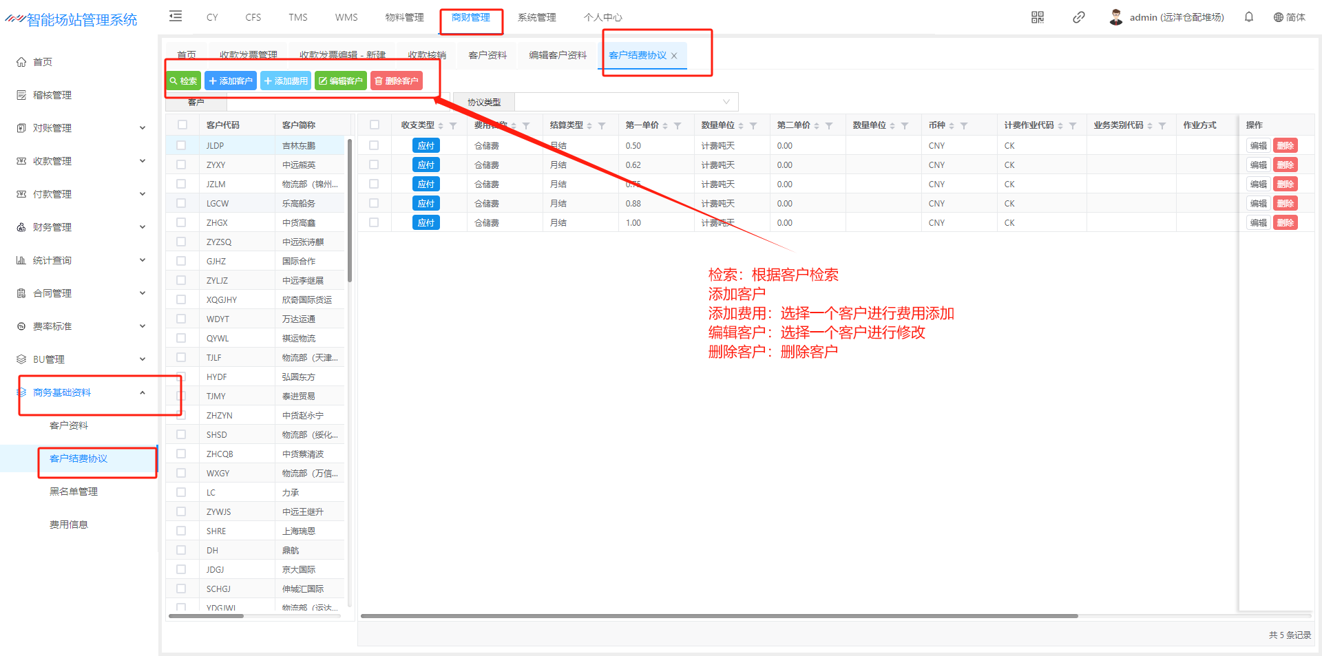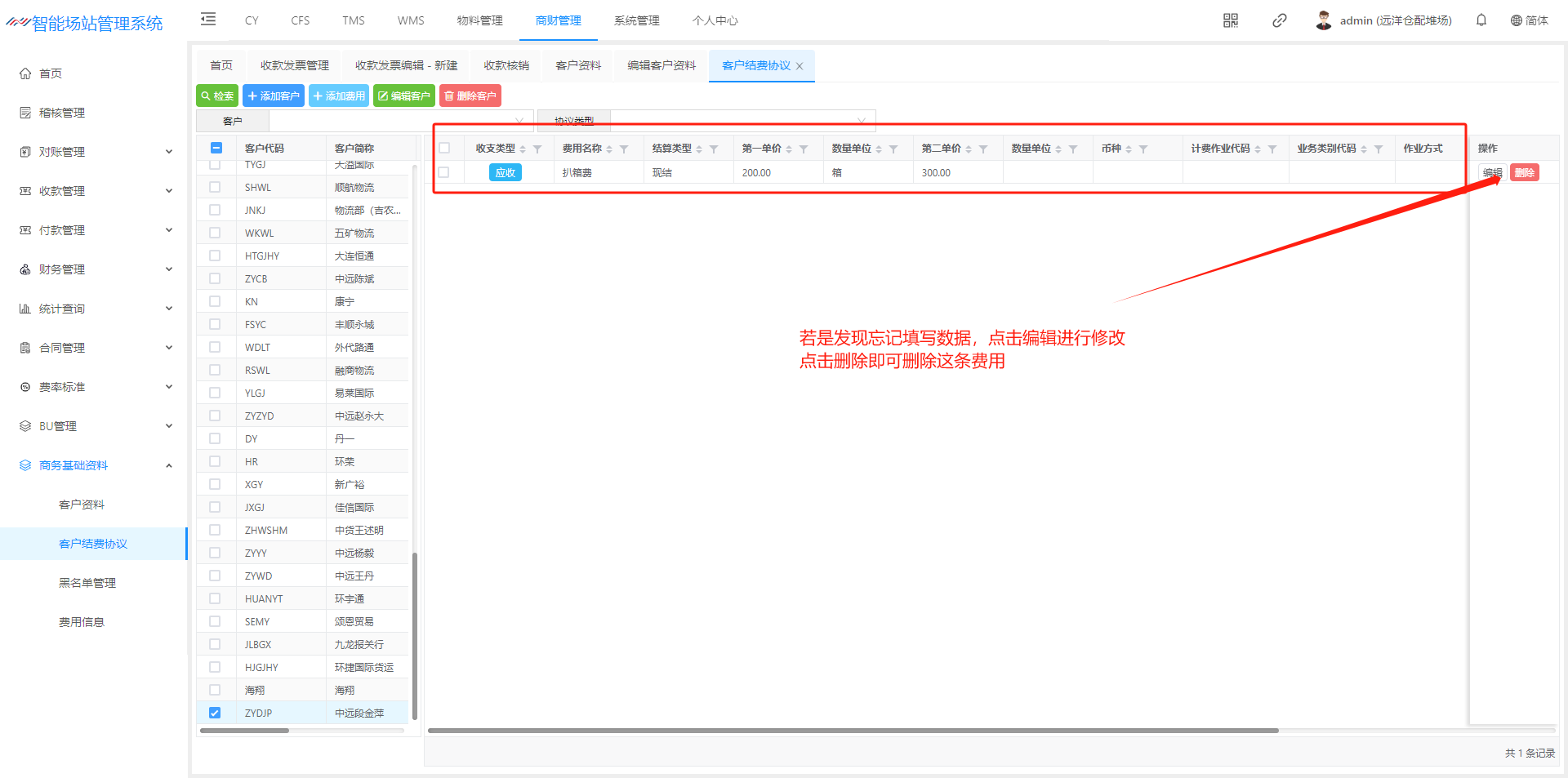 ## 页面介绍 检索: 根据客户检索添加客户 添加费用: 选择一个客户进行费用添加 编辑客户: 选择一个客户进行修改 删除客户: 删除客户  协议类型: 1、进仓业务 对应WMS入库登记,在入库登记点击【引入费用】,按照维护的客户类型+货类明细+数量单位+计费作业代码+计费的起始堆存天数+截止堆存天数 生成费用 若是计费的起始堆存天数 为10天 截止堆存天数为 0天 代表着免堆存10天从第11天开始生成费用 堆存天数按照货物进仓时间来计算第一天 2、出仓业务 对应WMS入库登记,在入出库登记点击【引入费用】,按照维护的客户类型+货类明细+数量单位+计费作业代码+计费的起始堆存天数+截止堆存天数 生成费用 若是计费的起始堆存天数 为10天 截止堆存天数为 0天 代表着免堆存10天从第11天开始生成费用 堆存天数按照货物进仓时间来计算第一天 注:在出仓业务”引出费“之前有个逻辑判断 例:若是后台记录的”上次生成月结费用“字段为2025-3-25,在4-25出库点击的引出费用,检测到时间在3-25 生成的仓储费用就按照3-25+4-25时间生成仓储费的堆存天数便是32天 3、月结仓储 对应WS仓储其他作业 在每月的账期底会查询系统内所有入库客户+客户 按照客户的货物与费率生成月结仓储的费用 4、出口业务 对应出口委托 在出口委托点击‘引入费用’按照客户+箱量生成这个客户维护的费用 5、进口业务 对应进口委托 在进口委托点击‘引入费用’按照客户+箱量生成这个客户维护的费用 ## 增加费用 选择一个客户,点击添加费用  带“*”的是必填,其他的根据需求填写  若是发现忘记填写数据,点击编辑进行修改 点击删除即可删除这条费用