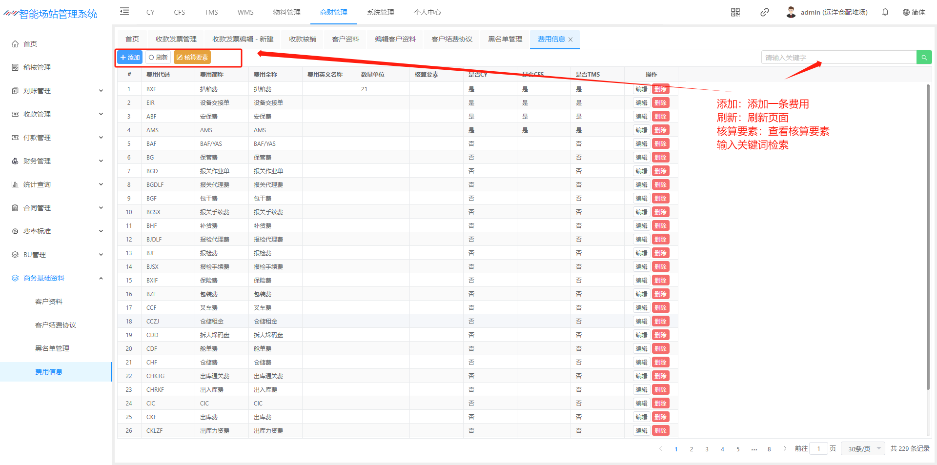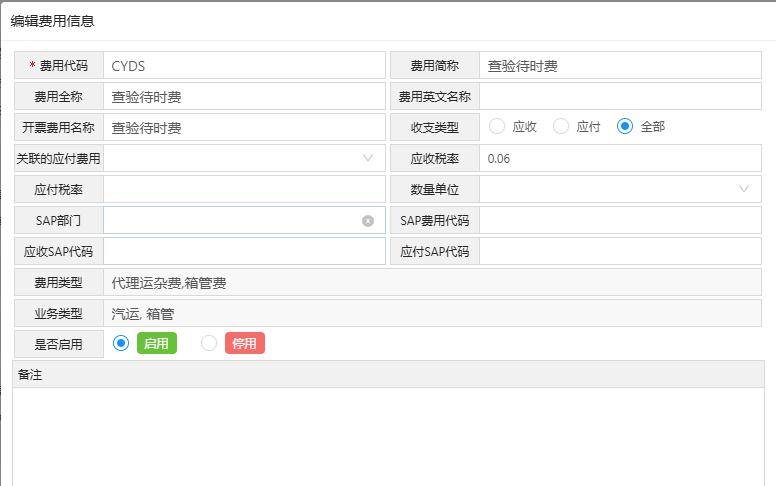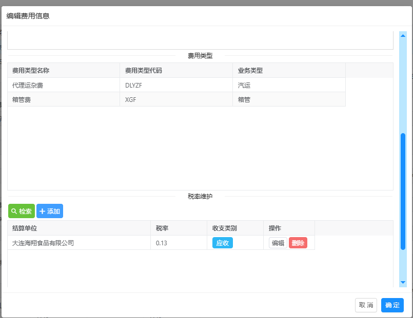 ## 页面介绍 添加:添加一条费用信息 刷新:刷新费用信息页面 费用类型:新建费用类型,维护费用类型,名称、维护费用类型代码 维护完成之后用于【费用信息映射】业务选择费用信息 让费用类型与费用信息绑定  新增费用页面 费用代码:填入费用代码 费用简称:填入费用简称 费用全称:填入费用全称 费用英文名称:输入英文名称 开票费用名称:填入开票名称 用于开票时有原本的费用名称开票,代替使用开票费用名称 收支类型:应收(勾选之后视为应收的费率,当做应收的费用时下拉选择)应付(勾选之后视为应付的费率,当做应付的费用时下拉选择) 全部(勾选之后 无论是做应收还是应付的费率都能下拉选择使用) 关联的应付费用: 应收费率