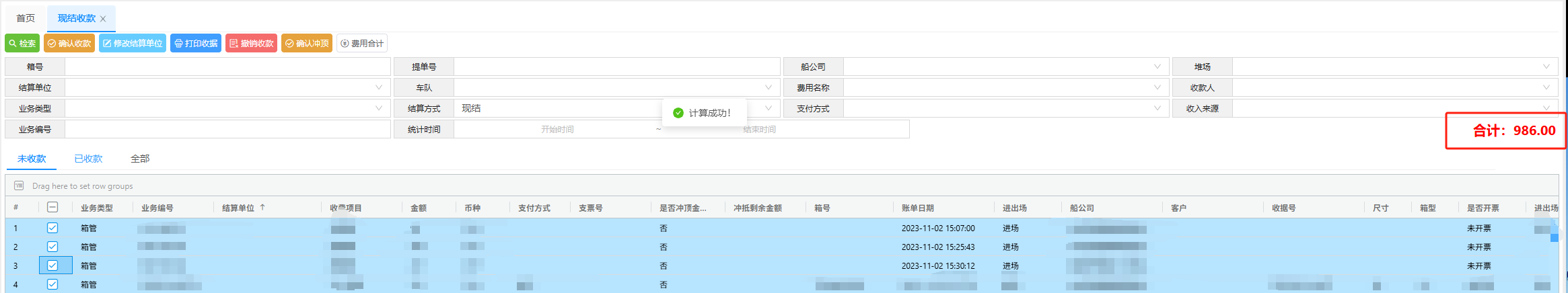 现结收款用于收取所有应收现结的费用信息,可用于支付方式 现金、电子、银行转账、支票、、电汇 按钮介绍: 检索:按照下方查询条件查询费用信息 确认收款:勾选费用费用信息点击收款,此时会弹出页面选择支付方式进行费用收取,当选择支付方式为电子时,需要扫描屏幕展示出的二维码进行缴费 修改结算单位:收费前或收取之后进行更改结算单位信息(已经推送商务中台的费用不允许修改结算单位) 打印收据:收费完成打印出现结收款收据 撤销收款:误操作之后可以进行撤销收款,会将收款人、收款时间、收据号付空将支付成功状态恢复成未收款状态 (只允许撤销手工账单、修箱及仓储的现结账单) 确认冲抵:选中费用信息点击确认冲抵,输入原业务编号进行确认冲抵 费用合计:选中费用信息中点击费用合计,会自动计算所有费用信息的金额合计