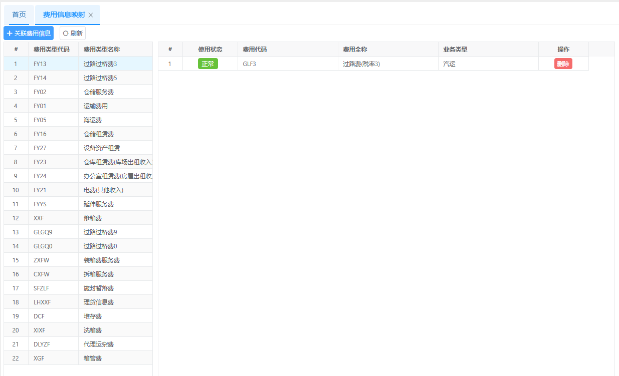 费用信息映射,用于费率维护业务类型于费用类型绑定