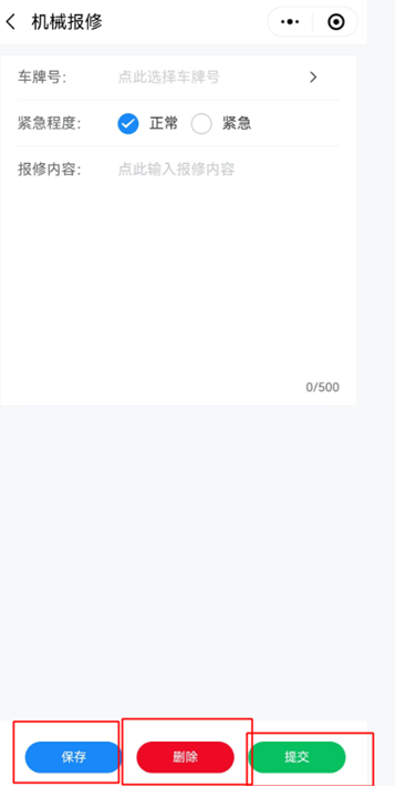 选择车牌号(来源,TMS车辆管理)选择紧急程度填写报修内容保存:暂时保存内容可以再进行编辑或删除,流程状态为:报修未提交提交:提交后不能编辑,流程状态为:维修诊断中删除:删除后无法恢复