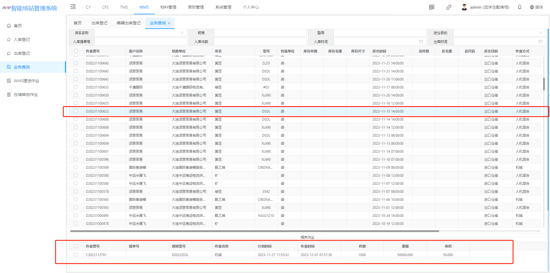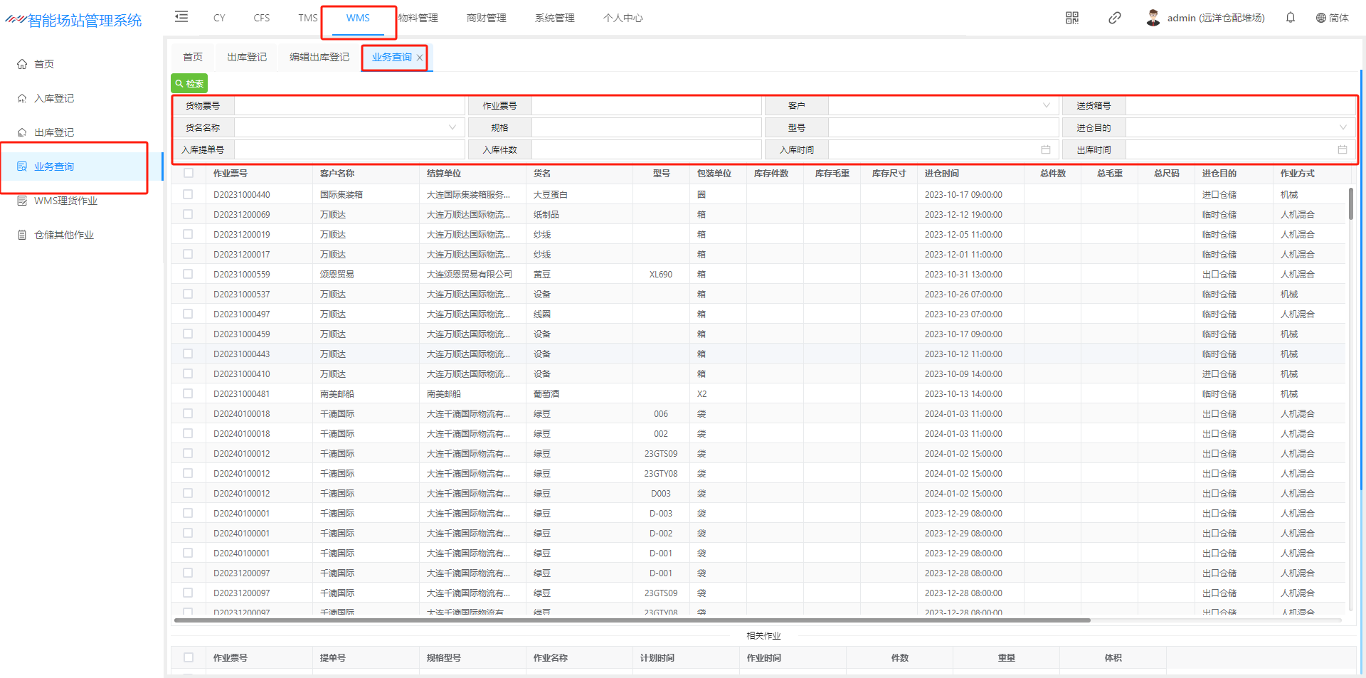 ## 列表功能介绍: 检索:可以根据货物票号、作业票号、客户、送货箱号、货名名称、规格、进仓目的等进行检索  可以单击一条入库记录“相关作业”可以带出对应的出仓记录